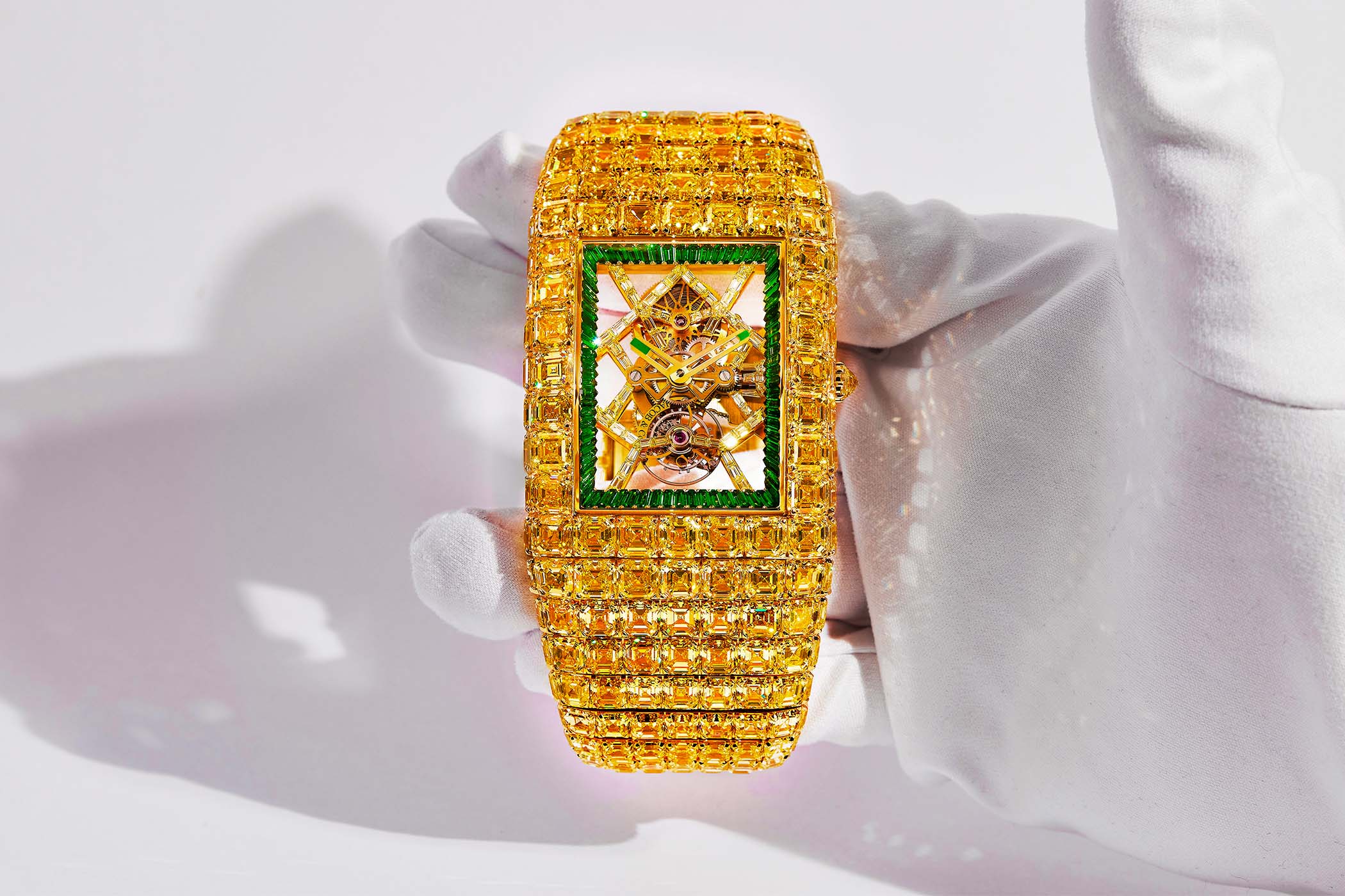 “We’ve browsed the entire world for three and a half years in search of an unprecedented number of perfect gems,” says CEO Benjamin Arabov. “We’ve gathered them here, in our Geneva headquarters, where each one was scrutinized at rough stage, at cut stage, before and after setting. The incredible work done by our gemsetters happened entirely here, in Geneva. We’ve combined our expertise in high jewelry with our skills in high watchmaking and used our drive to achieve what has never been done before. So we’ve created a unique piece that outshines every other high jewelry timepiece in opulence, exclusivity and diamond quality.”