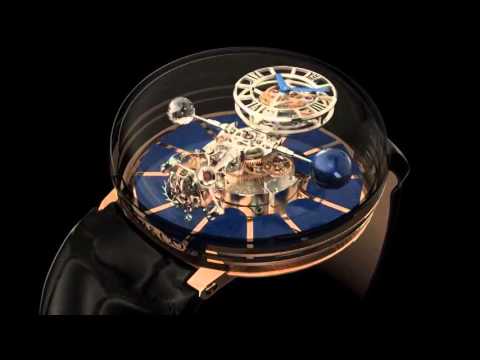 The gems surrounding the movement on the flange have specific requirements. They are to be longer and thinner so as to fit into the inner ring that connects case and movement. Since it was impossible to maintain color intensity with yellow diamonds of those dimensions, Jacob &Co. used 76 tsavorite gems.