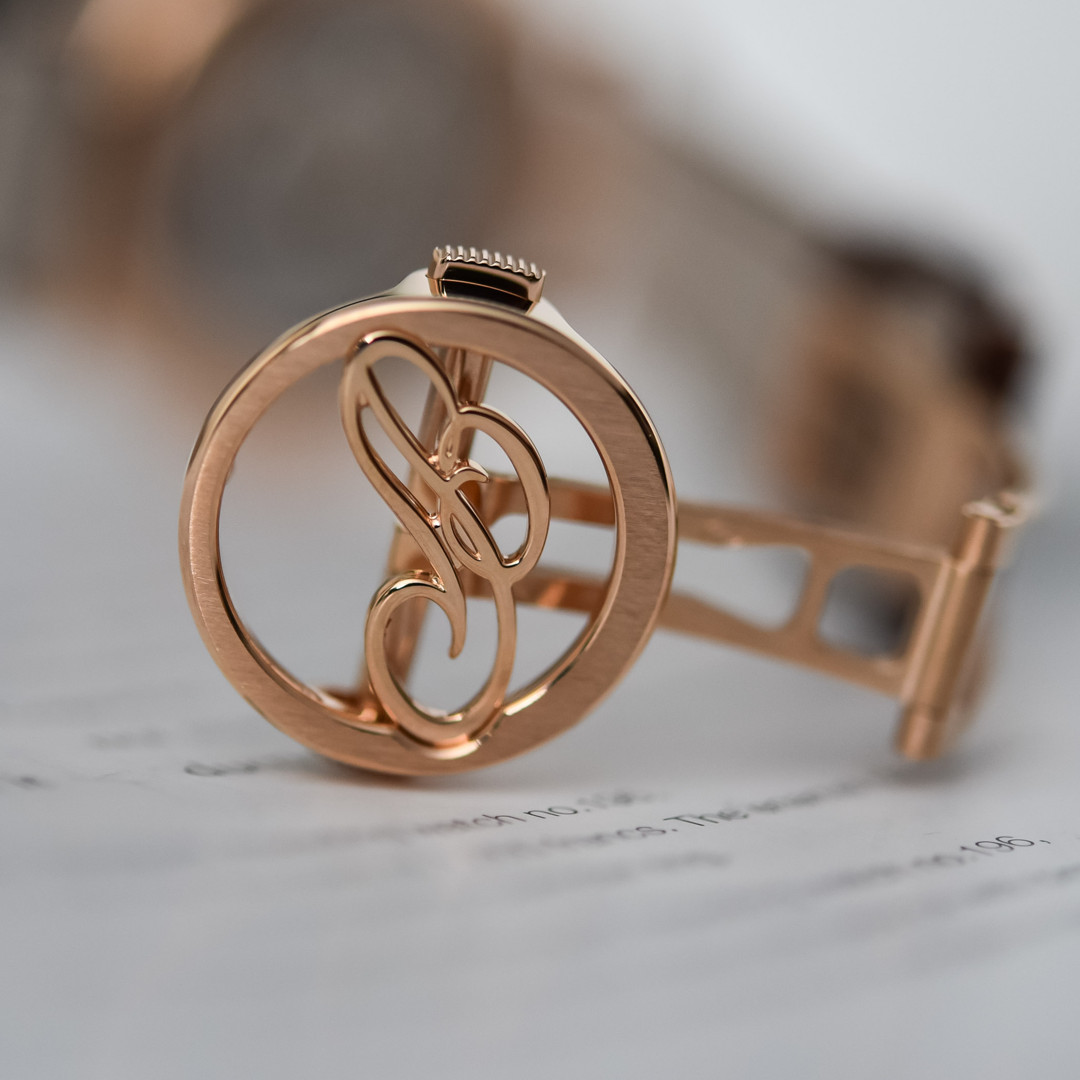 Turning the watch over, the engraved sapphire crystal caseback reveals the immaculately hand-finished automatic calibre 502.3. The hand-guilloché gold rotor is slightly off-centred, which is an original and nice touch. With 256 components and 35 jewels, it operates at a frequency of 3Hz and boasts 45 hours of power reserve. It is regulated by a free-sprung balance working in conjunction with a balance-spring and pallet horns in silicon. Displaying the hours, the minutes, the phases and the age of the Moon, the power reserve and the date, the movement is just 3.65mm thick.