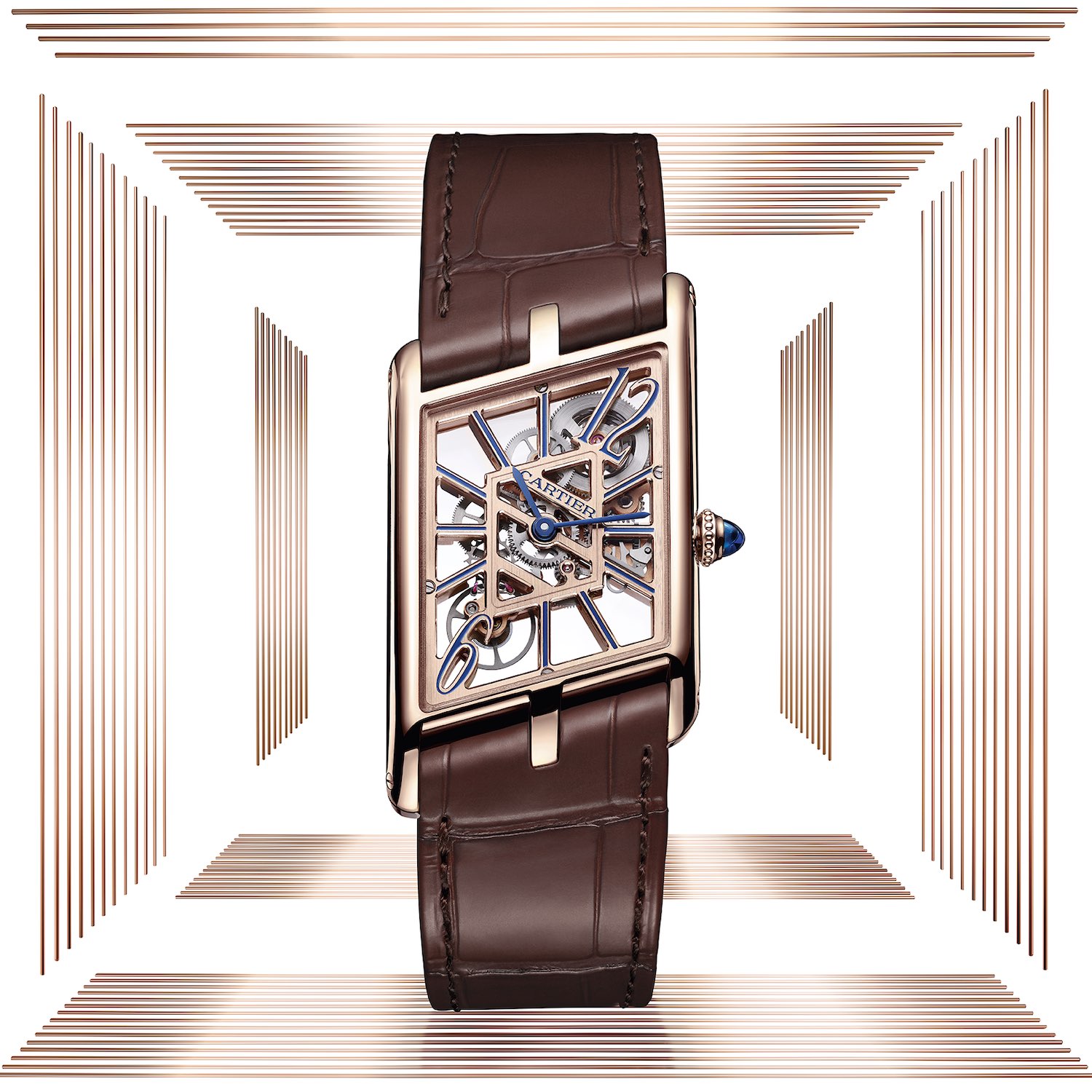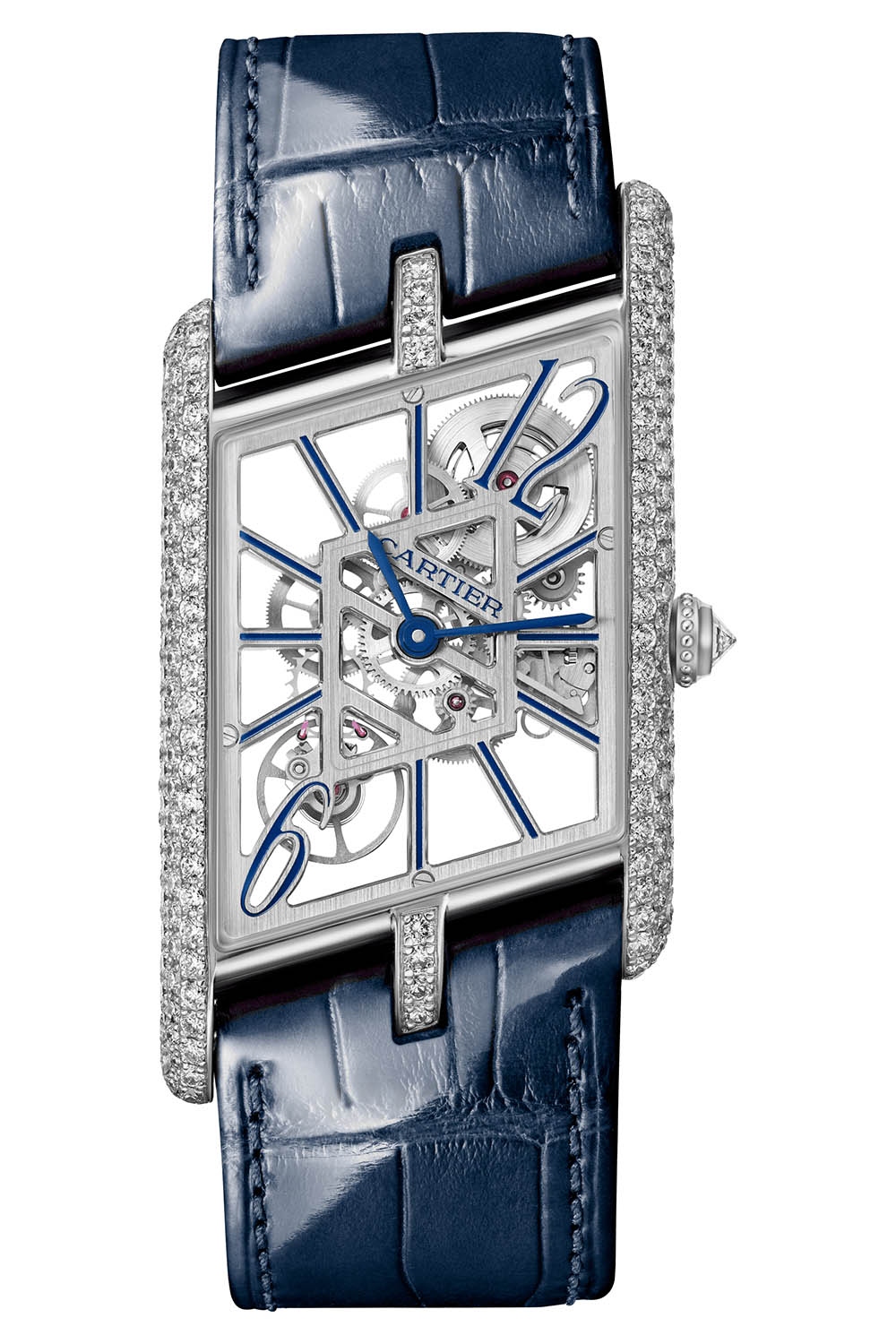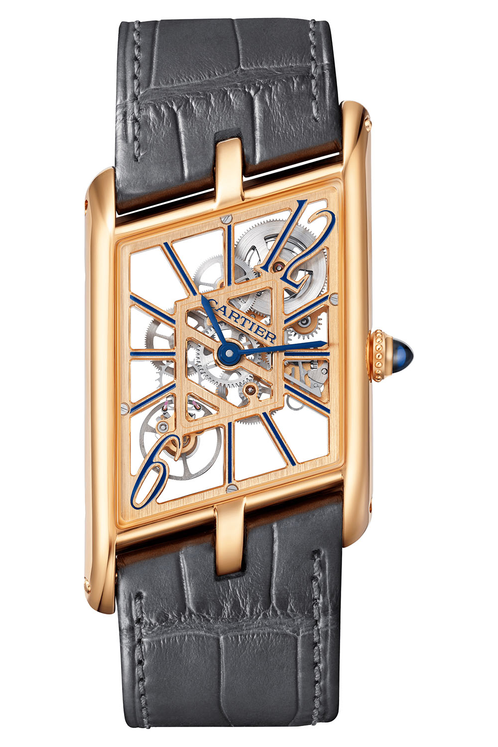 Quick facts: Cartier Privé Tank Asymétrique Skeleton – diamond-set platinum, platinum or pink gold case – 47.15mm x 26.2mm x 7.82mm – hand-wound calibre 9623 MC – 32mm x 21.1mm x 4.2mm, 28,800vph, 48h power reserve, 22 jewels – alligator leather strap on pin buckle – Price to be confirmed – limited to 100 pieces per model