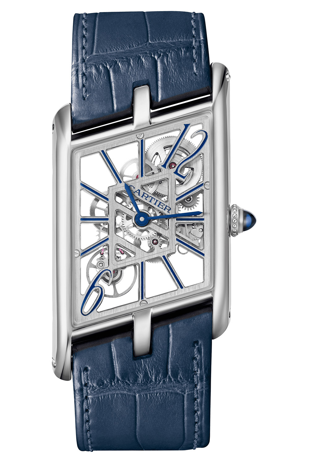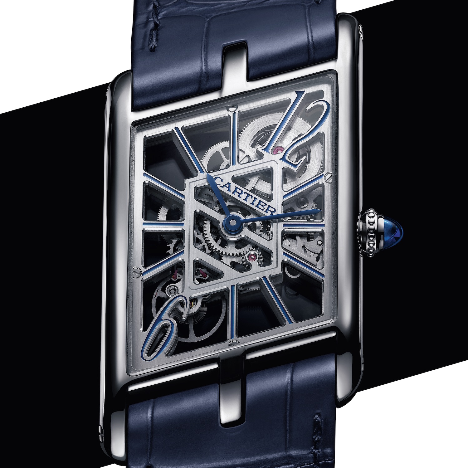 In addition to these three classic Cartier Privé Tank Asymétrique, the new collection also comprises three 100-piece limited editions in diamond-set platinum, platinum and pink gold, which are fitted with a skeletonized movement, the calibre 9623 MC. Built around the Arabic numerals 12 and 6, its architecture reveals its inner workings in full transparency. Specifically developed for the watch, it is 32mm x 21.1mm, runs at 4Hz and boasts 48 hours of power reserve. The numerals and indexes are filled with blue lacquer.