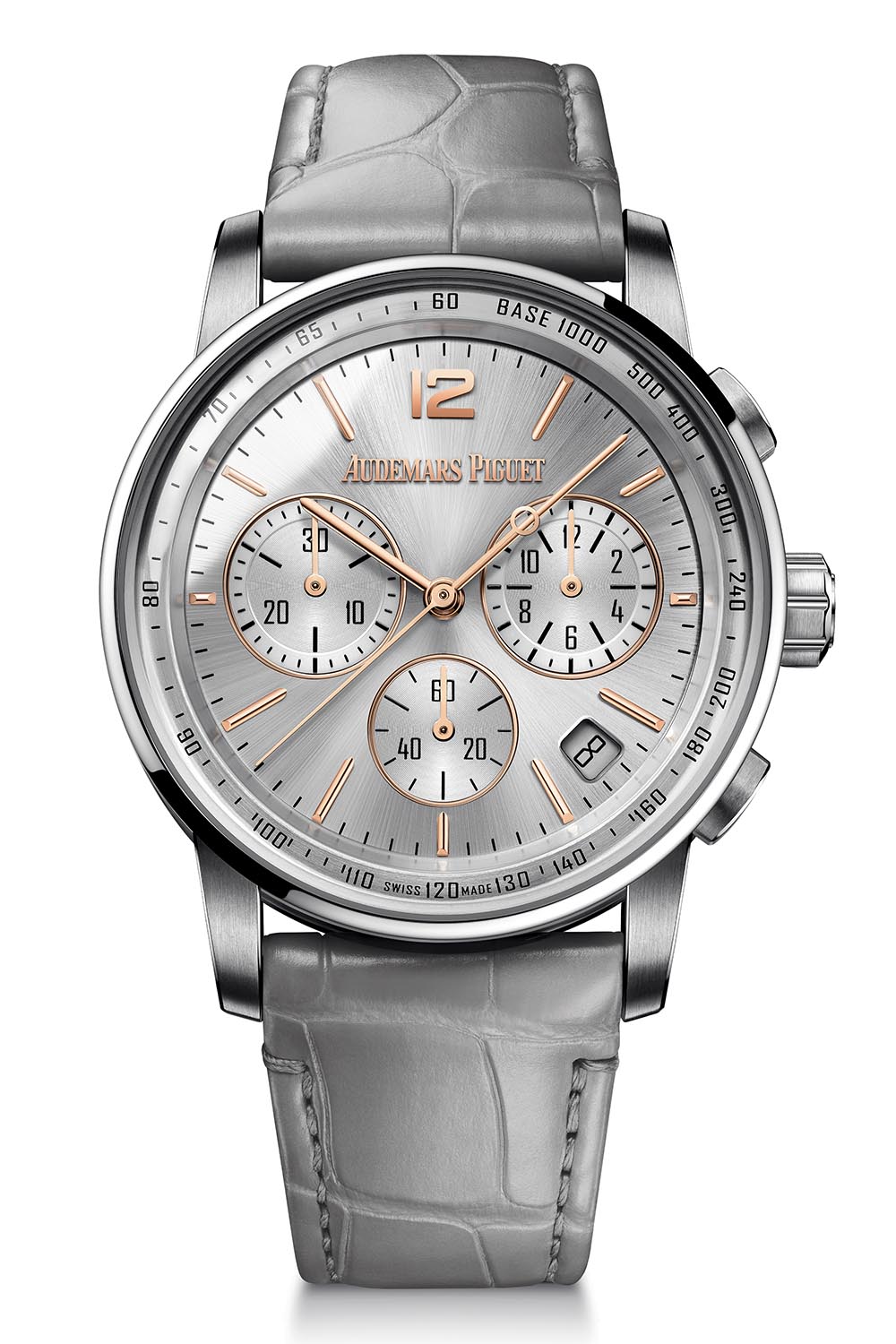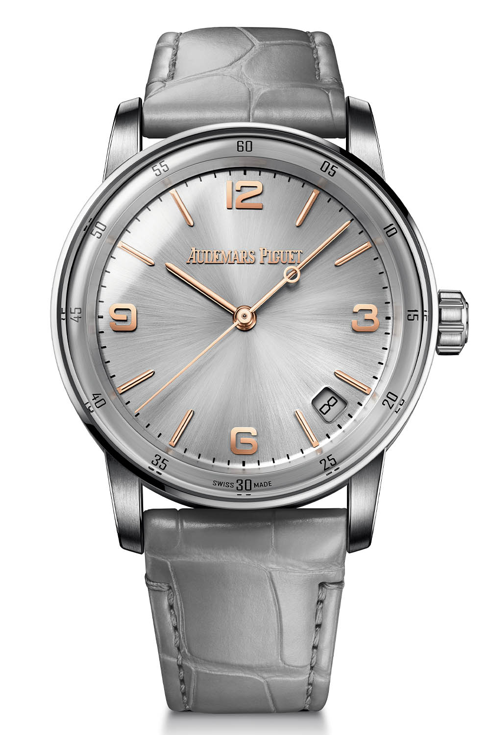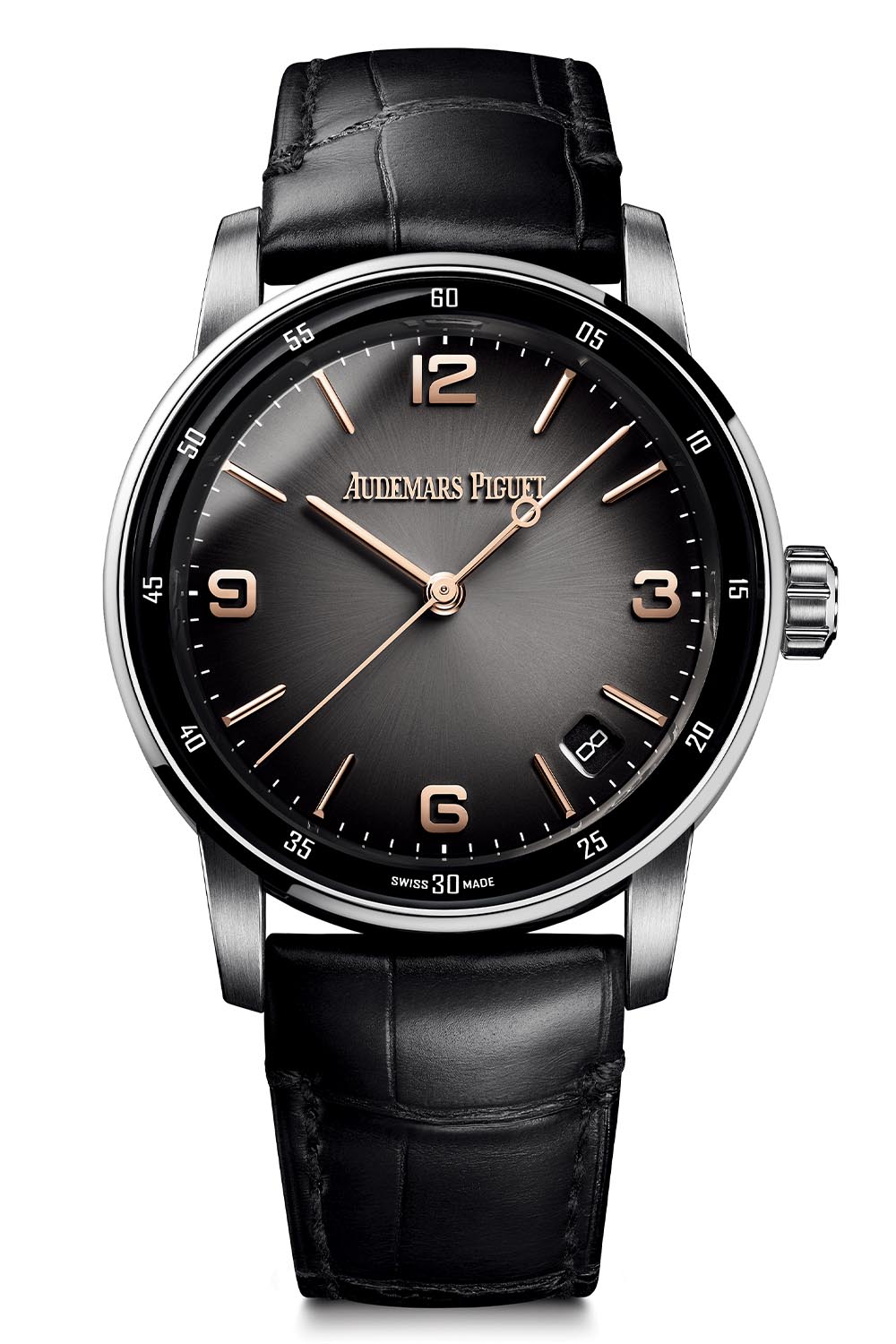 The Code 11.59 by Audemars Piguet Selfwinding time-and-date is powered by the Calibre 4302, an automatic movement with large 32mm and 70h of power reserve. It includes modern solutions like the transversal balance bridges and traditional decoration with polished bevels and Geneva stripes.