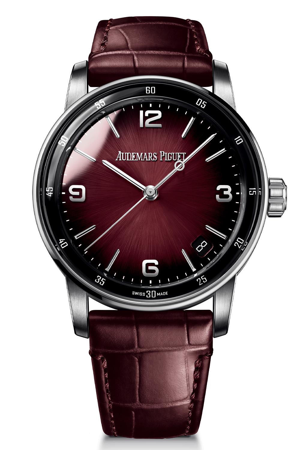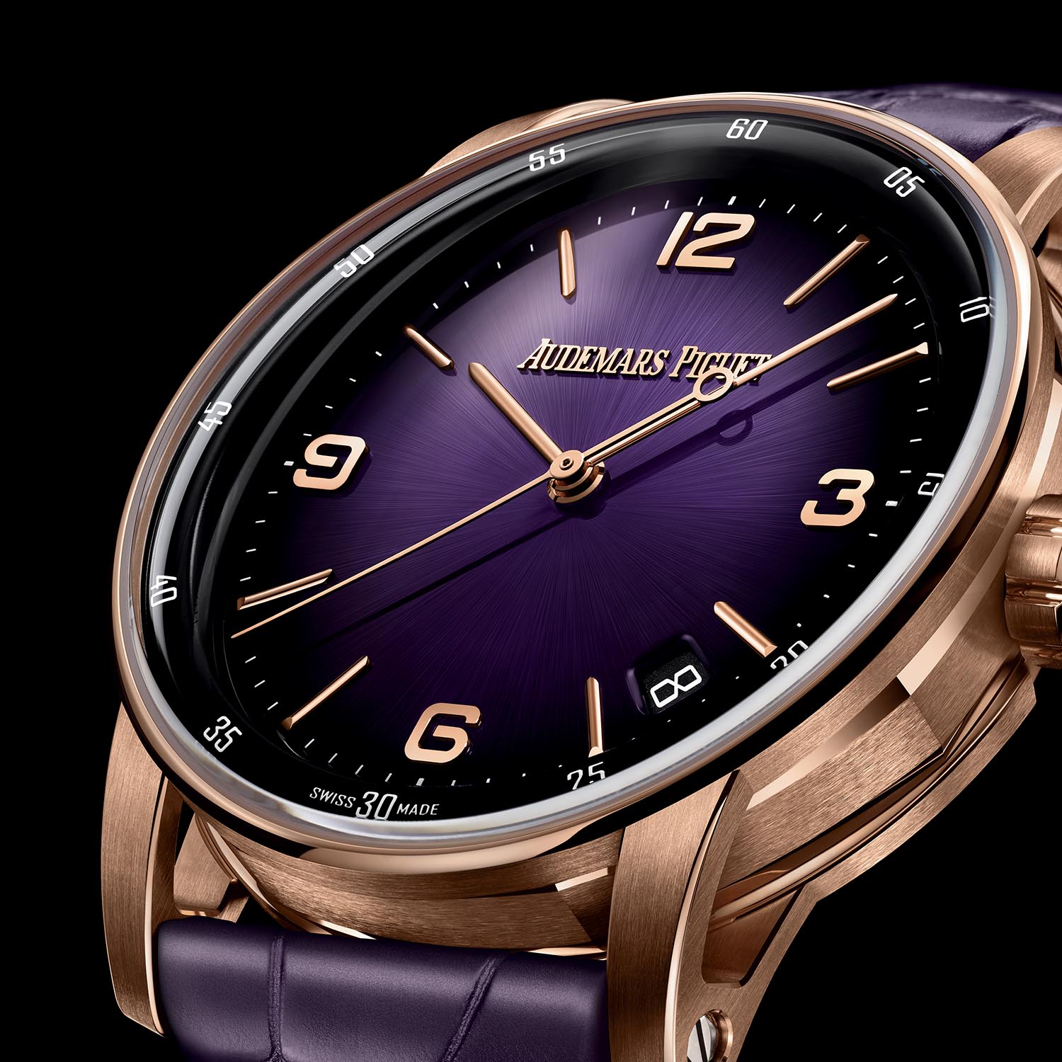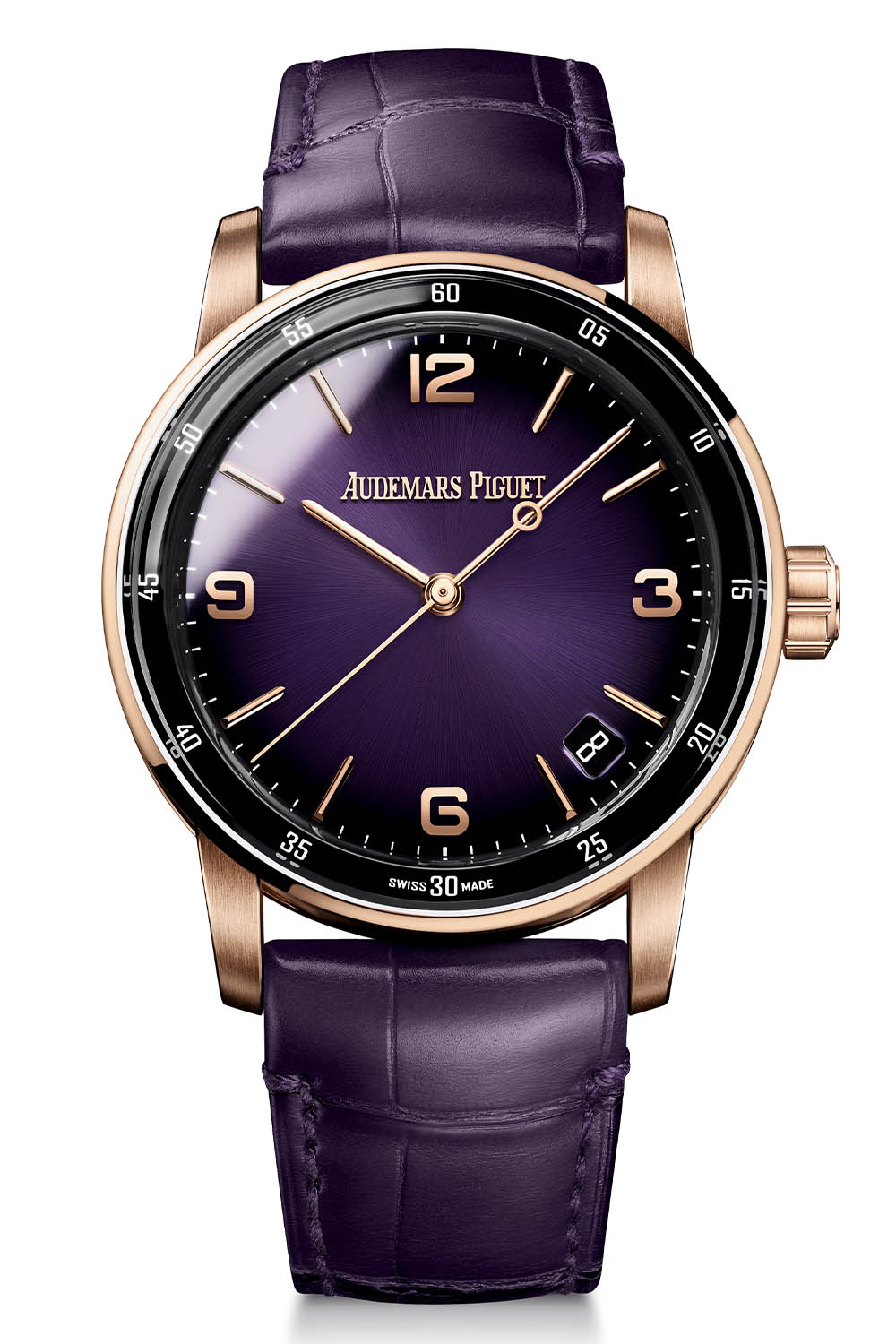 5 different colours have been added – not replacing existing watches. First is a burgundy dial with white gold hands and applied hour-markers and matching case. Then is an ocean blue dial with pink gold hands and applied hour-markers and matching case. Also available is a dark purple dial with pink gold hands and applied hour-markers and matching case.