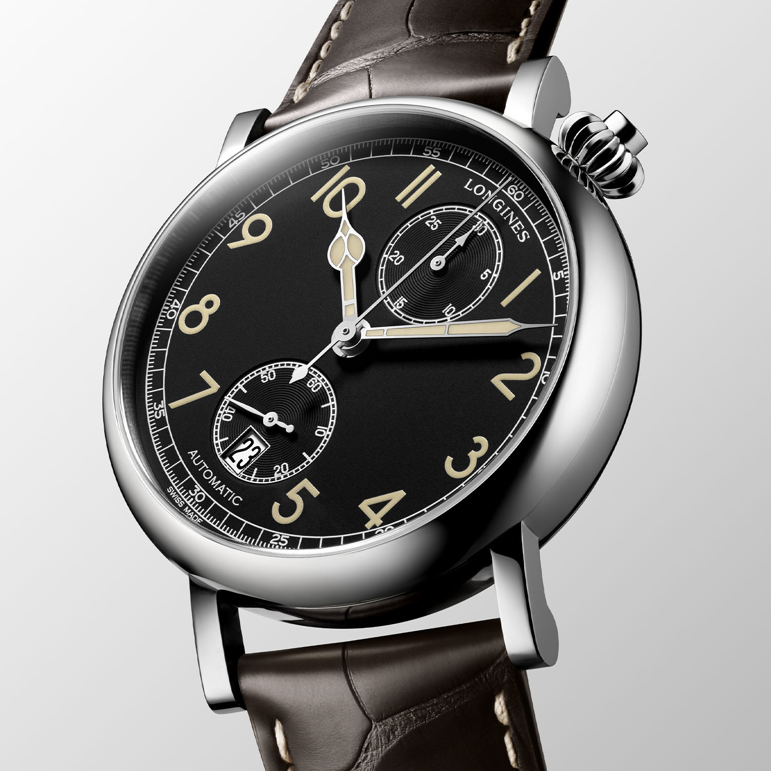 The main attraction of the Avigation Watch Type A-7 has always been its 40-degree shifted display and the new model respects this feature. If this appears strange at first, the alignment of the two counters and the crown provide visual balance and give the watch a lot of personality. The dial is now matte black with white tracks and printed Arabic numerals executed in cream-coloured Super-LumiNova. The cathedral hands are not entirely faithful to the original model but still work well in this 1930s context. The presence of a date complication is always debatable.