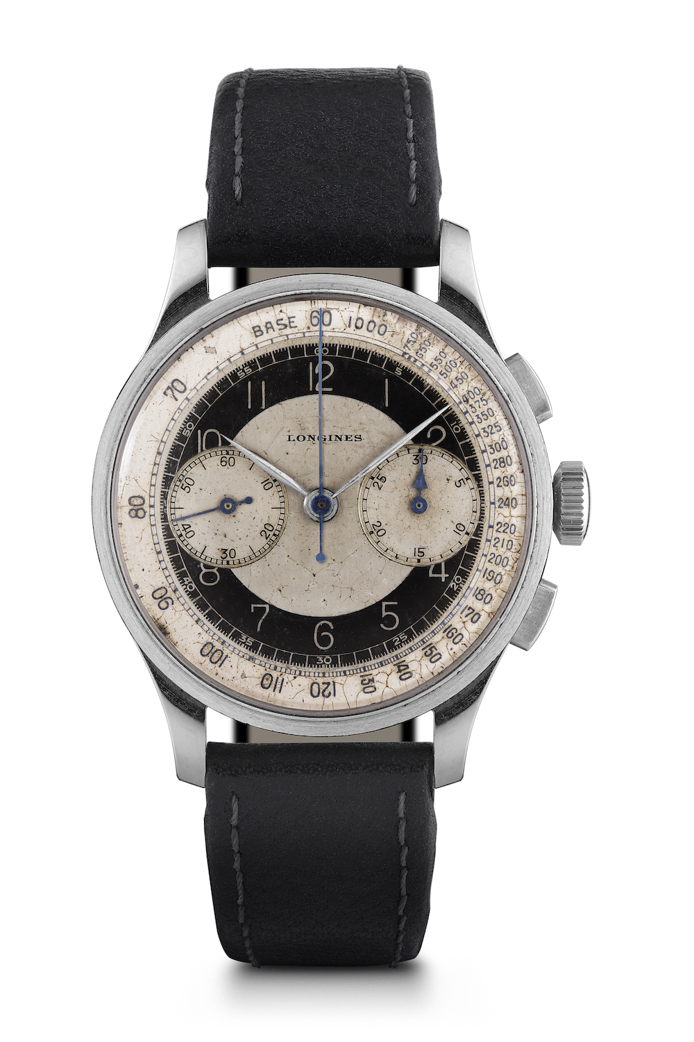 - Dial: silver opaline and black dial, painted Arabic numerals and tracks – rhodium-plated and blued hands – bi-compax layout – tachymeter scale