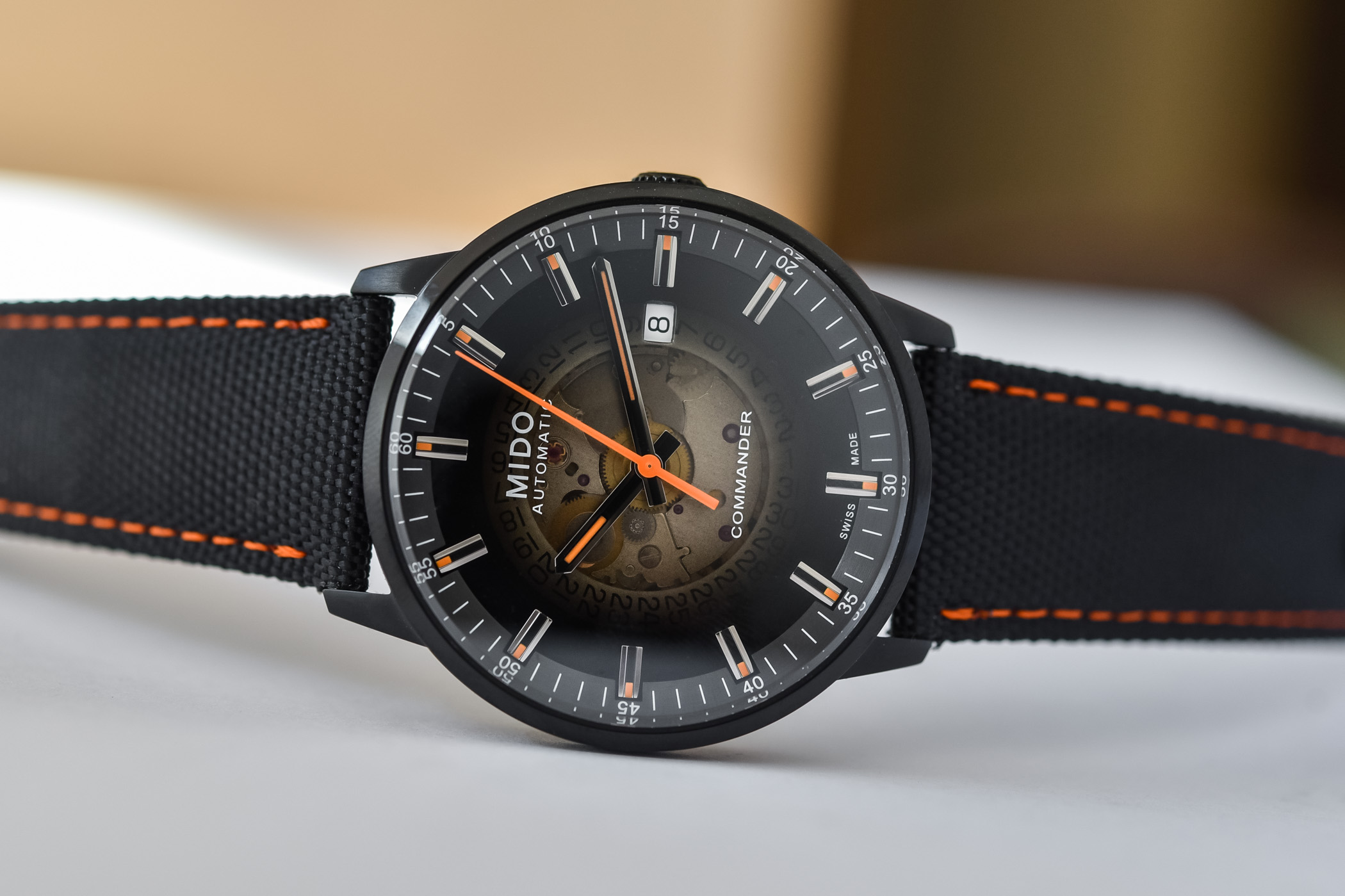 The version of the Mido Commander Gradient we had for this hands-on is worn on a black fabric strap with contrasting orange stitching. It is secured by a PVD-coated steel folding buckle. Its price is set at EUR 870 or CHF 940 – like most Swatch Group offerings fitted with the Calibre 80, this represents excellent value in a highly competitive landscape.