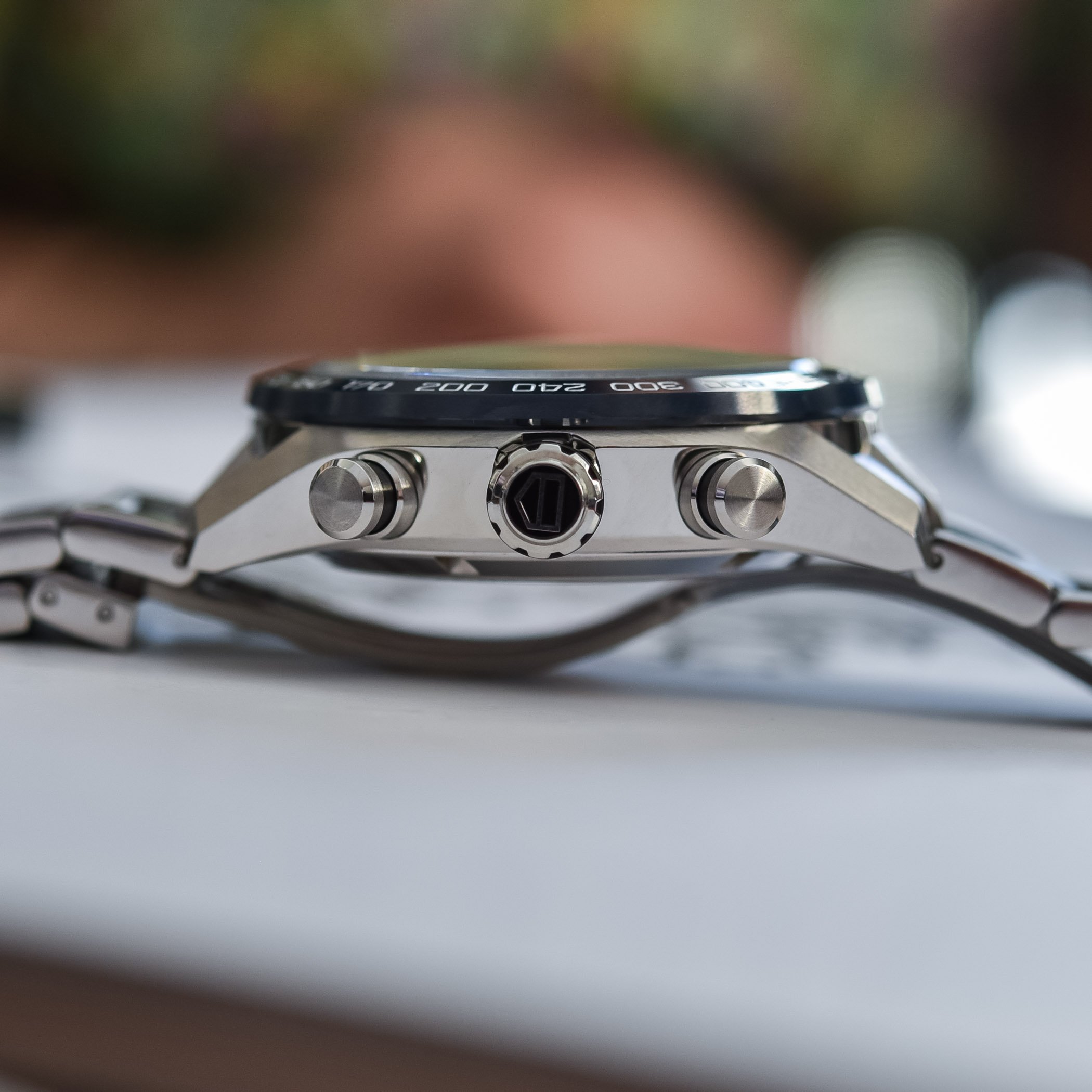 The iconic Carrera lugs have been shortened on this new Sport Chronographs to enhance comfort and the alternating polished and brushed finishes give the watch a slimmer profile. Like the original Carrera, the lugs are faceted, the pushers are pump or piston-style and the crown is unprotected. Underscoring its sporty chronograph vibe, the indented area of the pushers and crown is picked out in black. Even with a sapphire crystal caseback and an unprotected crown, the chronograph is water-resistant to 100 metres.