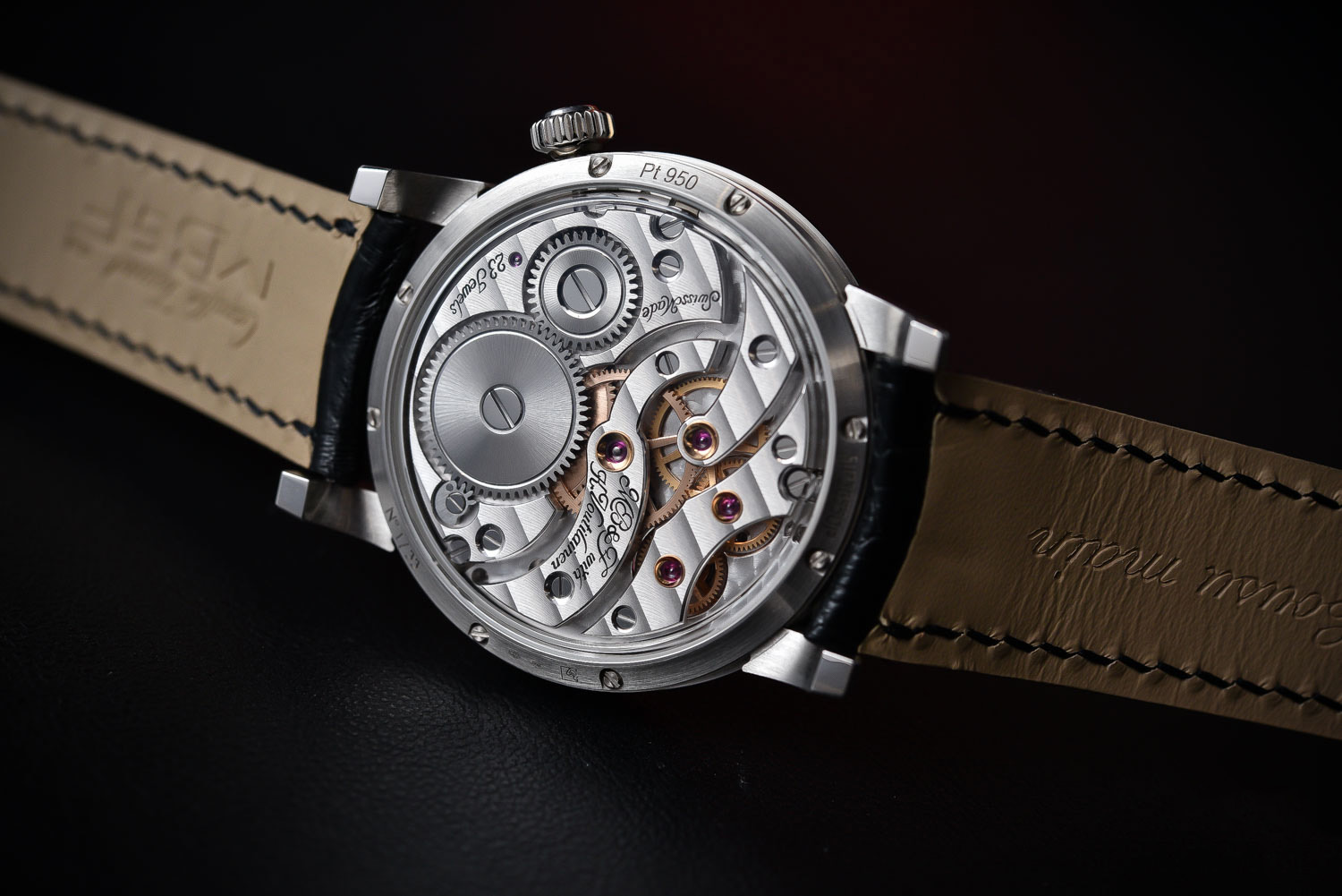 The hours and minutes are displayed in the top right corner with bright blued-gold hands for additional contrast, and the 45-hour power reserve is displayed in a smaller sub-dial at 6 o’clock. Both sub-dials feature a golden perimeter, and there are no visually obtrusive attachment screws because the dials are attached to the top plate from below. Unlike former editions of the power reserve indicator on the LM101 with Arabic numerals (40, 32, 24, 16 and 8), the 2021 LM101 reduces the information to just three numerals (45, 30 and 15). Another difference is the elimination of the Legacy Machine engraving on former models.