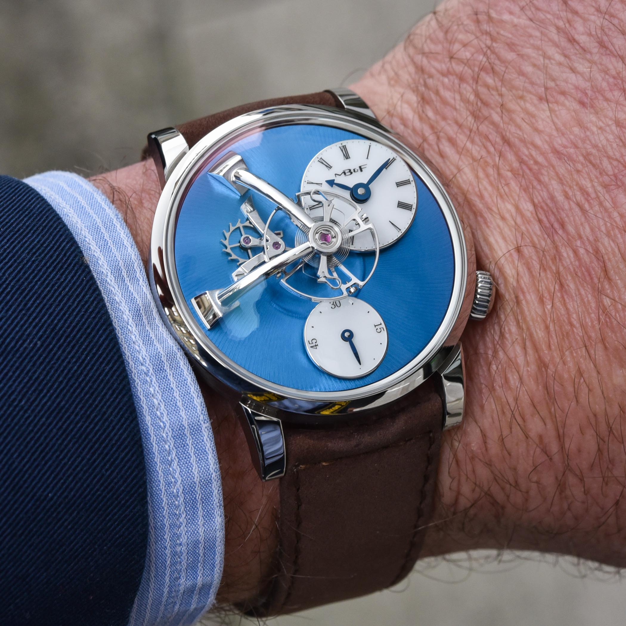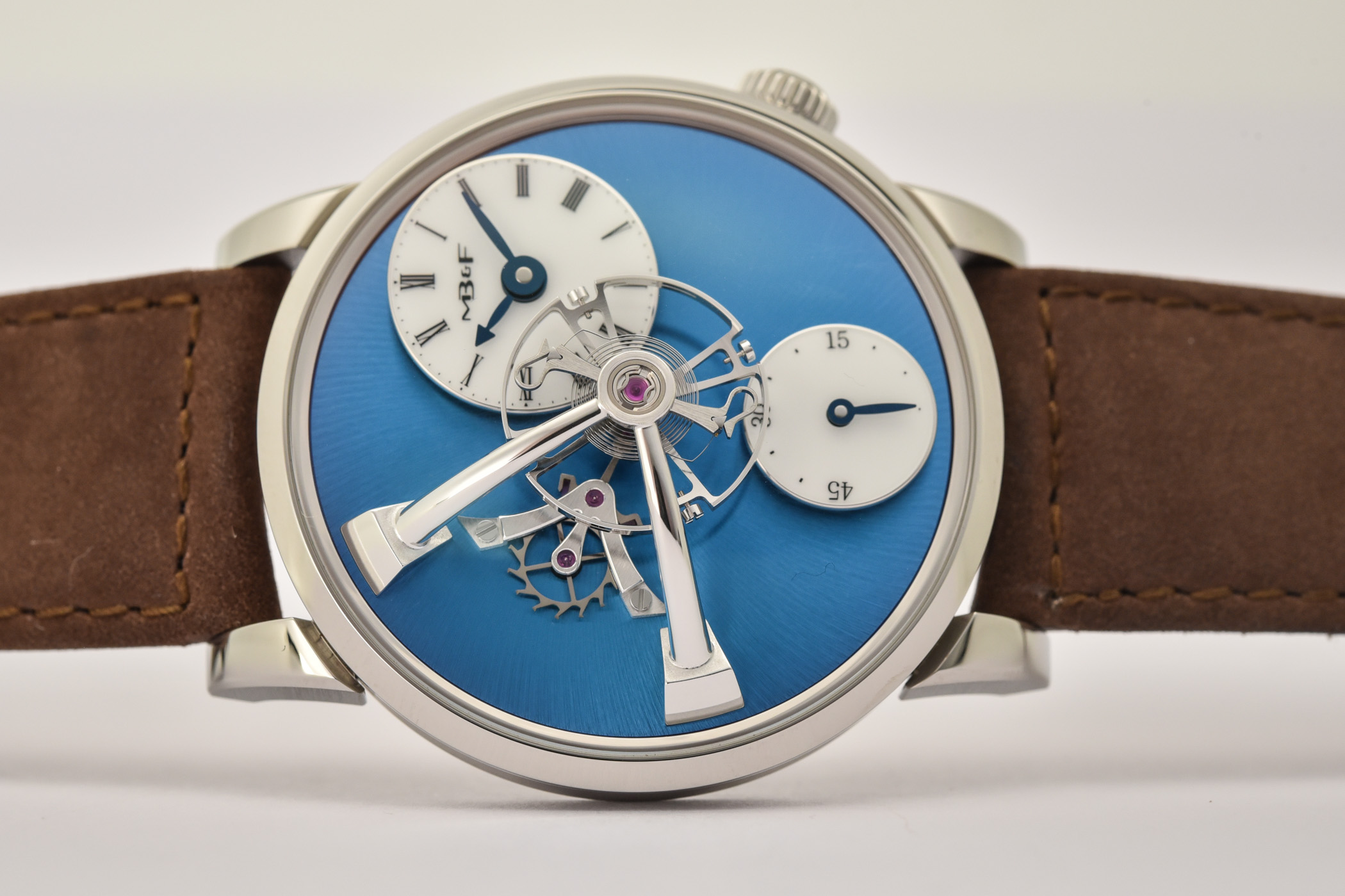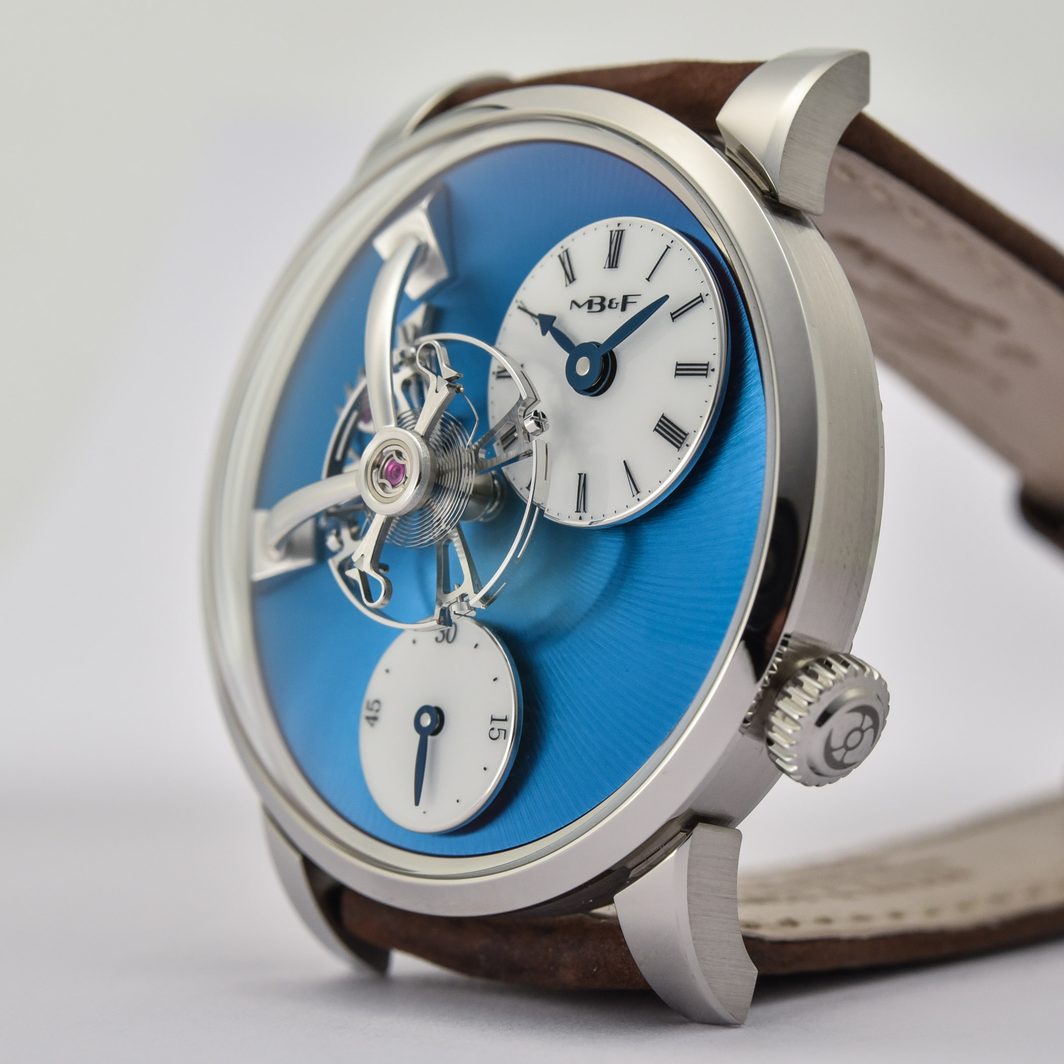 Like the first two Legacy Machines, the LM101 flaunted the large floating balance wheel on the dial, the twin arched bridge, the classic lacquered sub-dials and the domed sapphire crystal. In 2014, the LM101 was also the proud bearer of the first movement entirely developed and conceived in-house with a little help from MB&F’s friend Kari Voutilainen for the design and finishings. However, unlike the 44mm Legacy Machines, the LM101 had a smaller and more wearable 40mm case size and was the least expensive model in the Legacy Machine collection. Since its debut, the LM101 has appeared in 18k red and white gold, in two limited ‘Frost’ editions, limited editions in platinum and palladium and even a collaborative model with an H. Moser & Cie. green fumé dial stripped of sub-dials in classic minimalist Moser style.