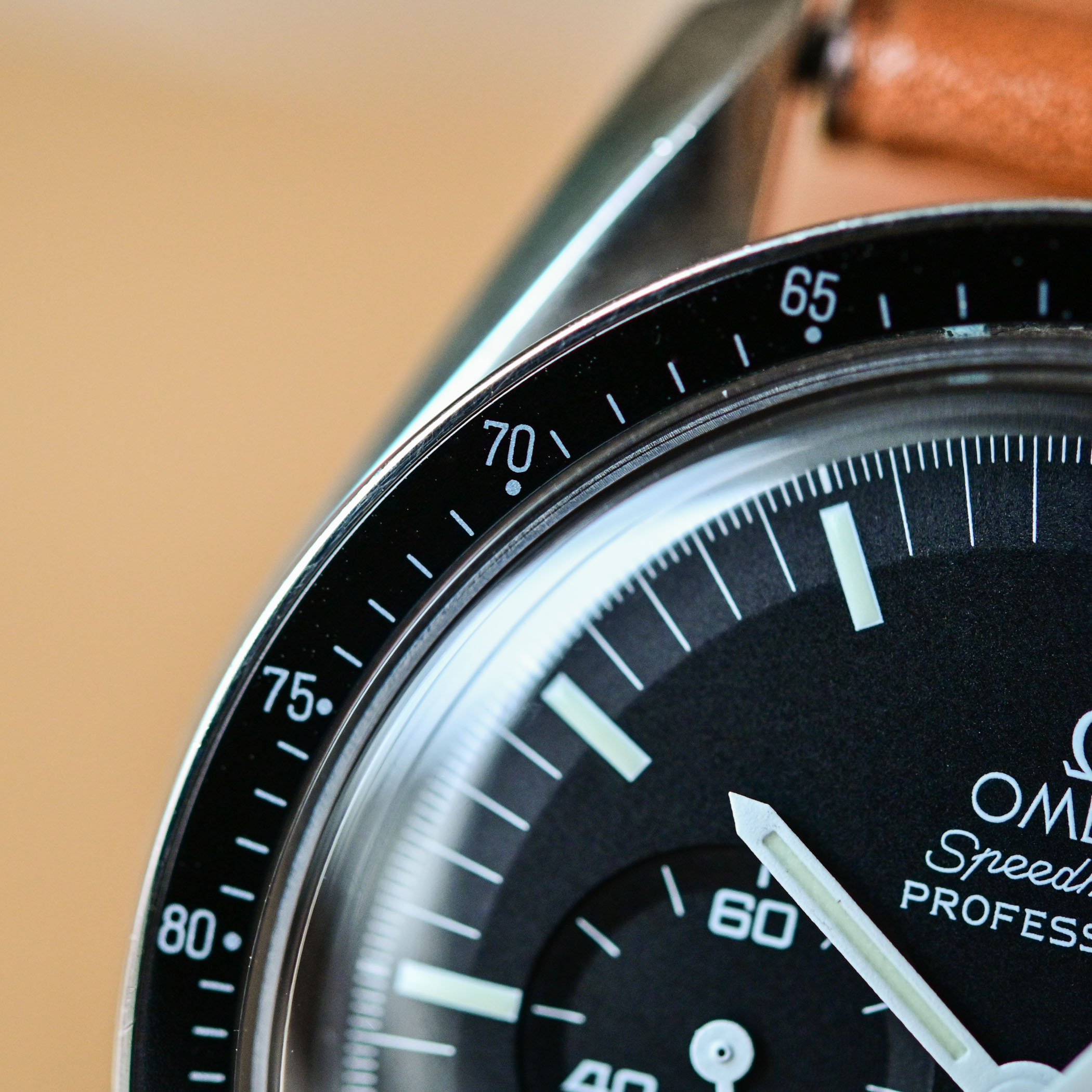 The bezel insert of the pre-2021 Speedmaster Moonwatch Professional 3570.50 is made of black anodized aluminium. For the rest of the story, we must note two important features: the “dot next to 90” and “dot beneath 70″… You’ll understand later, but these are features that appeared only on more modern references and were absent from the 105.012. The bezel is of course, external, framing the crystal and is made of polished stainless steel.