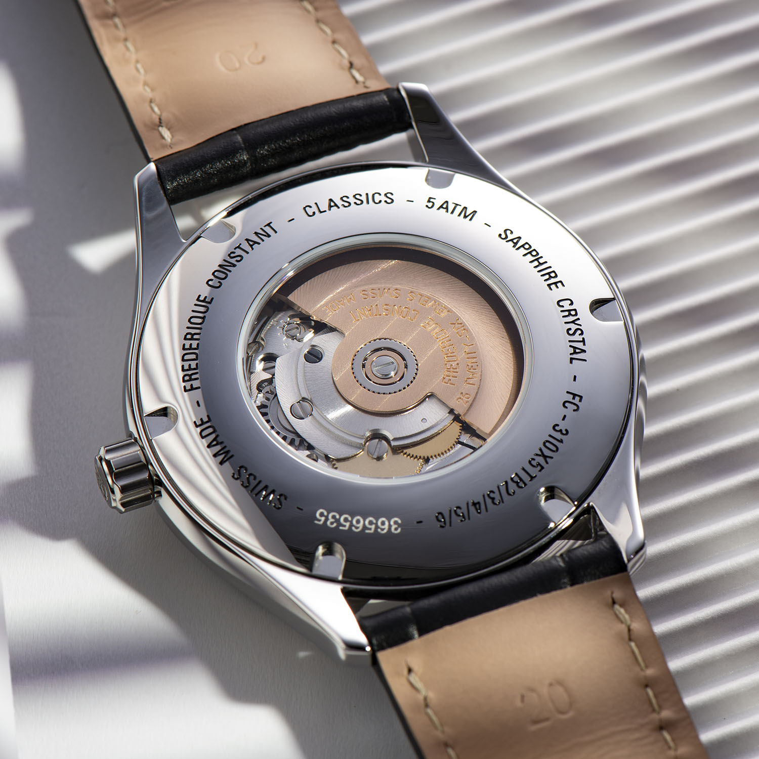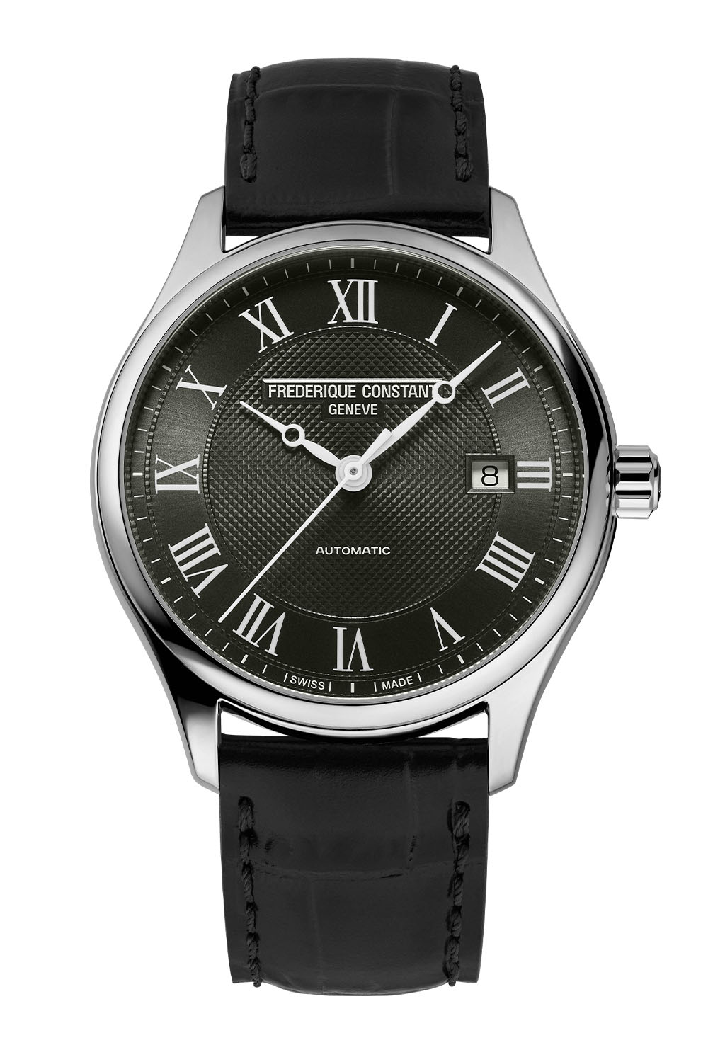 The 5 new references are spread around 2 versions. First is the Classics Index Automatic line, with a time-and-date display. This version is available in 3 references: steel with a silver-coloured dial, with black numerals and hands, worn on a black leather strap; steel with khaki dial with white numerals and hands and worn on a black leather strap; a rose gold-plated version with silver dial, black numerals and hands and a brown leather strap. All watches are measuring 40mm in diameter with a reasonable height of 10.3mm. Under the solid caseback is the automatic calibre FC-303 (Sellita SW-200) with 4Hz frequency and 38h power reserve. Prices will be EUR 895 in steel and EUR 1,095 in gold-plated steel.