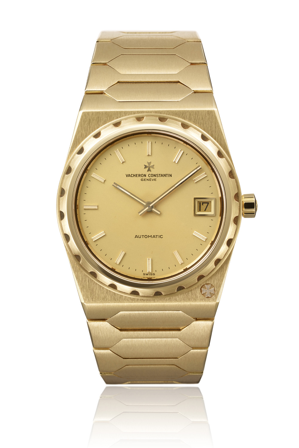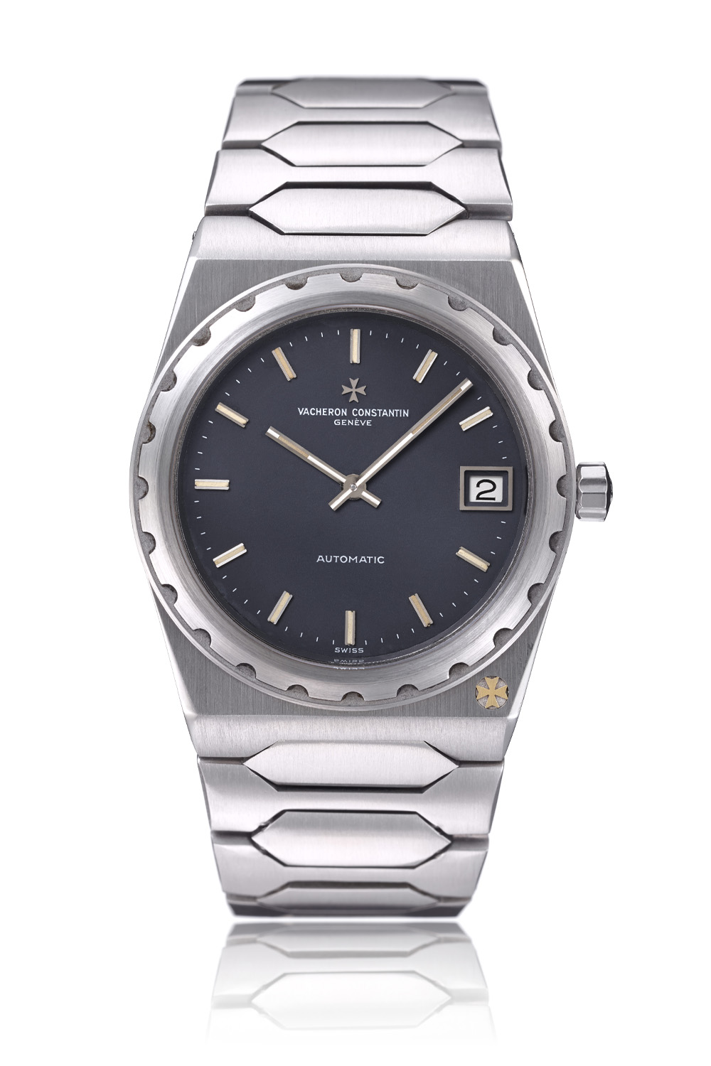 The Vacheron Constantin originally came in stainless steel and was water-resistant to 120 metres, and yet it measured only 7mm in height thanks to its ultra-thin movement measuring barely 3.05mm – the calibre VC1120, based on the Jaeger-LeCoultre calibre 920. The Jumbo was a time-and-date watch without seconds that measured 37mm in diameter. Following the initial Jumbo steel model, the 222 was subsequently interpreted in 34mm and 24mm steel, yellow gold or two-tone iterations, polished or gem-set but always with the emblematic fluted bezel and the Maltese cross emblem nestling in the right-hand corner of the case at 5 o’clock. It will remain in production until 1985. Later, the design and style of the original model resurfaced in 1996, with the creation of the Overseas Phase 1.