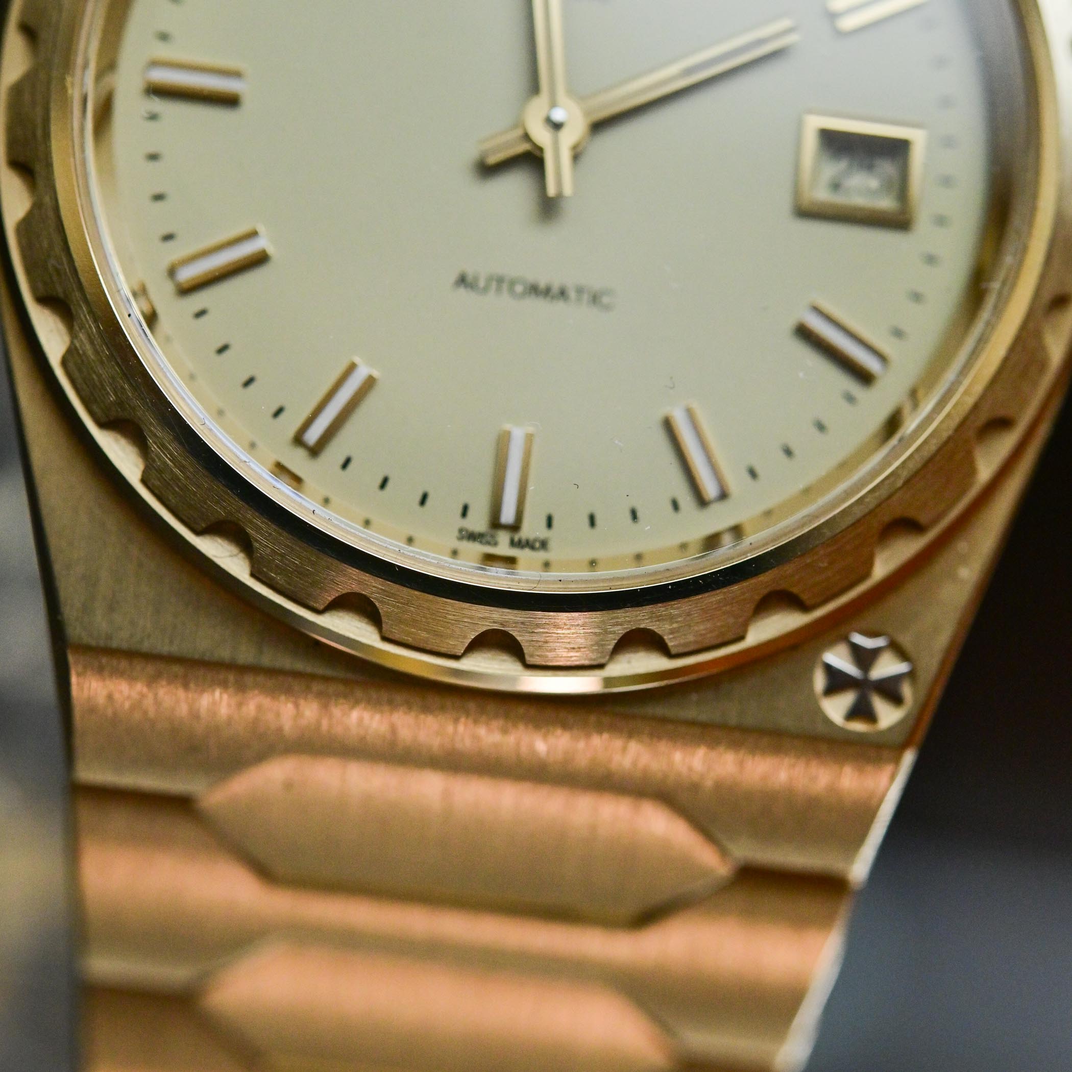 - gold-toned dial with still a 2-hand and date display, historic font for the Automatic mention
