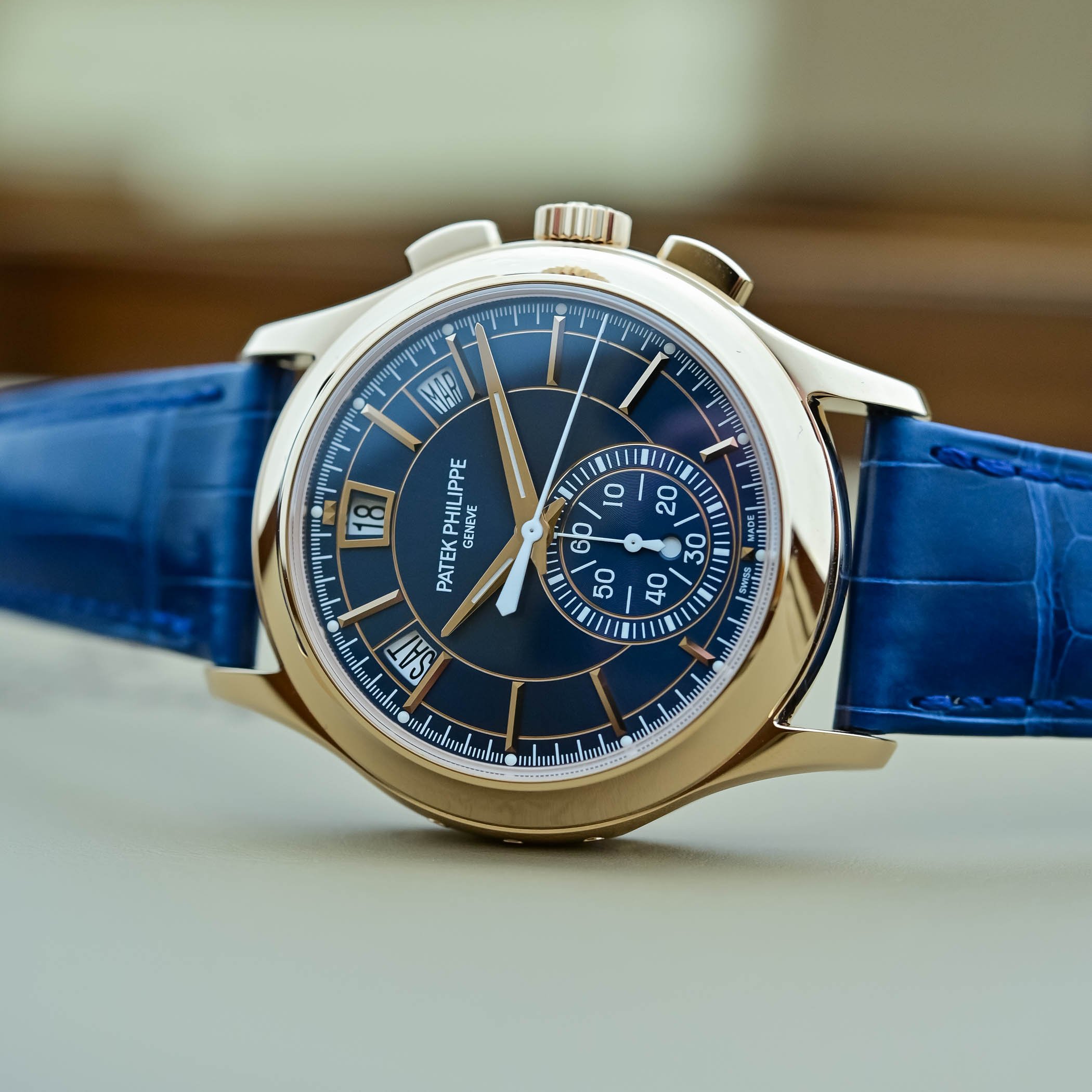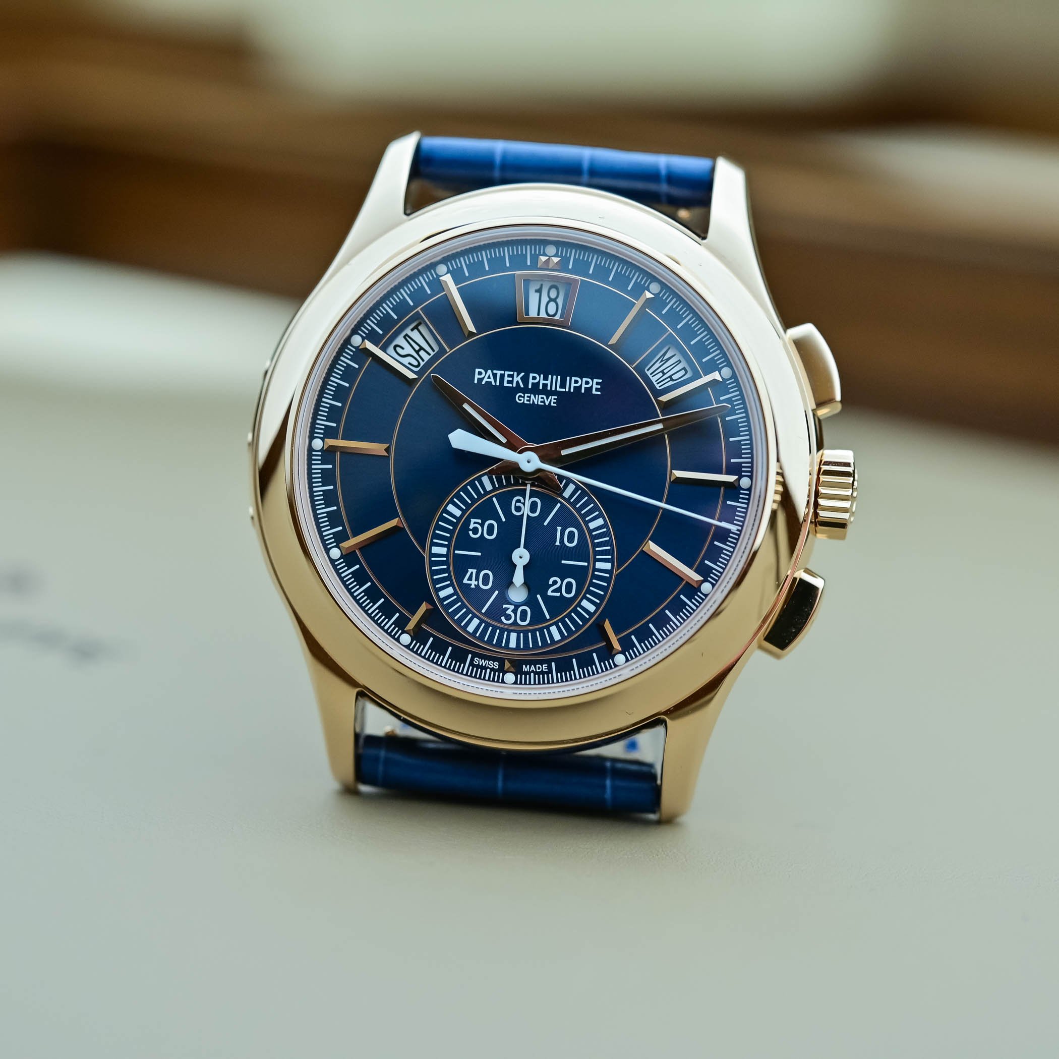 A regal combination of rose gold and royal blue for Patek’s signature complication combo.