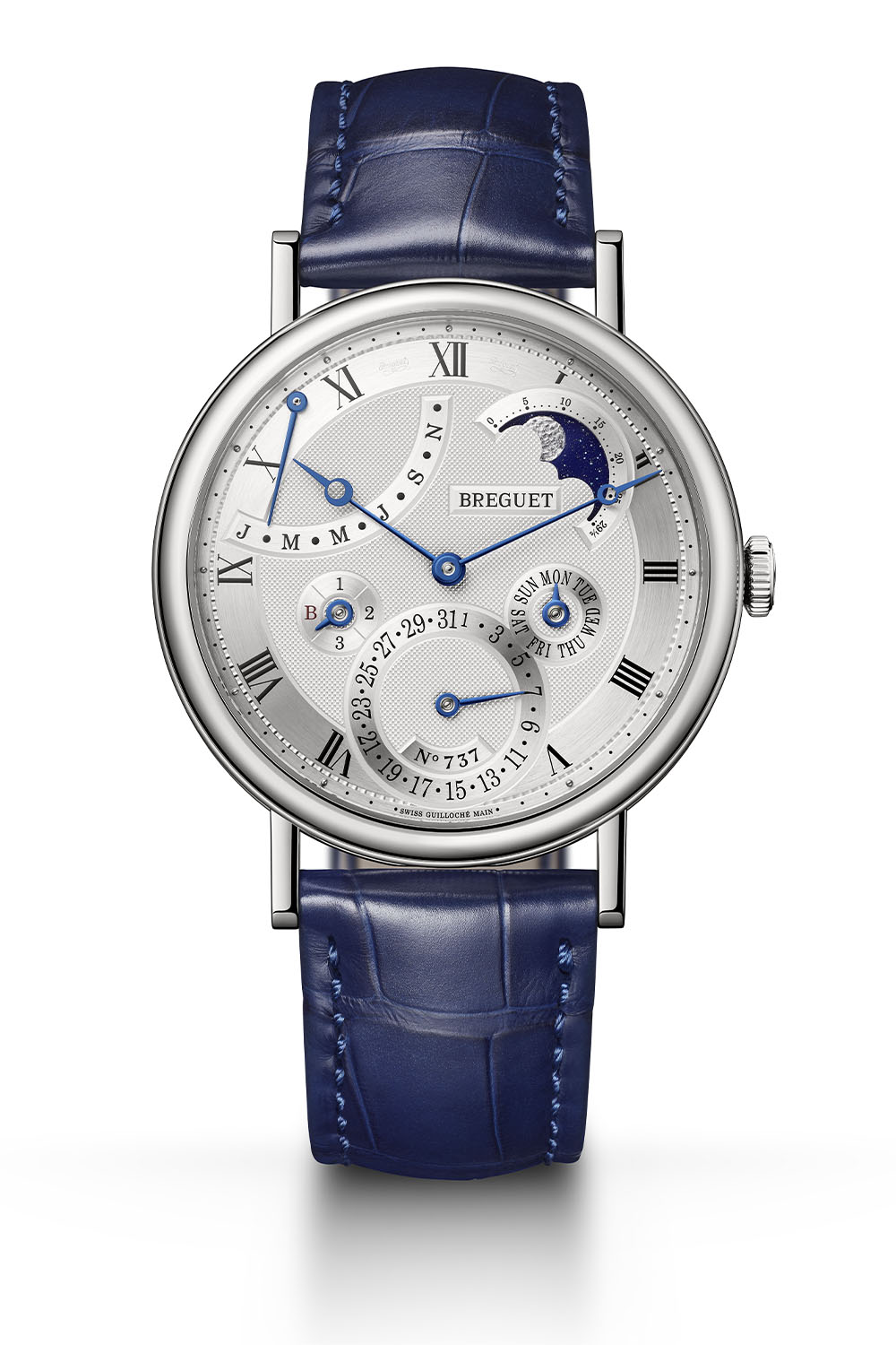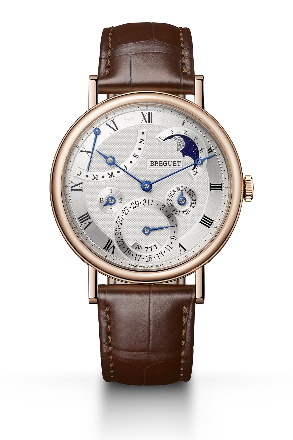 To keep the watch as light, slim and comfortable as possible, Breguet chose its ultra-thin automatic calibre 502 with a height of just 4.5mm as the base with an additional calendar module. Fitted with a gold off-centred rotor to provide space for the 294 components, the movement beats at 3Hz and delivers a 45-hour power reserve. To counter the effect of magnetic fields, the movement is also equipped with a flat silicon balance spring and an inverted straight-line lever with silicon horns.