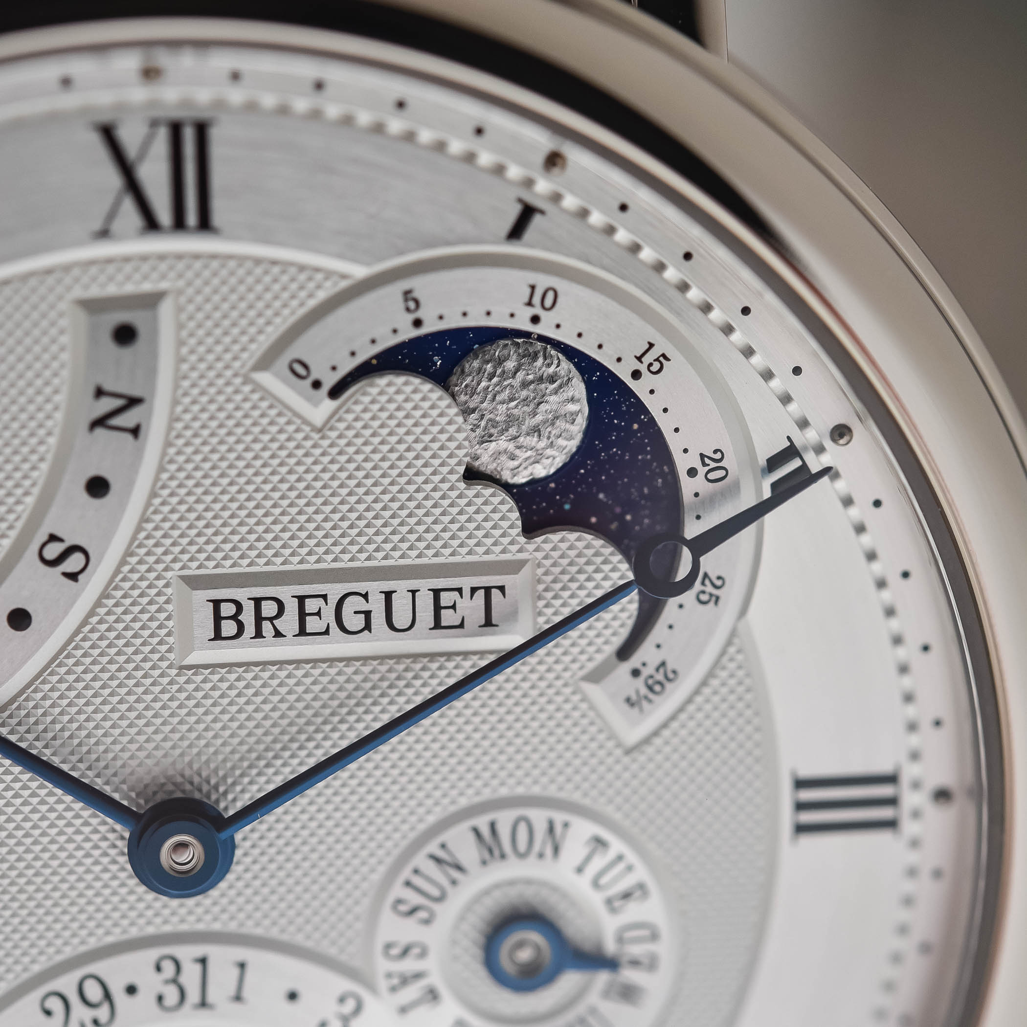 The silvered gold dial is decorated with a Clous de Paris (hobnail) guilloché pattern in the centre that is more subtle and thinner than its predecessor – a style that has been introduced with the Tourbillon Extra-Plat Anniversaire 5365. Similar to the layout of Breguet’s minute repeater with perpetual calendar – the reference 5447 – instead of the six counters relaying the calendar and moon phase functions, the dial of the new Classique Perpetual Calendar 7327 compresses the information into five counters.