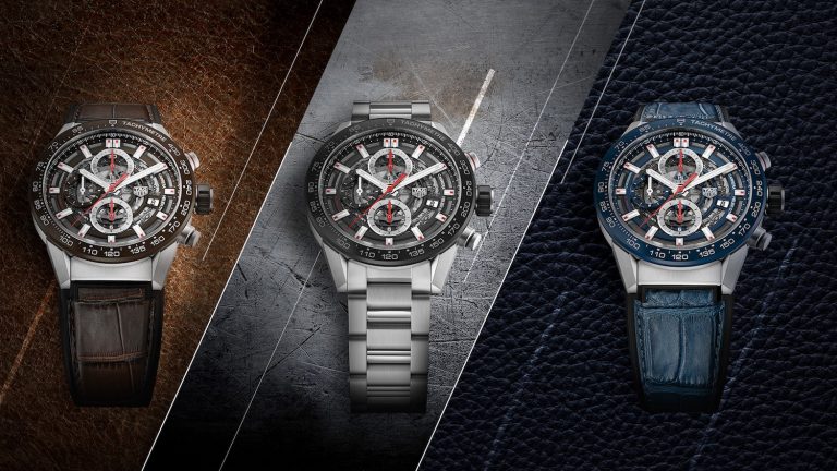 The TAG Heuer Monaco Skeleton is released in three editions: Original Blue, with a non-treated titanium case, a classic blue dial with white and red accents, a blue strap and blue accents on the column wheel and the oscillating mass engravings; Racing Red, again with a non-treated titanium case, a black dial red and white accents, a black strap and red column wheel and engravings on the rotor; and Turquoise, with a black DLC-coated case, a black strap, a black dial with turquoise-coloured accents and sub-dials, a colour also sported on the column wheel and rotor.