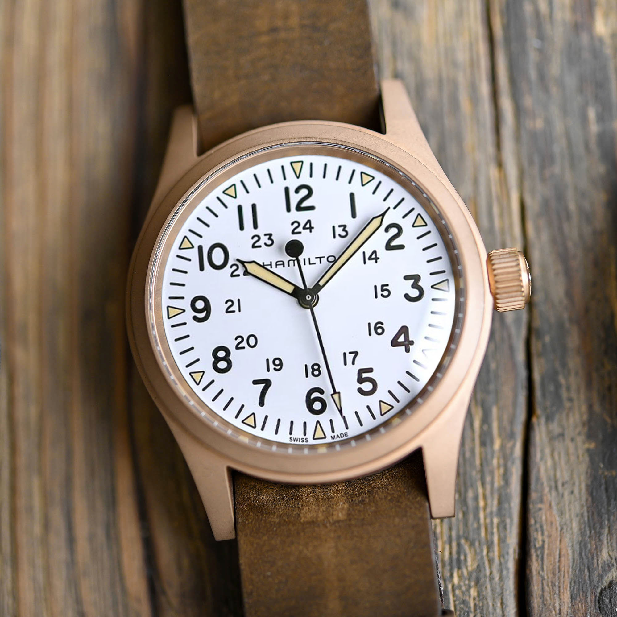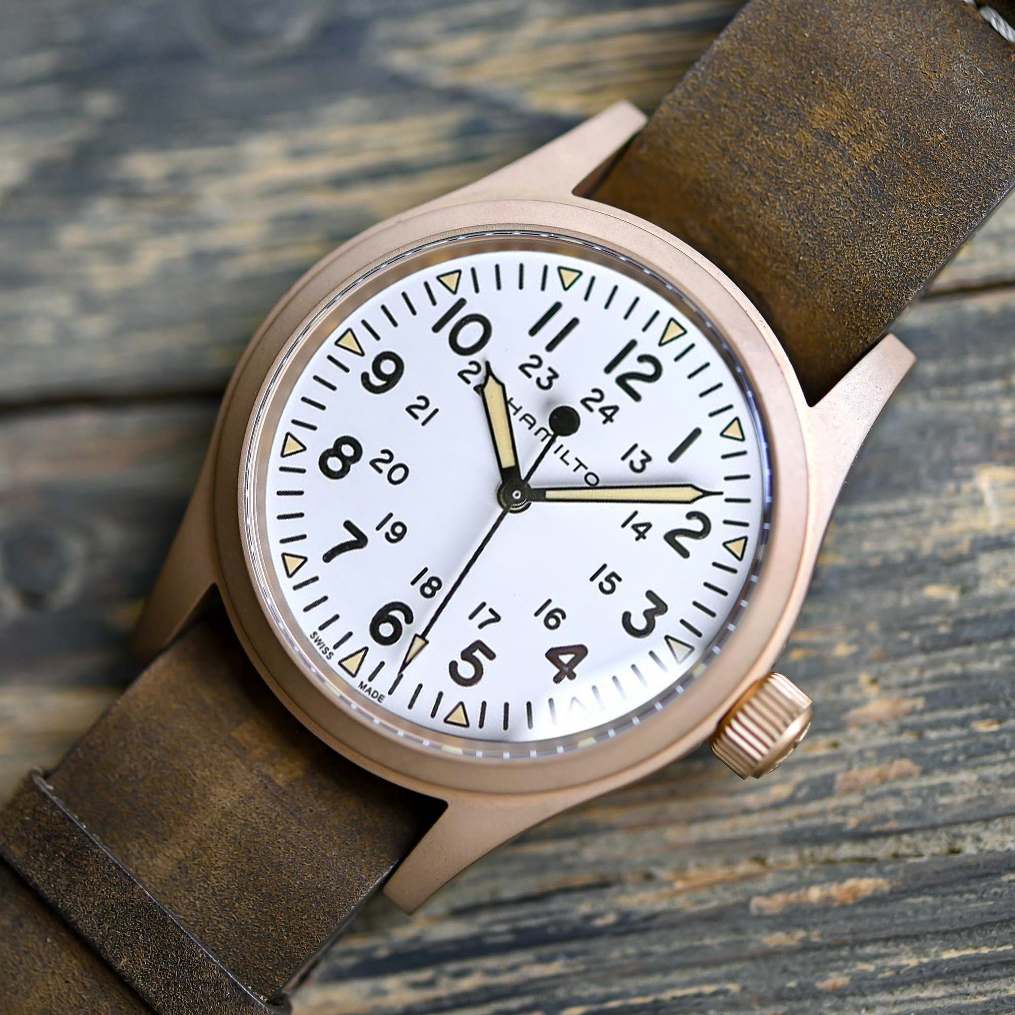In my watch box, my 38mm Field Khaki bronze with the black dial has a place of honor among its more distinguished brethren. It is a shockingly practical and comfortable time piece. I generally hate OEM straps but the one pass leather strap is exemplary although I will probably ultimately get one of the stellar RSM distressed military straps if they have one with bronze or distressed bronze hardware.