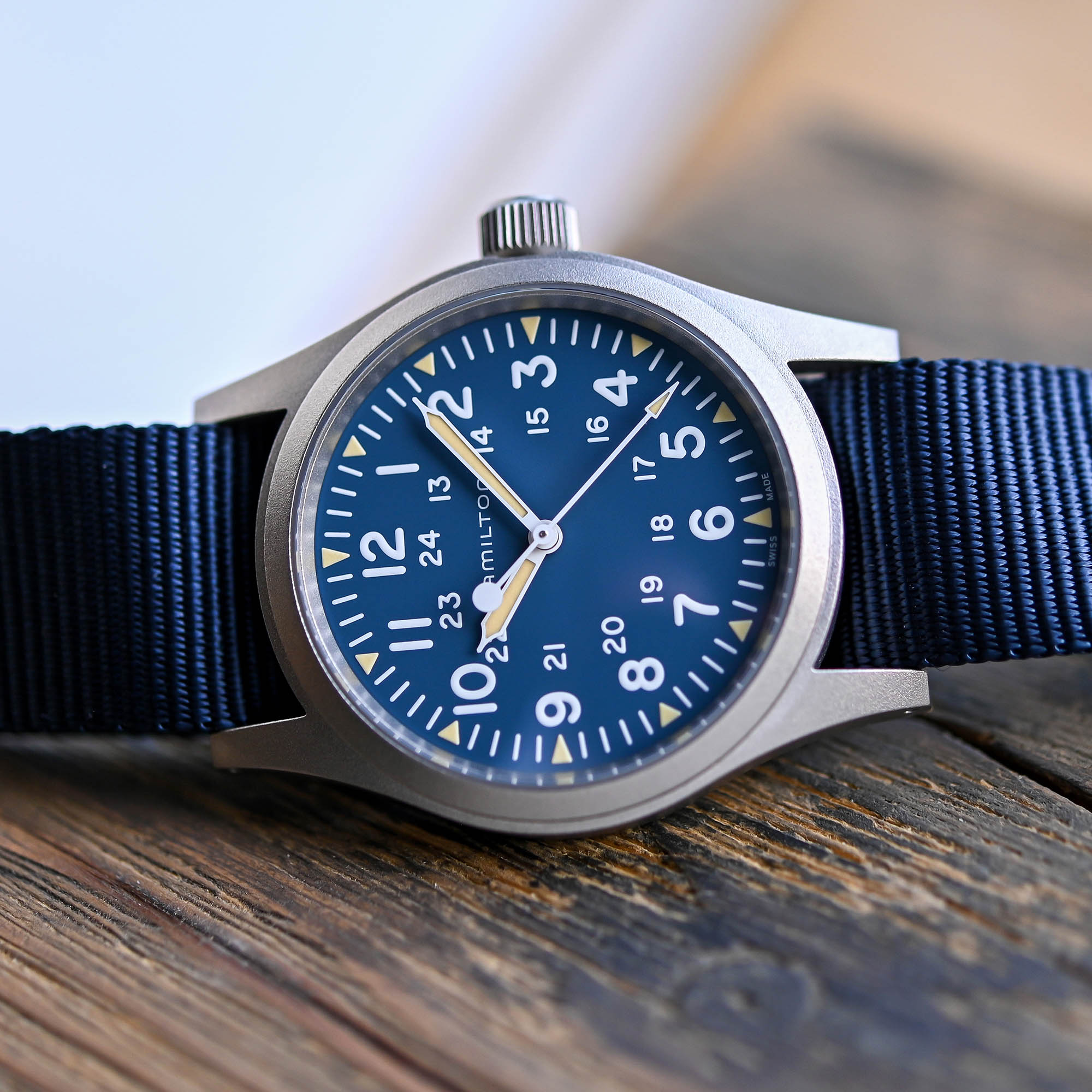 One of the distinctive elements of the Khaki Field Mechanical was its dial, which was heavily inspired by vintage military watches. It has large Arabic numerals, an additional 13-24 hour scale, triangular luminous markers and a nicely designed handset. Two new steel models join the collection: a new matte blue dial paired with a blue strap and a revamp of the classic white dial model that now has greenish Super-LumiNova and a new all-black NATO strap.