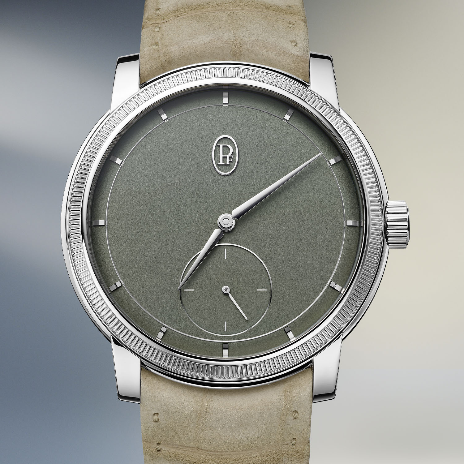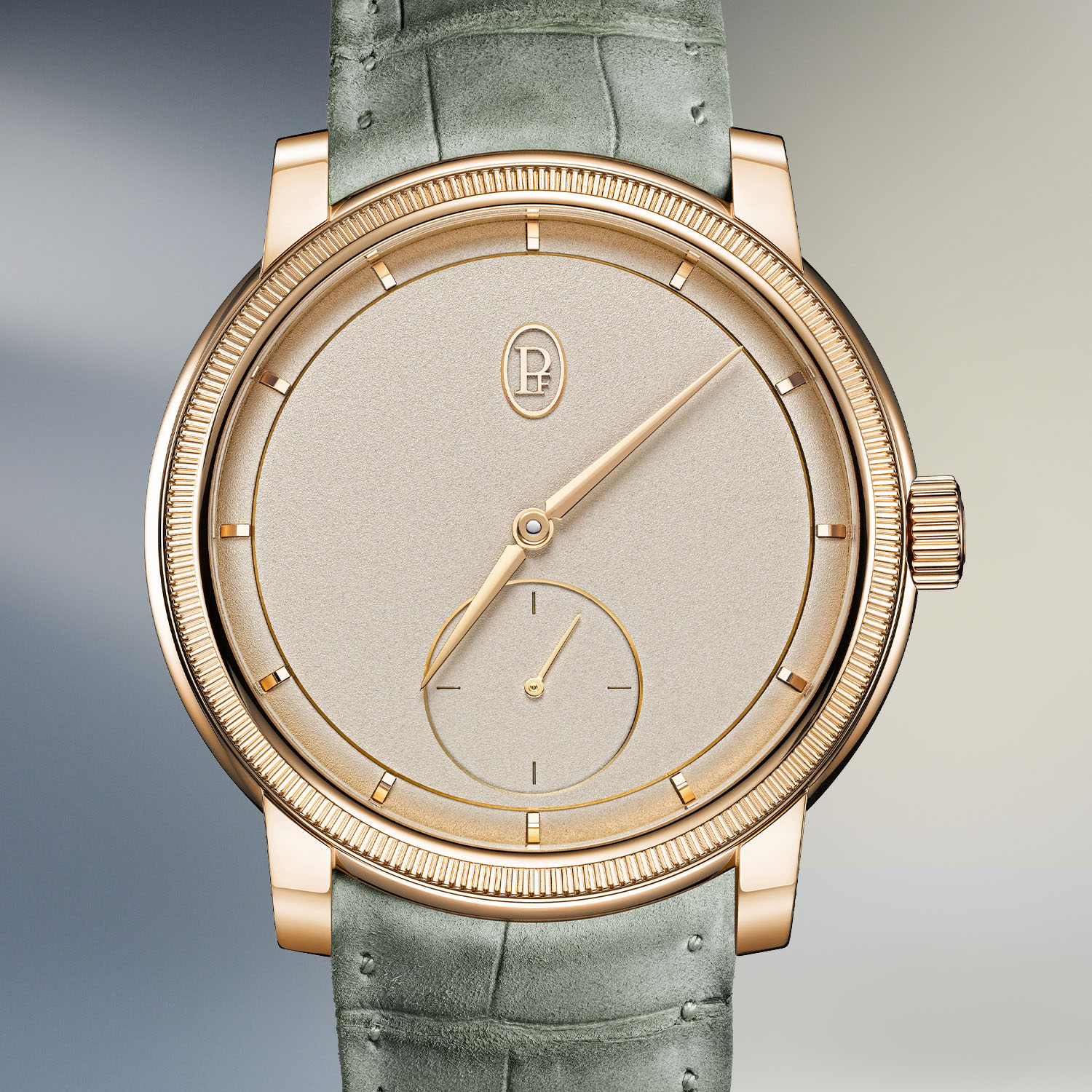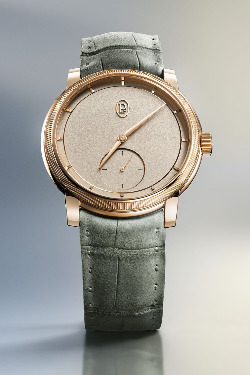 Quick facts: 40.6mm diameter x 8.8mm thickness – polished 18k rose gold or platinum, knurled bezel – 50m water-resistance – gold hand-grained dial, bevelled – gold hands and applied indices – small seconds at 6 o’clock – calibre PF780 – in-house, manual-winding – rose gold bridges and base plate – 28.4mm x 3.15mm – 157 components, 27 jewels – 28,800vph – 60h power reserve – hand-stitched alligator strap with rose gold or platinum pin buckle – ref. PFC940-2010001-300181 rose gold, CHF 49,500 – ref. PFC940-2010004-300181 platinum, CHF 56,500