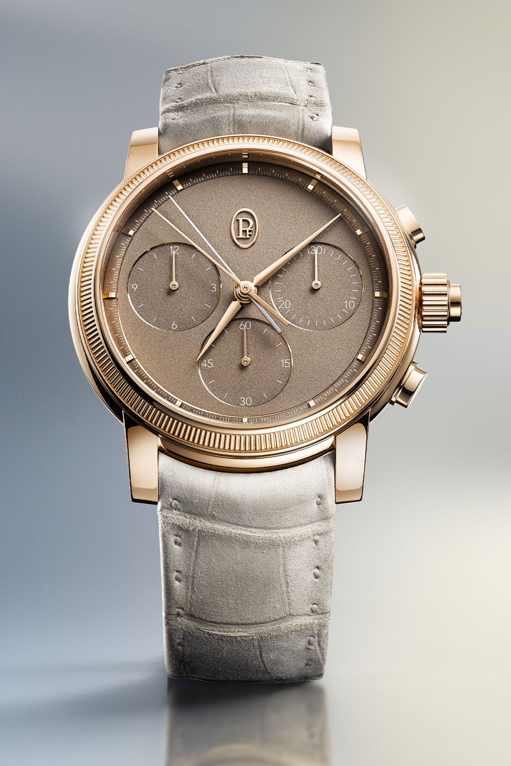 Quick facts: 42.5mm diameter x 14.4mm thickness – polished 18k rose gold, knurled bezel – round chronograph pushers – 50m water-resistance – gold hand-grained coffee-coloured dial – applied gold indices – rose gold hour and minute hands – 3 sub-dials – calibre PF361 – in-house, manual-winding integrated split-seconds chronograph with 2 column wheels – rose gold openworked bridges – 254 components, 35 jewels – 30.6mm x 7.35mm – 36,000vph – 65h power reserve – brown hand-stitched alligator strap with rose gold pin buckle – ref. PFH951-2010001-300181 – CHF 135,000