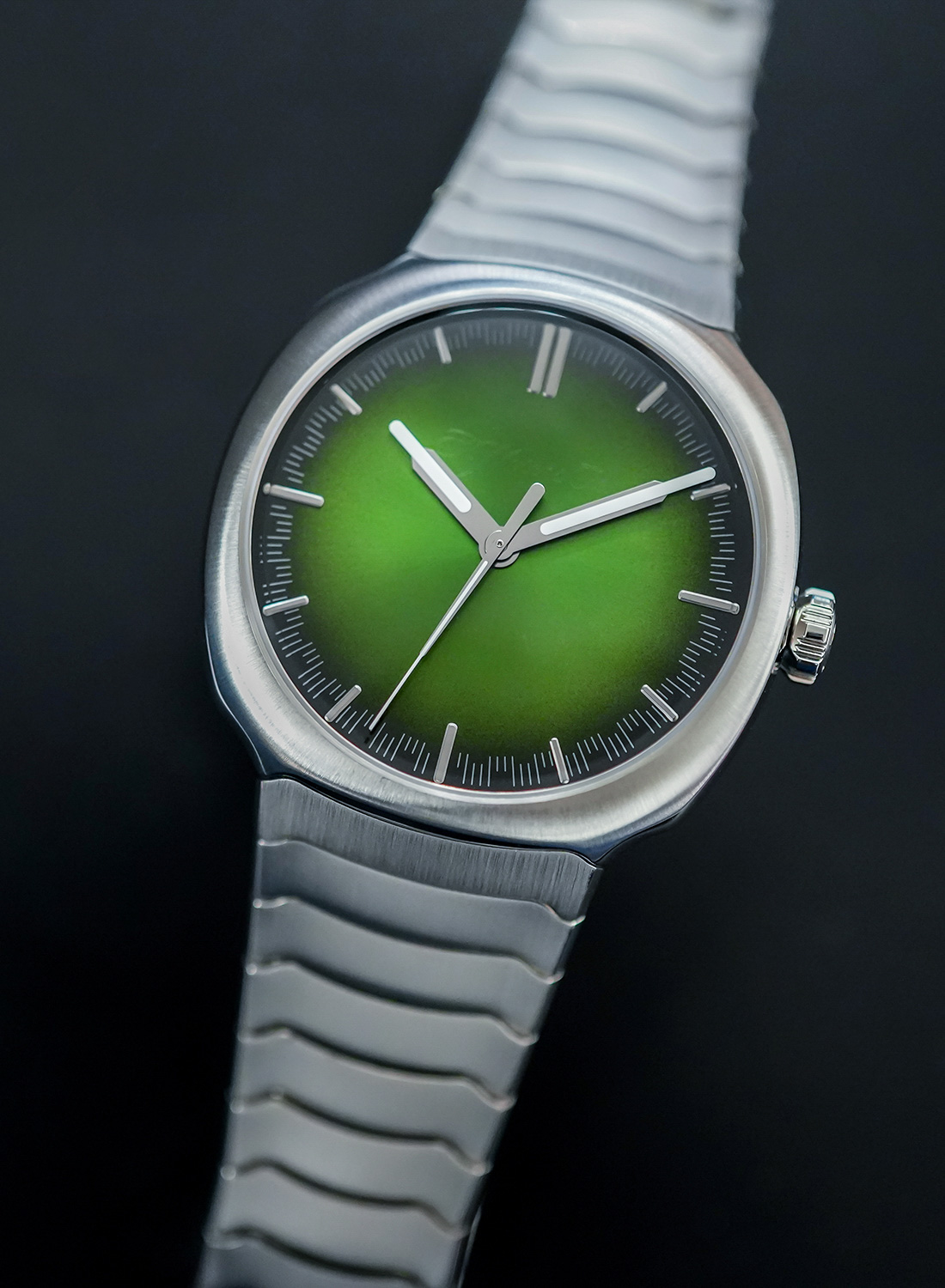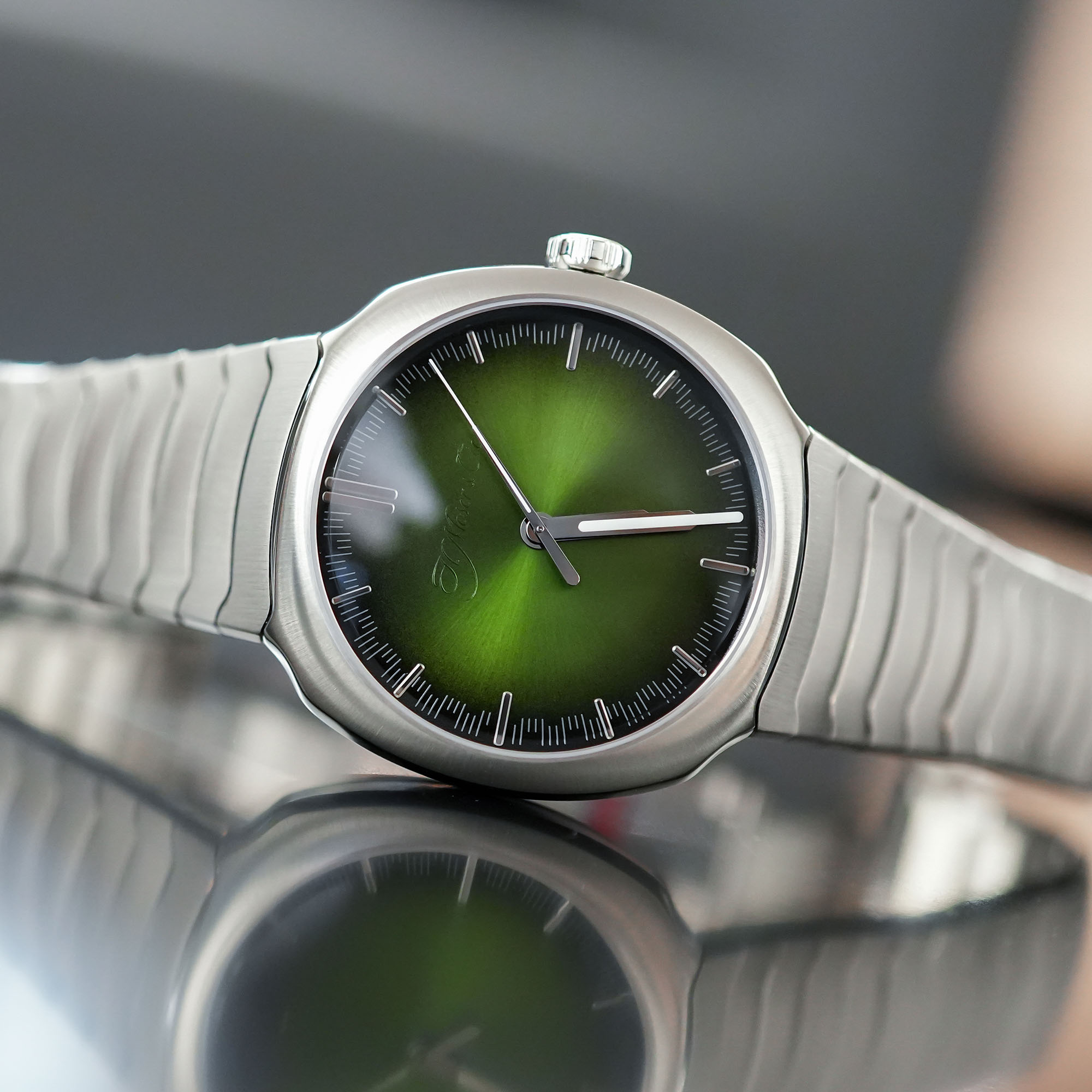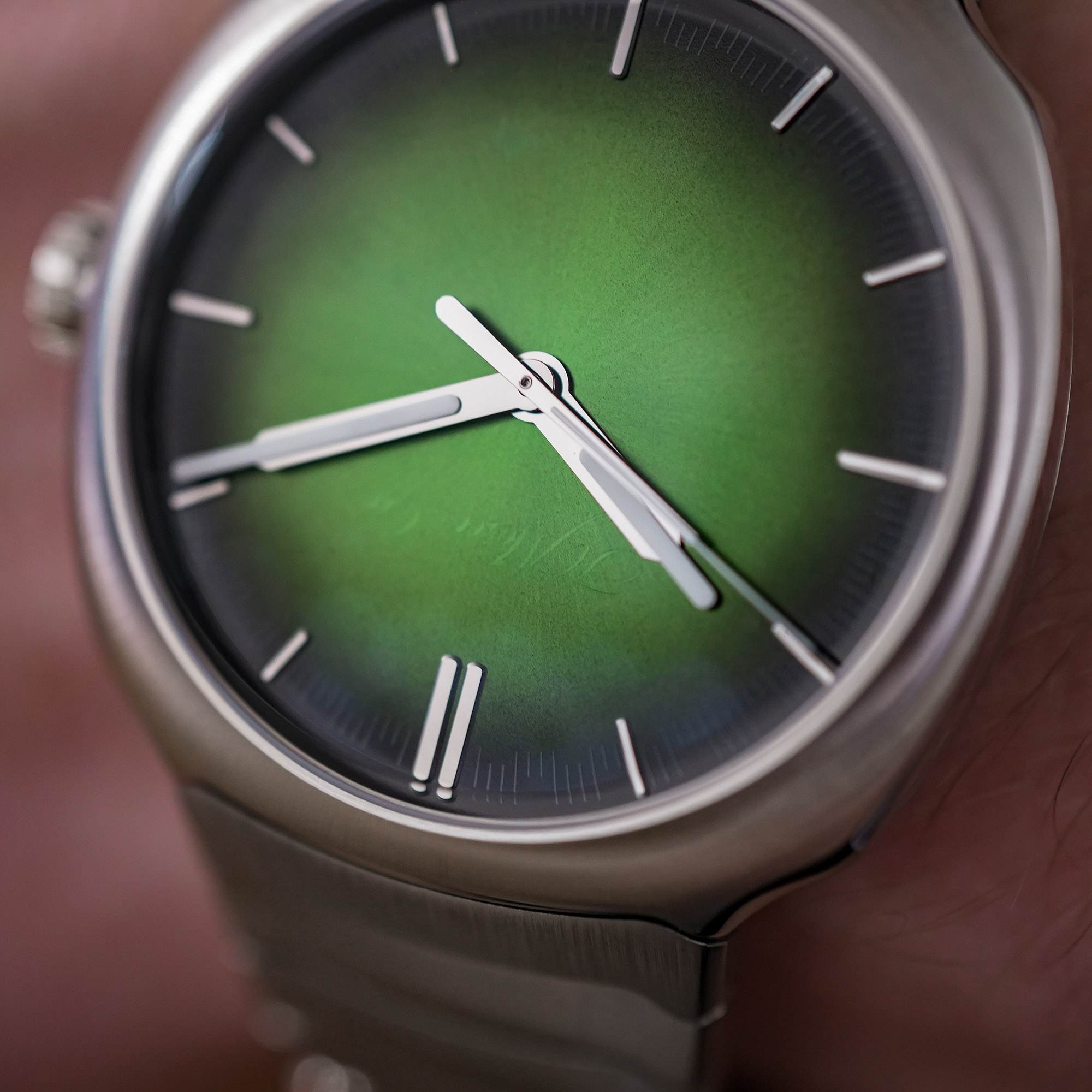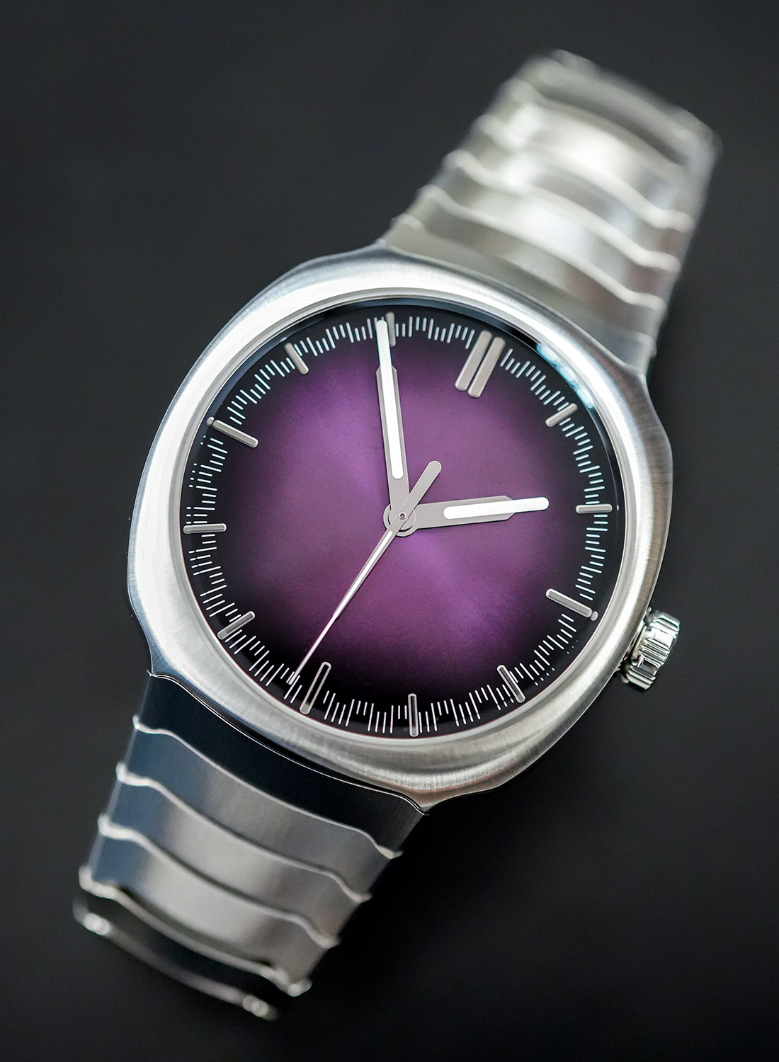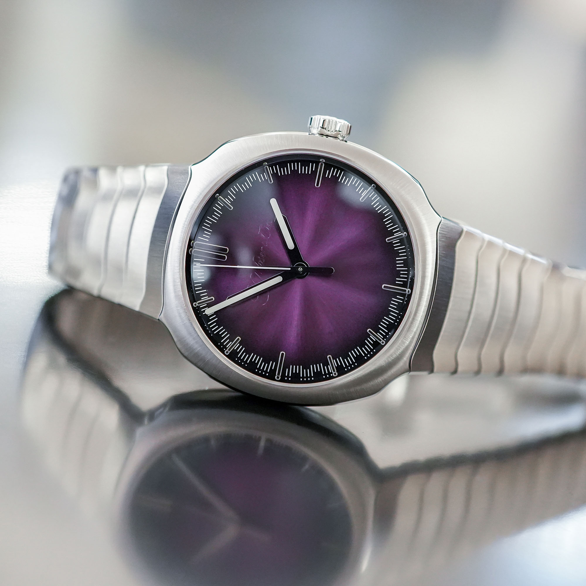 Moser’s Streamliner collection, a luxury sports watch with integrated bracelet, made a resounding entry in 2020 with a Flyback Chronograph. Unlike many luxury sports watches on the market, which vie for attention with their formulaic solutions, Moser’s design was fresh, verging on sensual thanks to its sleek, aerodynamic personality. A few months later, Moser unveiled a simpler time-only model known as the Streamliner Centre Seconds with a beguiling Matrix Green fumé dial, nicknamed by collectors the “Green Dragon.” Despite huge demand for the Matrix Green model (and the funky Smoked Salmon model), Moser took a break to refine certain aesthetic features of the watch designed to increase viewing pleasure from both sides of the case. Today, Moser welcomes back the Green Dragon accompanied by a new and very tempting Purple Haze reference, with the Mark 2 Streamliner Centre Seconds.
