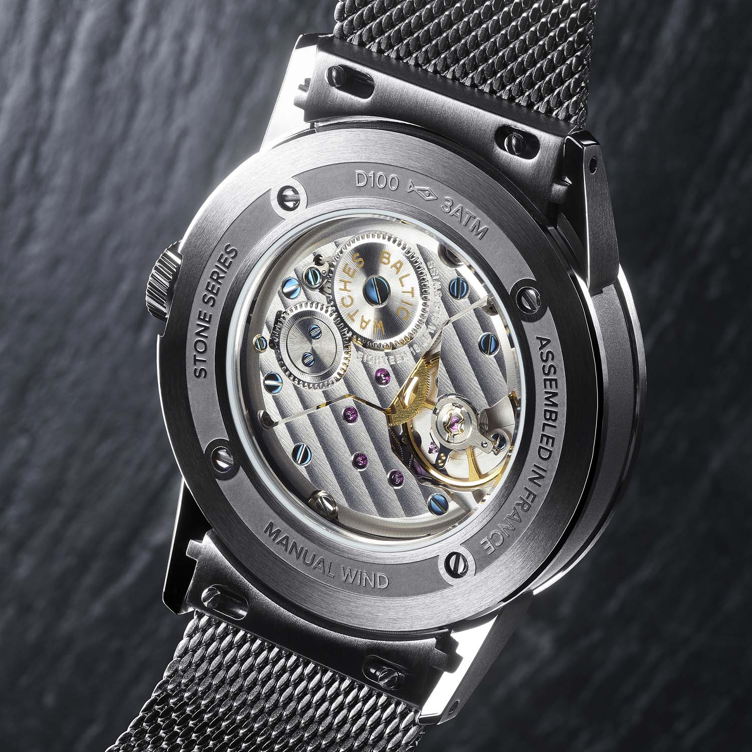 The Prismic Stone is delivered either on a slim Italian calf leather strap or on Baltic’s brushed braided mesh bracelet. The mesh follows the curvature of the case and wrist, uses a sliding clasp for easy adjustment, and both options feature quick-release spring bars.