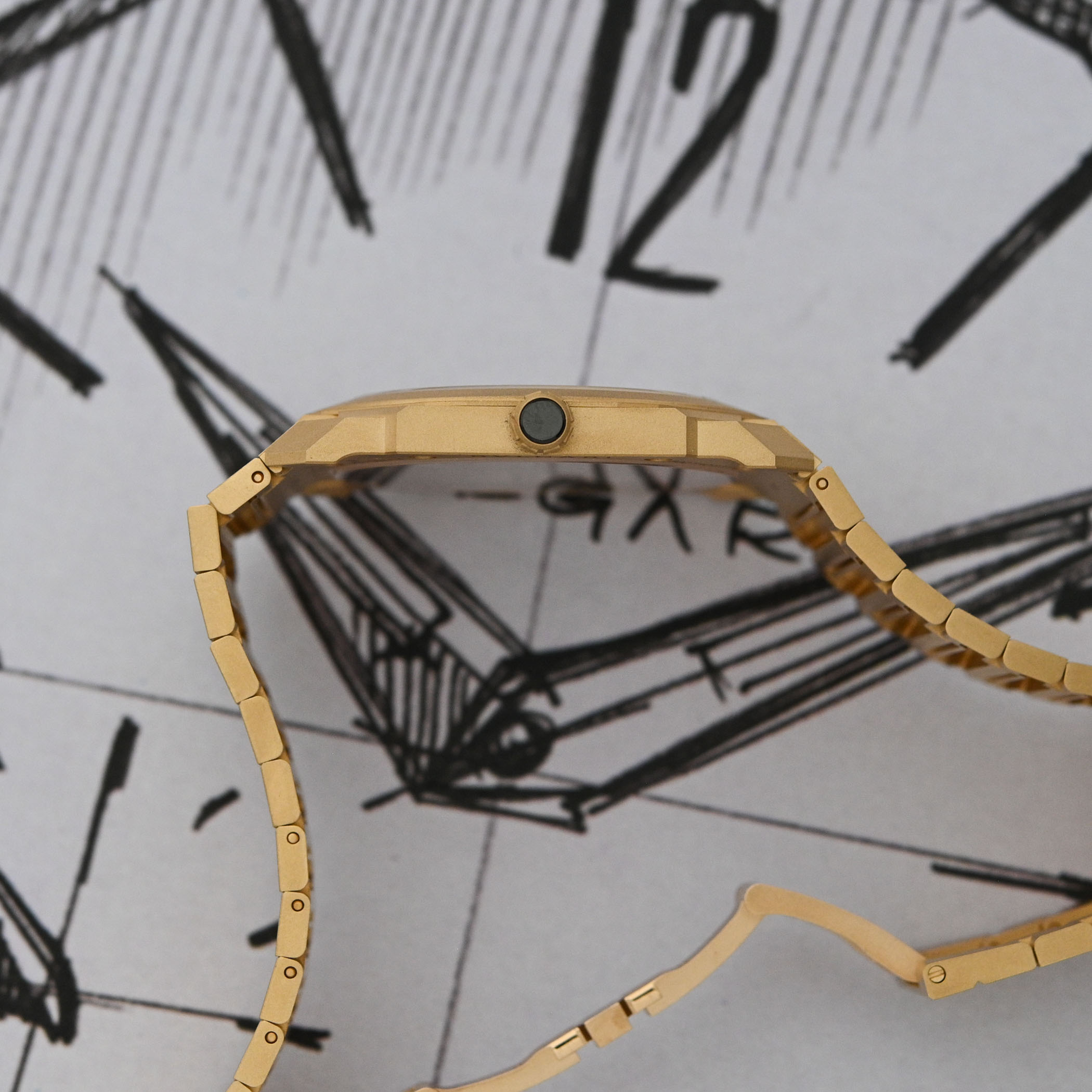 In typical Bulgari OF vibe, the dial is made in the same material and finish as the case. Here, we’re talking sandblasted yellow gold, with blackened hands and black markers for great visual impact and contrast (during the day, at least). The result is a watch that feels consistent, that has a true “one-piece” effect. Additionally, yellow gold, whether sandblasted or not, will never possess the discretion of a white metal; there is something subtle, a restrained, luxurious effect that feels more understated, sartorial, and modern. This look continues on the bracelet, also made of 18k yellow gold.