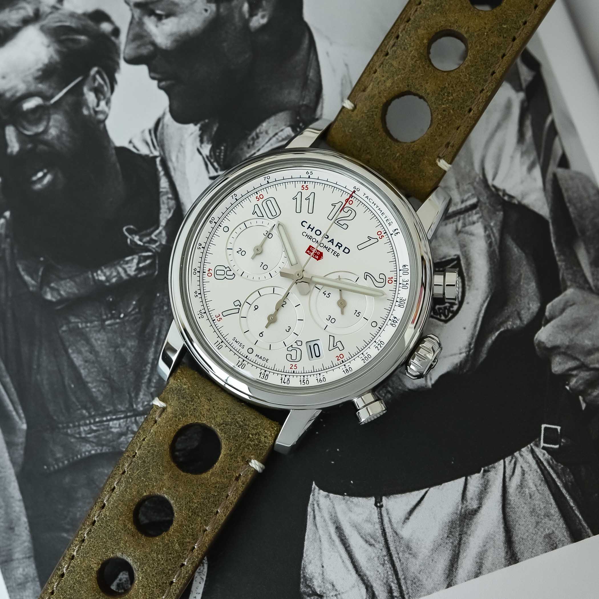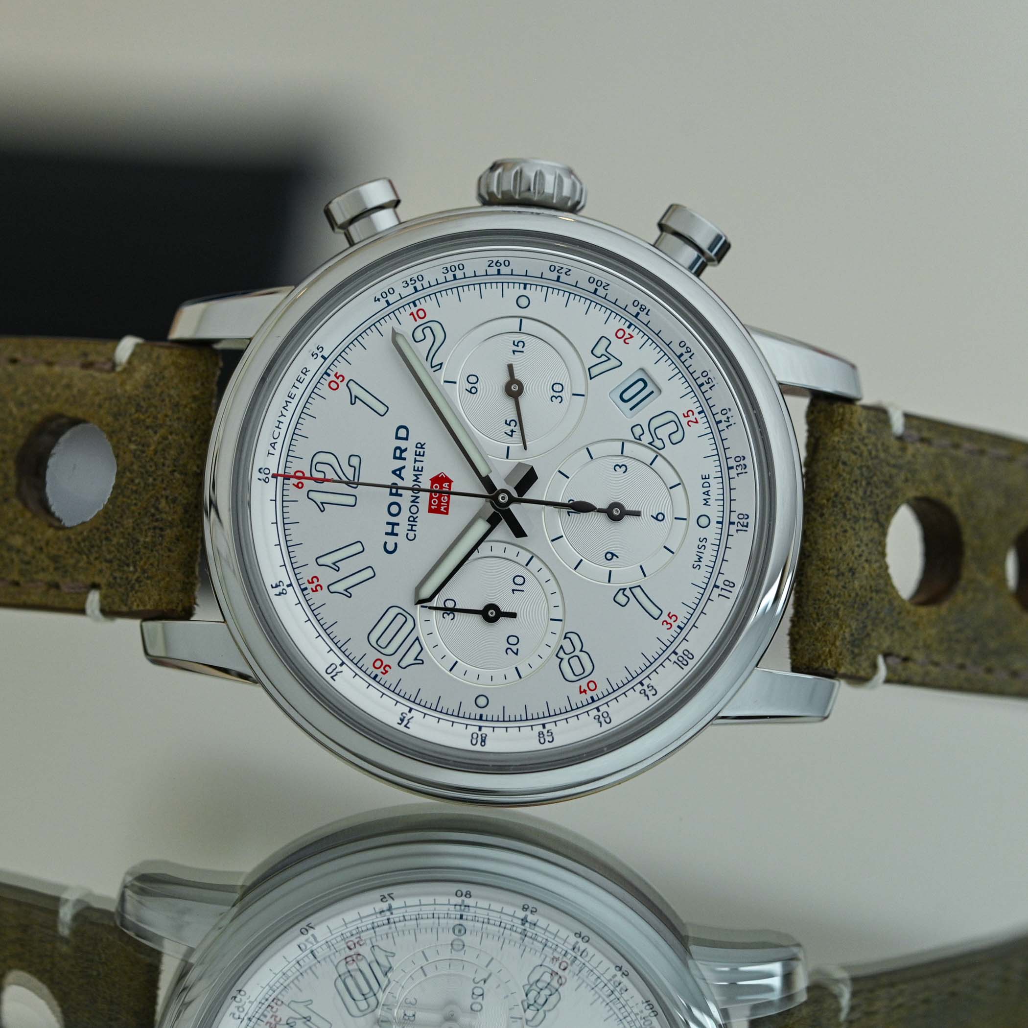 Fitted with a peripheral tachymeter scale, the chronograph seconds hand has a red tip, matching the 1000 Miglia logo below noon. The tricompax chronograph layout has small seconds at 3 o’clock, a 12-hour counter at 6 o’clock and a 30-minute counter at 9 o’clock, while an angled date window sits between 4 and 5 o’clock.