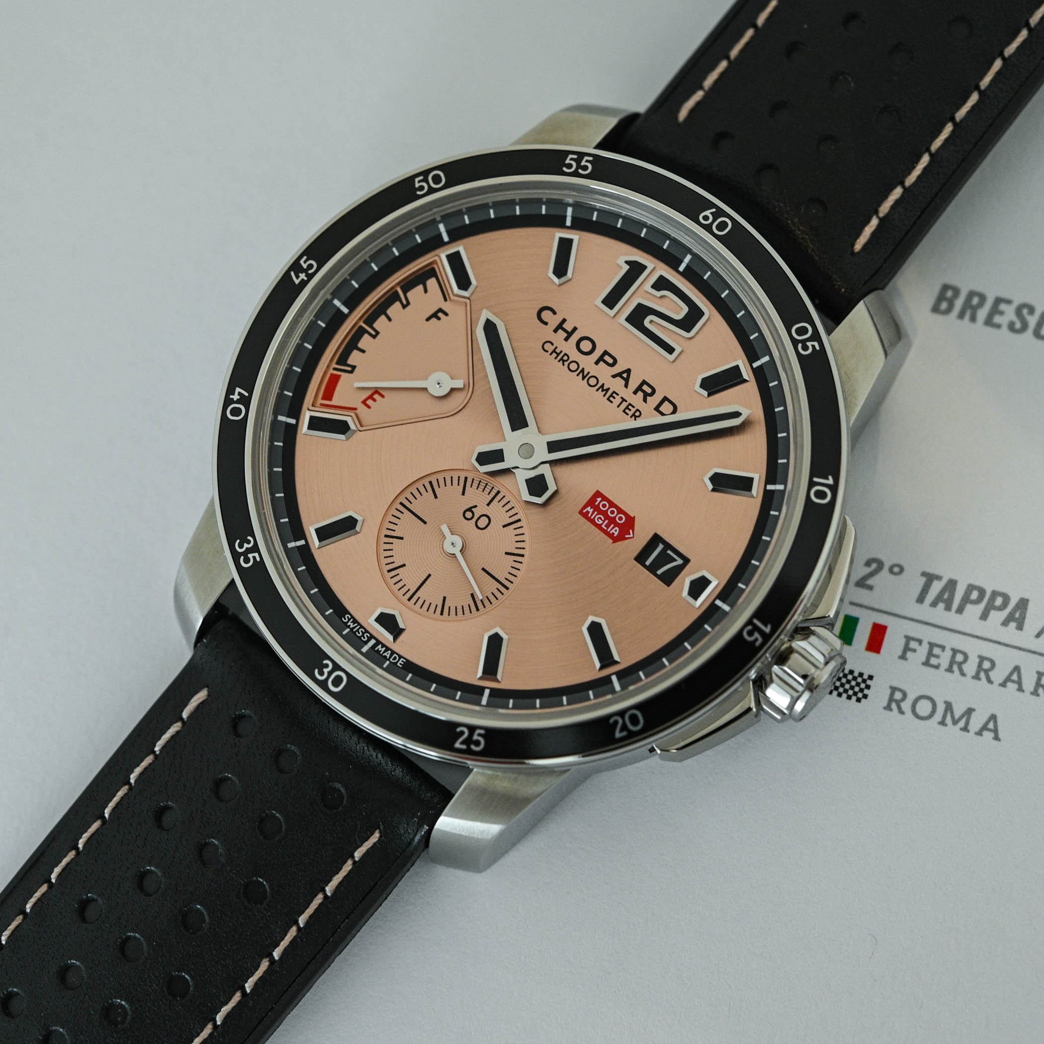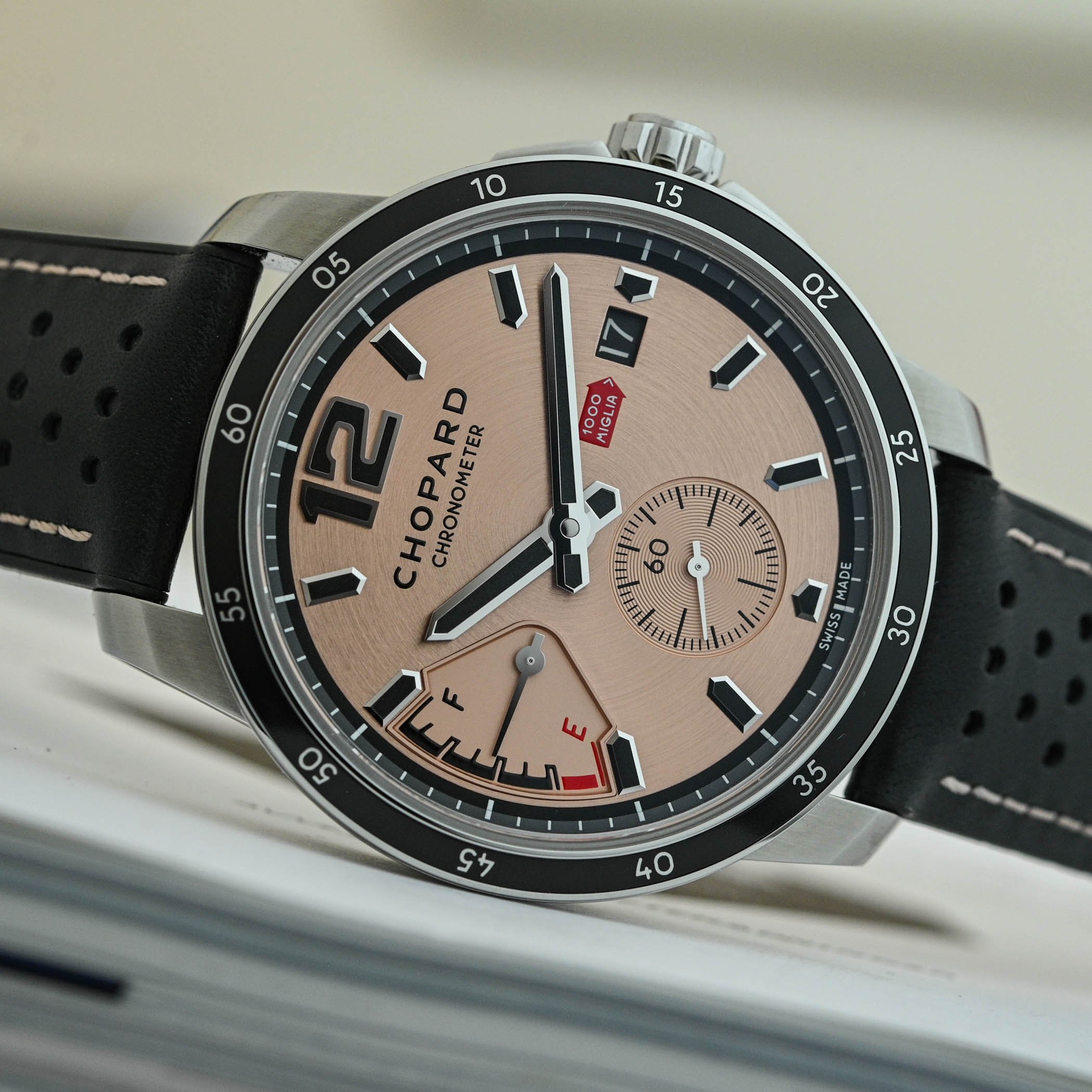 The striking salmon dial features a black aluminium bezel, hands and hour markers for vivid contrast. A novelty of this edition is the snailed small seconds counter, replacing the large Arabic 6 of former editions. The iconic Mille Miglia red arrow pointing to the date window is retained along with the signature fuel gauge-style indicator between 8 and 10 o’clock, which tracks the 60-hour power reserve of the tank. The applied and faceted hour markers and hands are all filled with black Super-LumiNova, ensuring excellent legibility in low light conditions.