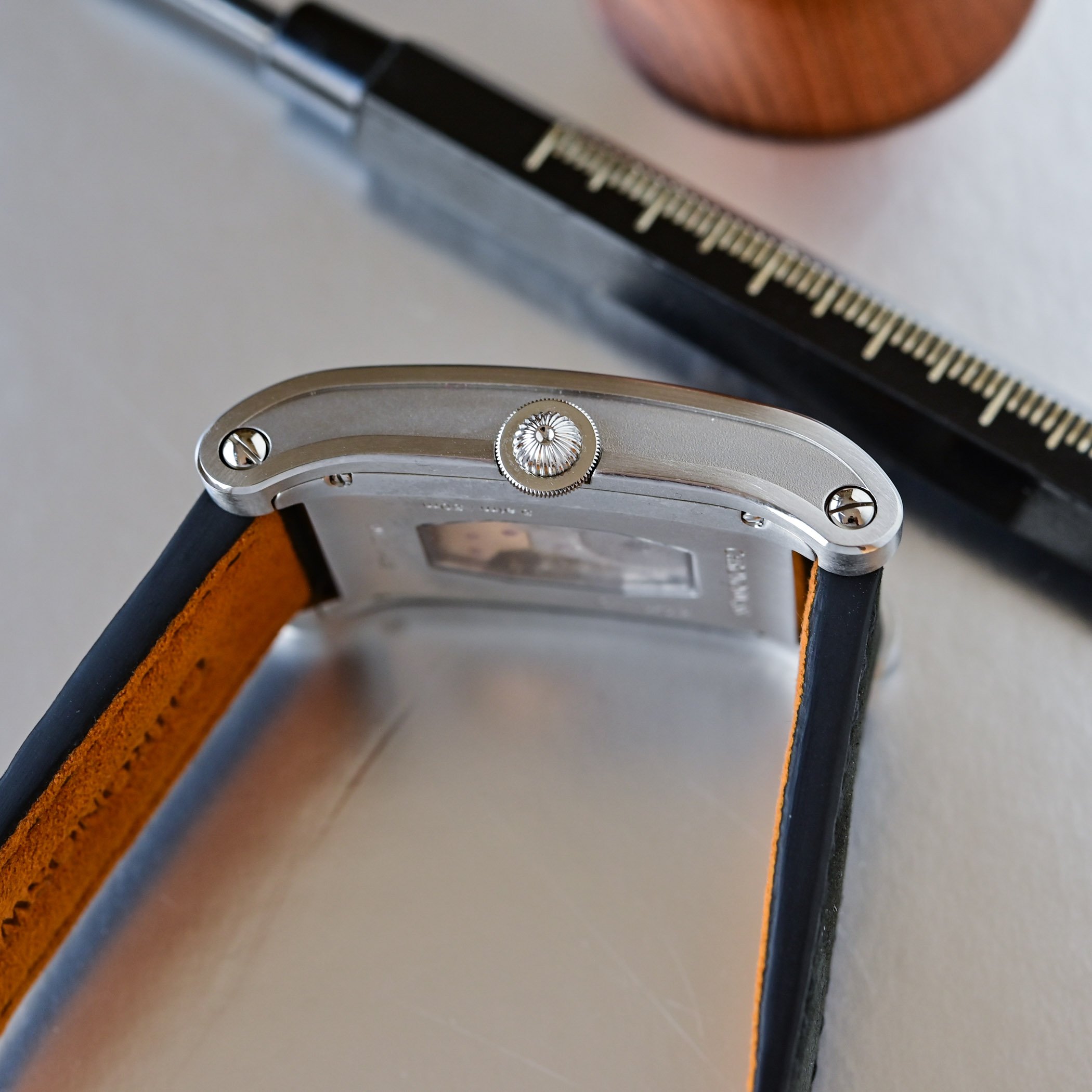 The Neo Digiteur’s 48mm by 30mm rectangular case feels sculpted and wearable. Surfaces play with light: satin matte surfaces, polished edges, and a sandblasted horizontal band on the flanks that slims the profile. The screw-in lugs underscore the build’s precision. At 9.7mm thick and 48mm lug-to-lug, it sits flat, more than you’d expect. The brand’s signature onion crown has been reshaped, flatter for better grip and cleaner integration. The case is topped with a sapphire crystal; the back is a screwed sapphire window. Water-resistance is rated at 50m.