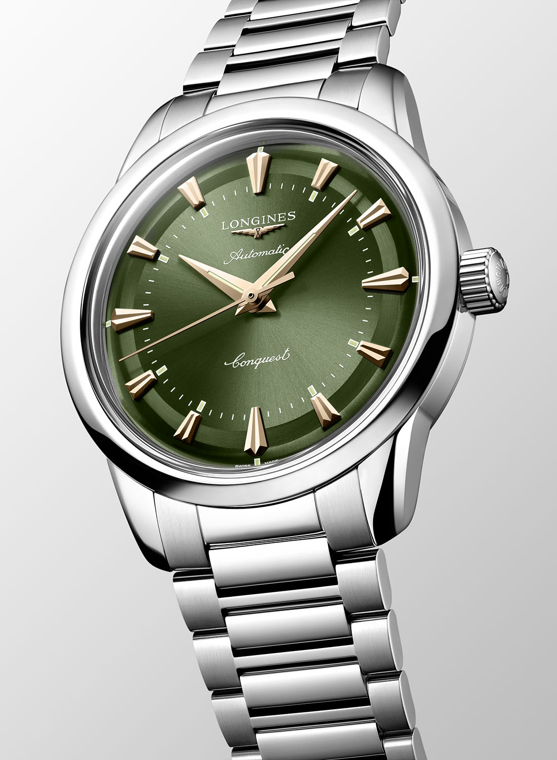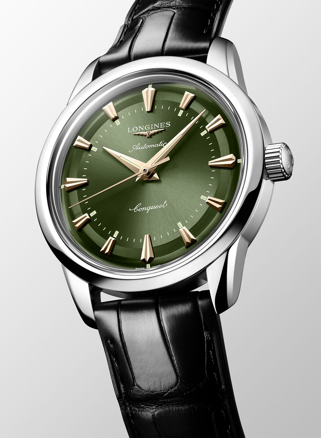 The other major update to the Conquest Heritage collection, in addition to the new colours, is the possibility to now wear the watch on a H-link steel bracelet with polished and brushed surfaces. Adding a touch of sportiness, it is closed by a folding clasp with a micro-adjustment system. If you prefer something more elegant, all references can also be worn on a black or brown alligator leather strap with heritage-inspired steel pin buckle.
