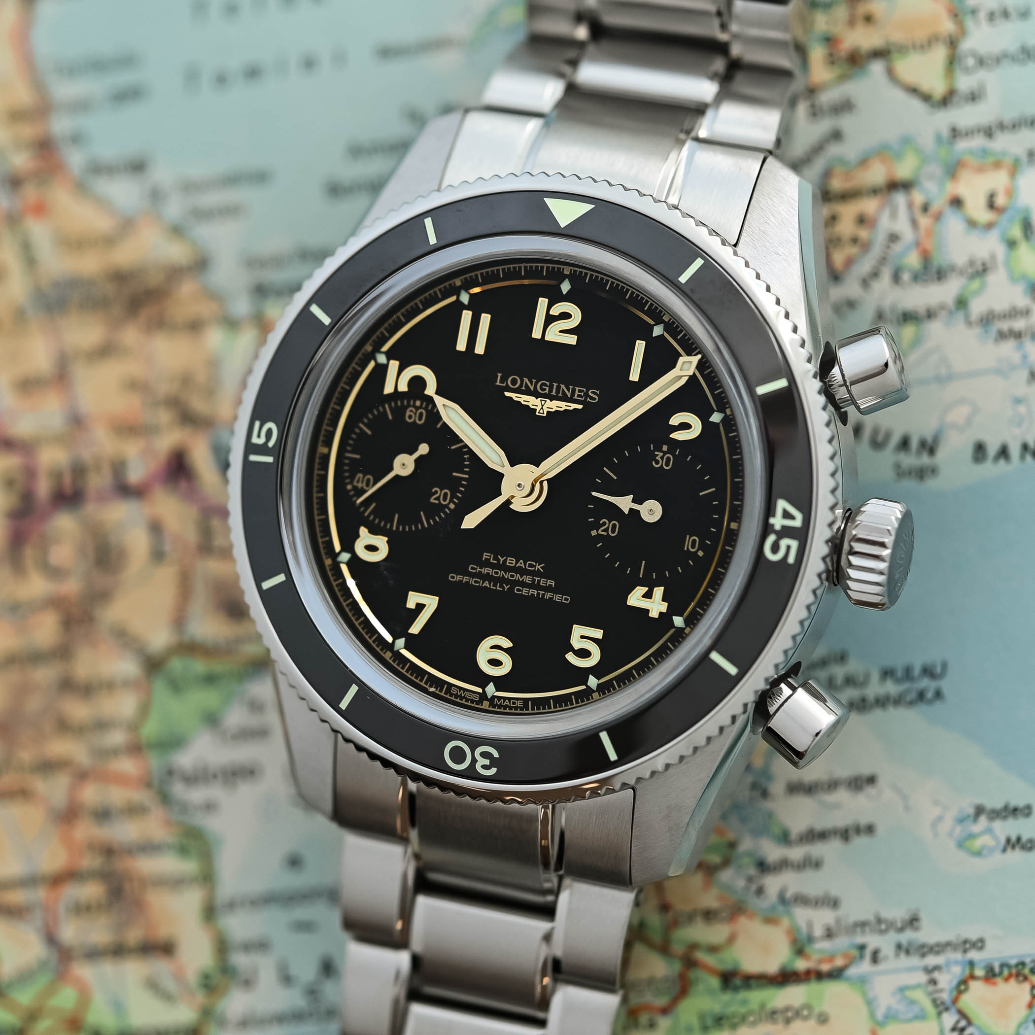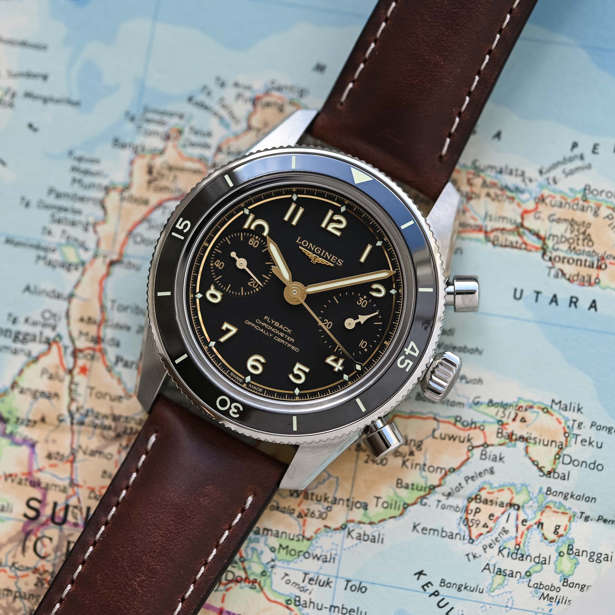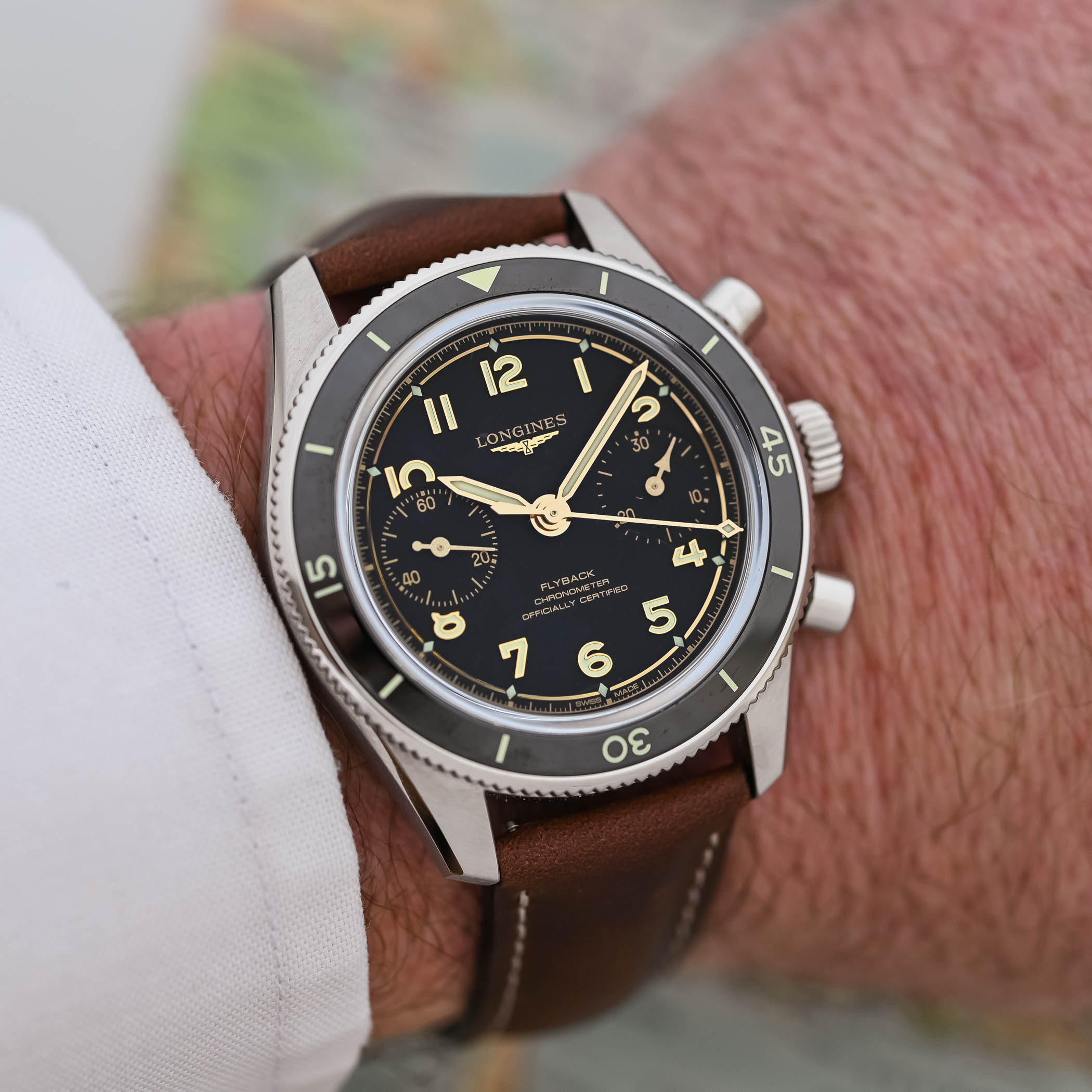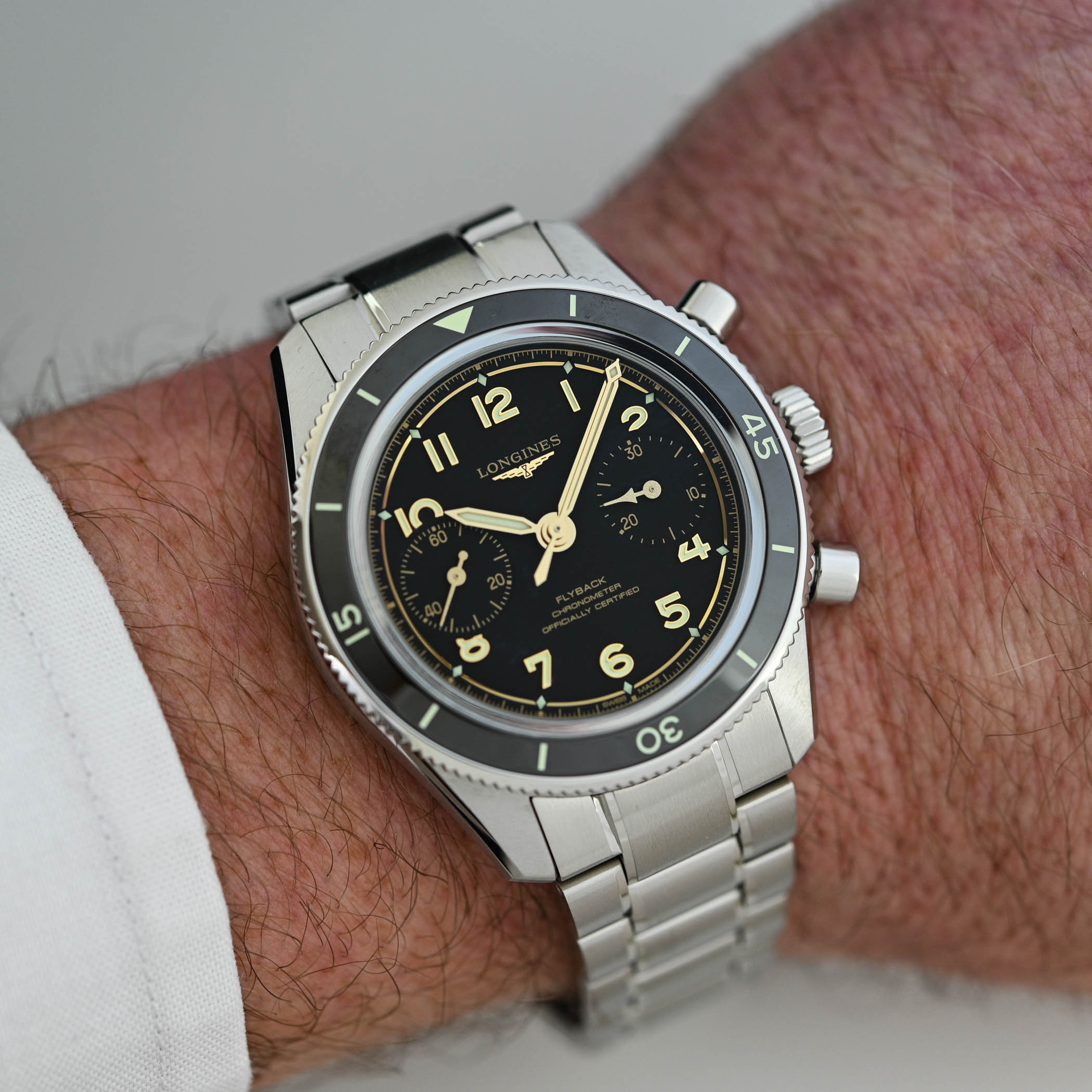 I’m happy to present this new Spirit Pilot Flyback, as it marks a drastic evolution for the collection, in particular regarding the proportions of the watch. Thanks to a hand-wound movement, the case has been significantly reduced, both in diameter (39.5mm, minus 2.5mm), in thickness (13.4mm, minus 3mm to 3.5mm), and in length (47.40mm, minus 2mm to 4mm), resulting in a sleeker and much more comfortable watch on the wrist. And despite the smaller case, Longines includes a rotating bezel with a ceramic insert, which for the first time features a countdown timer. The latter frames a new vintage-styled box-shaped sapphire crystal, and, despite the absence of a screw-down crown, it is water-resistant to 100 metres.