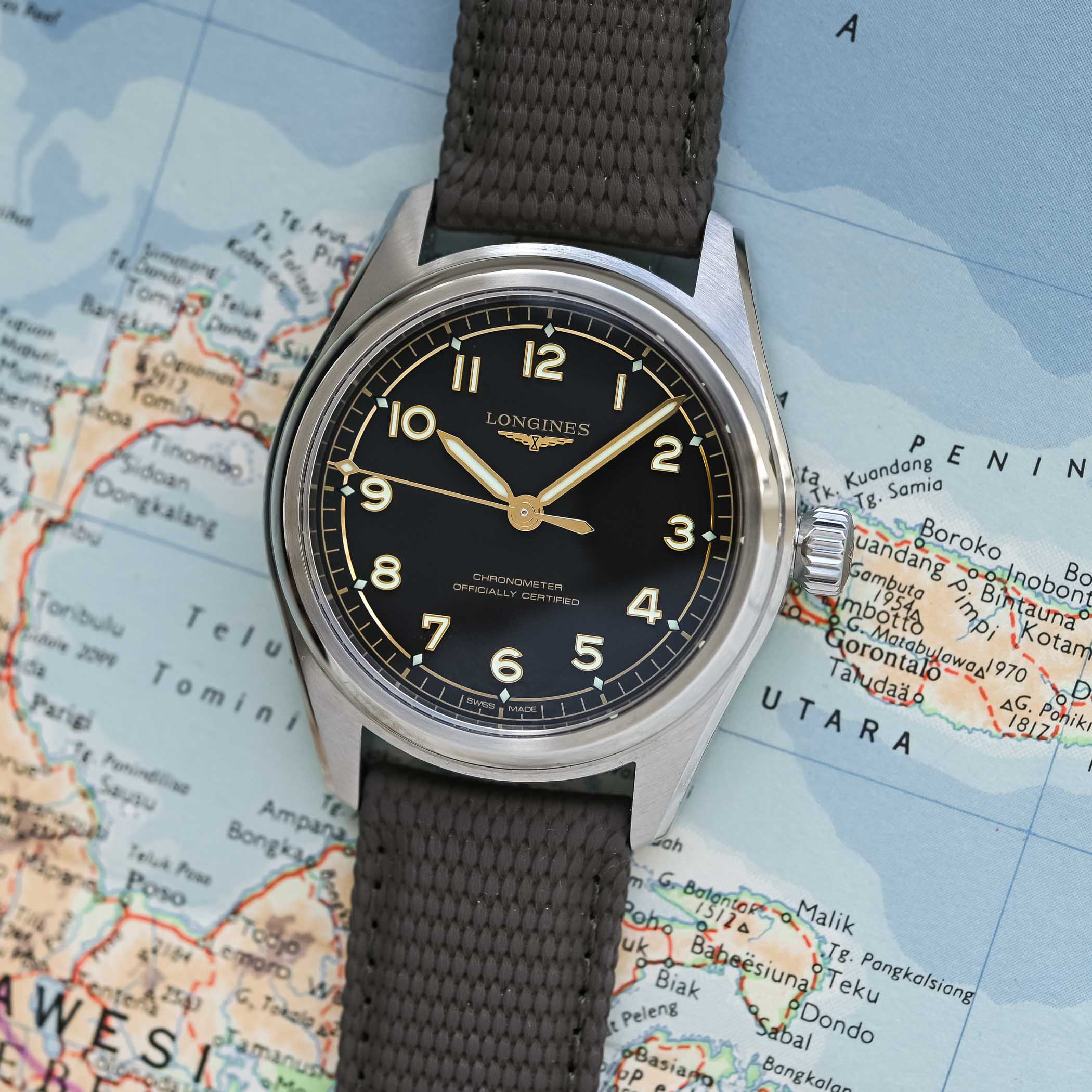 Under the solid caseback, no changes. The Spirit Pilot relies on the Longines-exclusive calibre L888.4, an evolution of the ETA 2892 beating at 3.5Hz, featuring a magnetic-resistant silicon hairspring and delivering 72 hours of power reserve. Its precision is certified by the COSC. This version is offered in a variety of styles, with a 3-link steel bracelet or a brown leather strap. Both are equipped with an interchangeability system and a micro-adjustable folding clasp. Alternatively, you can opt for a textile-style green rubber strap with a pin buckle. Prices are EUR 2,950 on steel bracelet, EUR 2,700 on leather strap and EUR 2,600 on rubber strap.