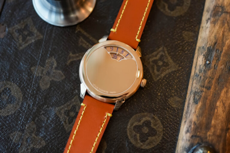 Let’s start with the obvious. The new Louis Vuitton Monterey (yes, it’s now officially its name) is deliberately inspired by the old models and brings back the emblematic pebble-shaped case of the past. Made at La Fabrique des Boitiers, the shape of the new Monterey stays true to the original version. The fully polished, super-smooth case, made of 18k yellow gold, measures 39mm in diameter. It’s not the thinnest of watches, though, at 12.2mm without the sapphire crystal. It’s a deliberate design choice of LV, but I’d love to see it under 10mm. It also retains the same position for the crown at 12 o’clock, but it’s been widened and redesigned with a clou de Paris pattern.