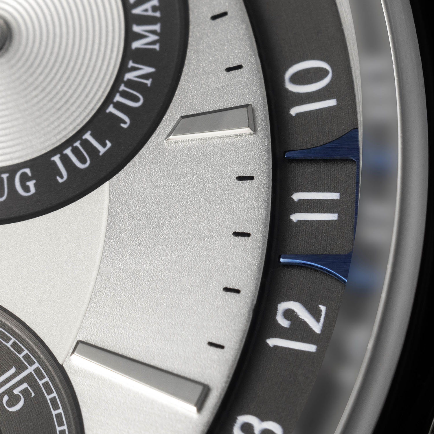 The dial of the Moritz Grossmann Perpetual Calendar, once again classic for the brand, is available in 3 colours: silver (argenté) or anthracite for the rose gold models, and silver with anthracite accents (date and sub-dial rings) for the platinum edition, resulting in a slightly more modern appearance. At first, the watch feels like a classic perpetual calendar with 3 sub-dials. However, MG here brings some clarity in how the date is displayed, using an identical system as its GMT model. Instead of being placed in a small sub-dial, the date is presented on a ring running around the dial, with a full date scale from 1 to 31 printed on it. This improves legibility compared to a sub-dial but also compared to a classic pointer date, avoiding confusion with the hours and minutes hands. The date is highlighted by a cup-shaped indicator on the outside that marks the current date by framing it.