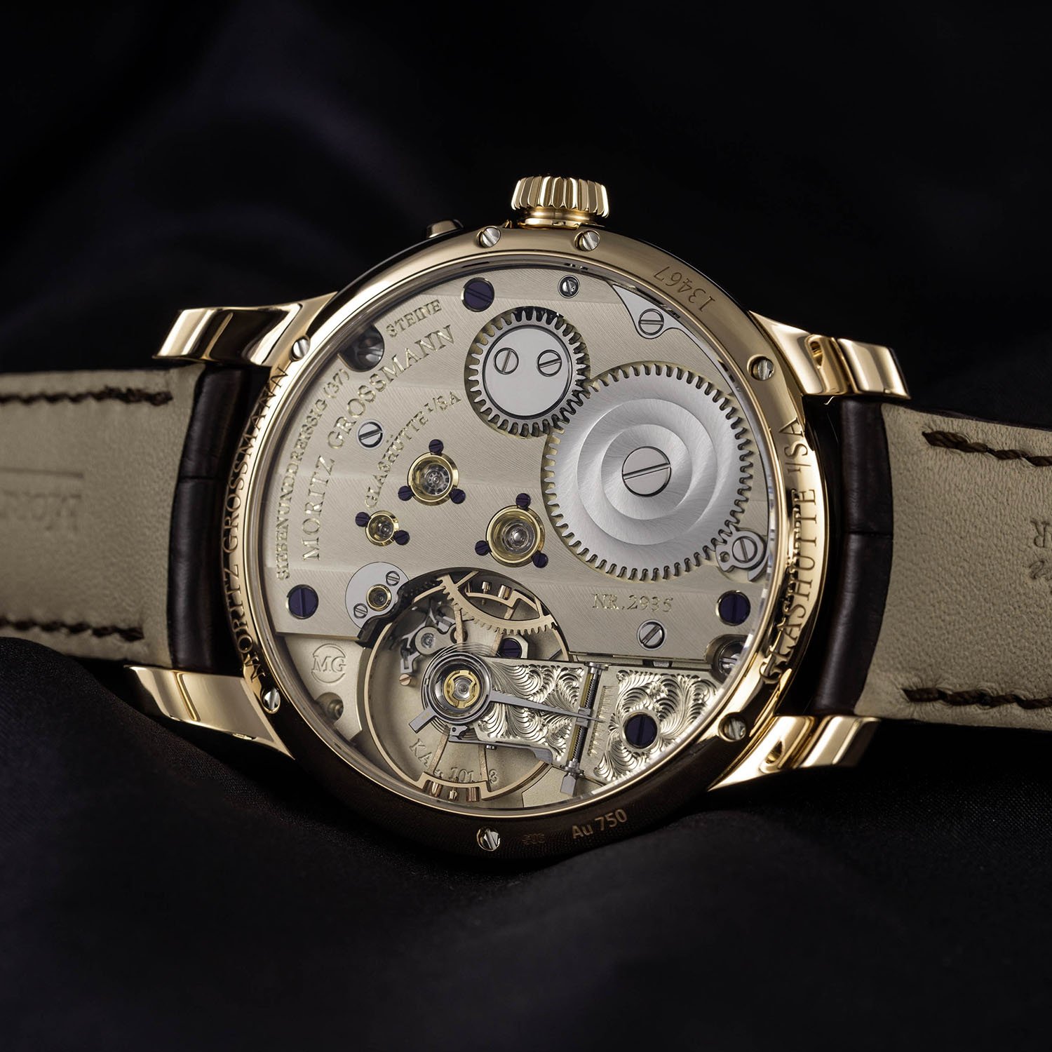 The month and day of the week are indicated in two sub-dials (3 and 9 o’clock) with azurage finish, just like the small seconds at 6 o’clock. Each of these sub-dials has a small window in its centre, one for the leap year indication, the other as a day–night display, making it easier to link the time with the date when setting the watch. Finally, the 12 o’clock position is reserved for the moon phase indication. It is set against a goldstone background, which is illuminated by small copper crystals. Time is indicated by classic Grossmann manually crafted hands in gold or heat-blued steel for the platinum edition.