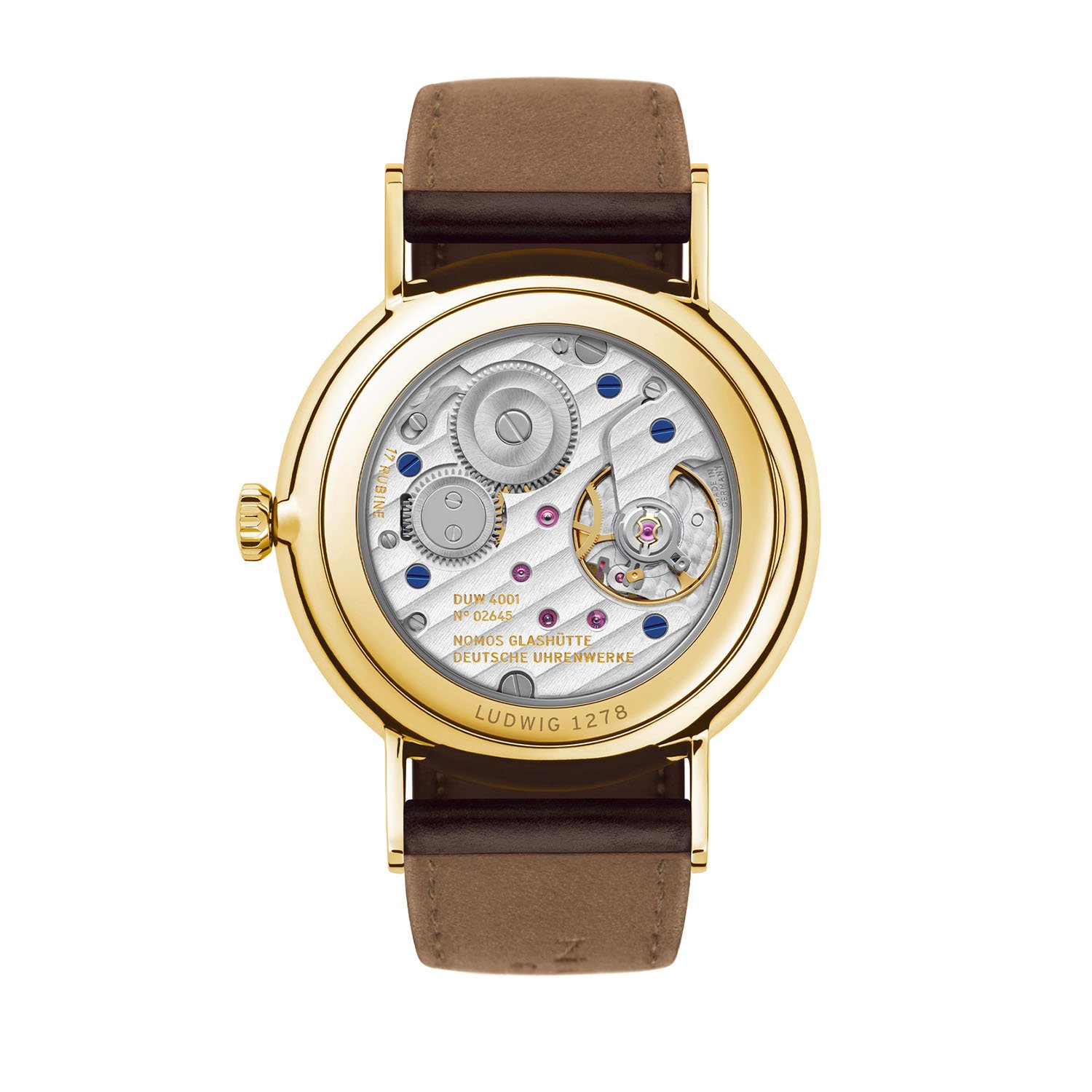 The second model to receive the gold treatment is the Ludwig, a slightly more discreet take on the original concept of Nomos. The Ludwig feels at first like a variation of the Tangente, but look closely and you’ll see notable differences. The Ludwig is softer, with a more rounded, slender case with a barrel profile, straight lugs and a domed sapphire crystal. Once again, the move to a gold case feels natural and reinforces the natural elegance of this collection.