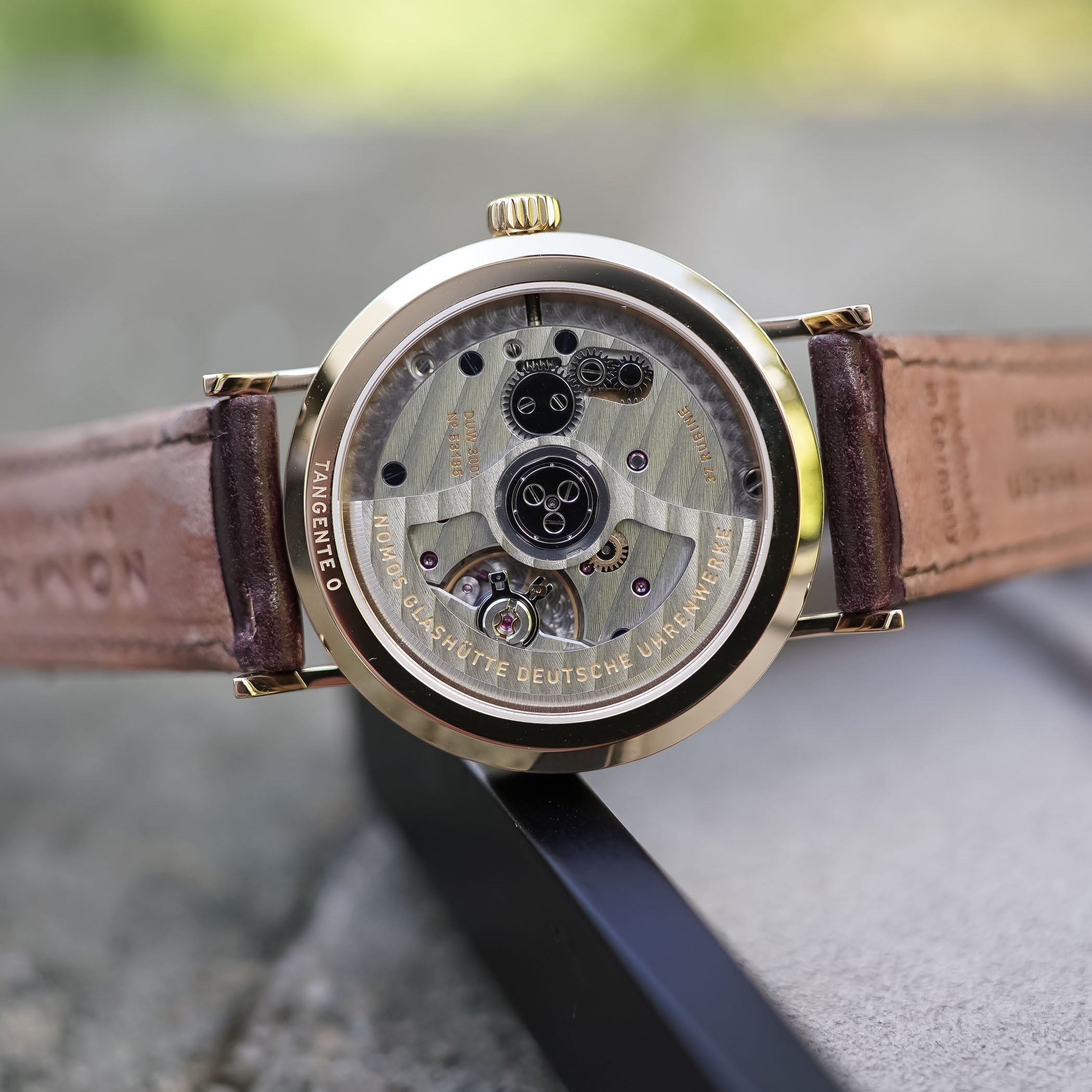 Seeing the icon of Nomos, the all-time classic Tangente, in a gold case feels somehow… natural. Indeed, with its restrained Bauhaus-inspired design, its compact proportions, its subtly original dial and its almost absence of bezel, the Tangente has always felt to me like a proper dress watch. So, being now made in precious metal only reinforces this feeling.