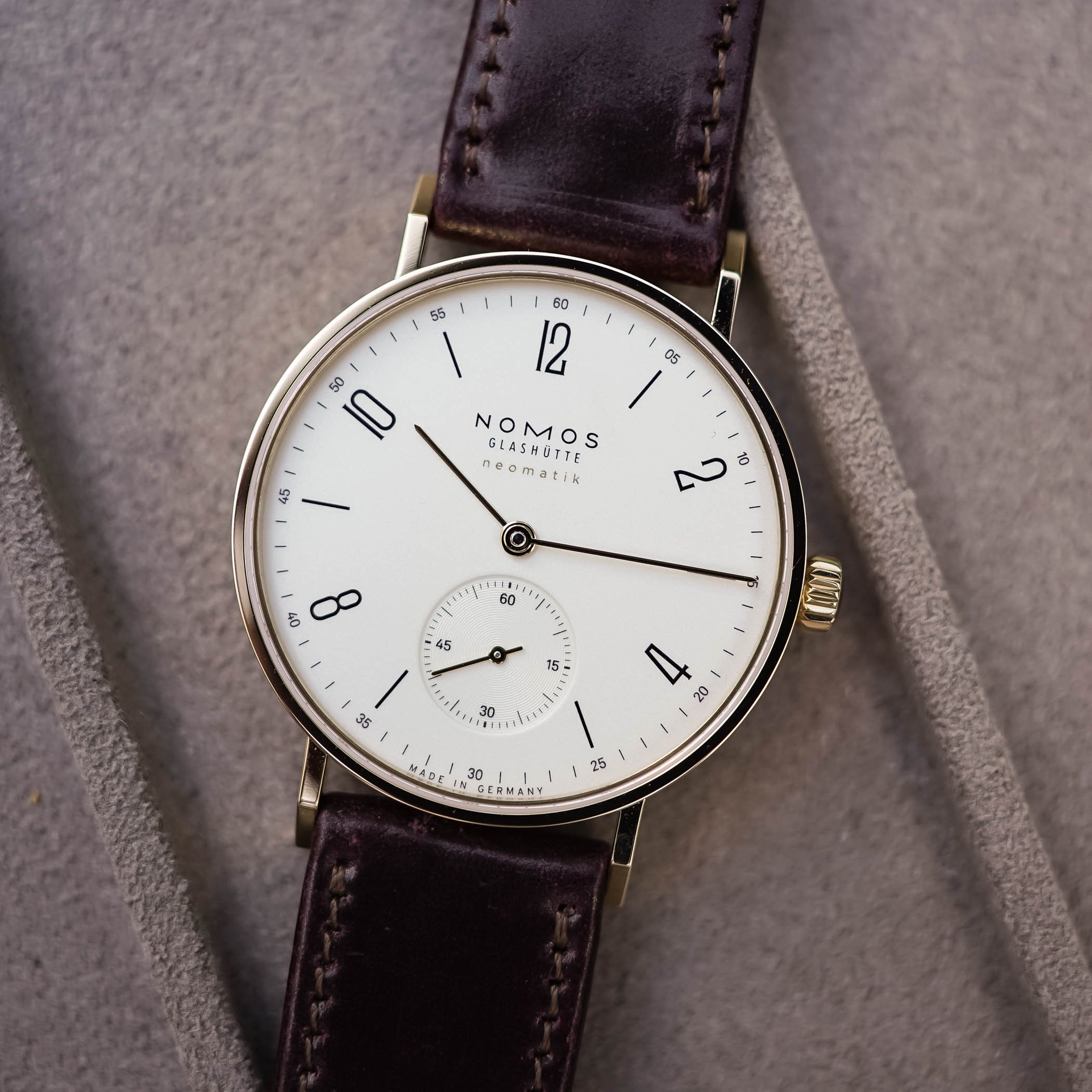 Seeing the icon of Nomos, the all-time classic Tangente, in a gold case feels somehow… natural. Indeed, with its restrained Bauhaus-inspired design, its compact proportions, its subtly original dial and its almost absence of bezel, the Tangente has always felt to me like a proper dress watch. So, being now made in precious metal only reinforces this feeling.