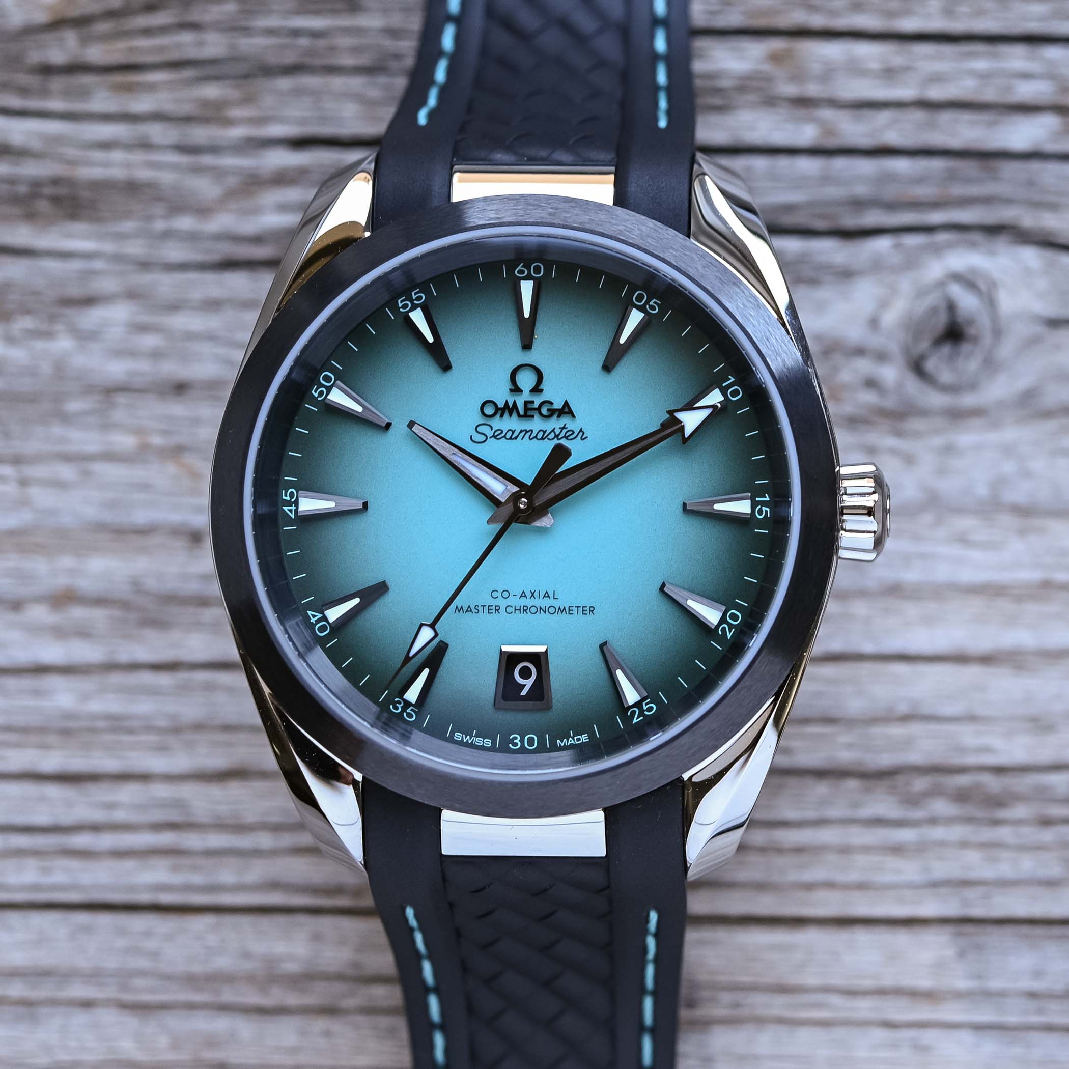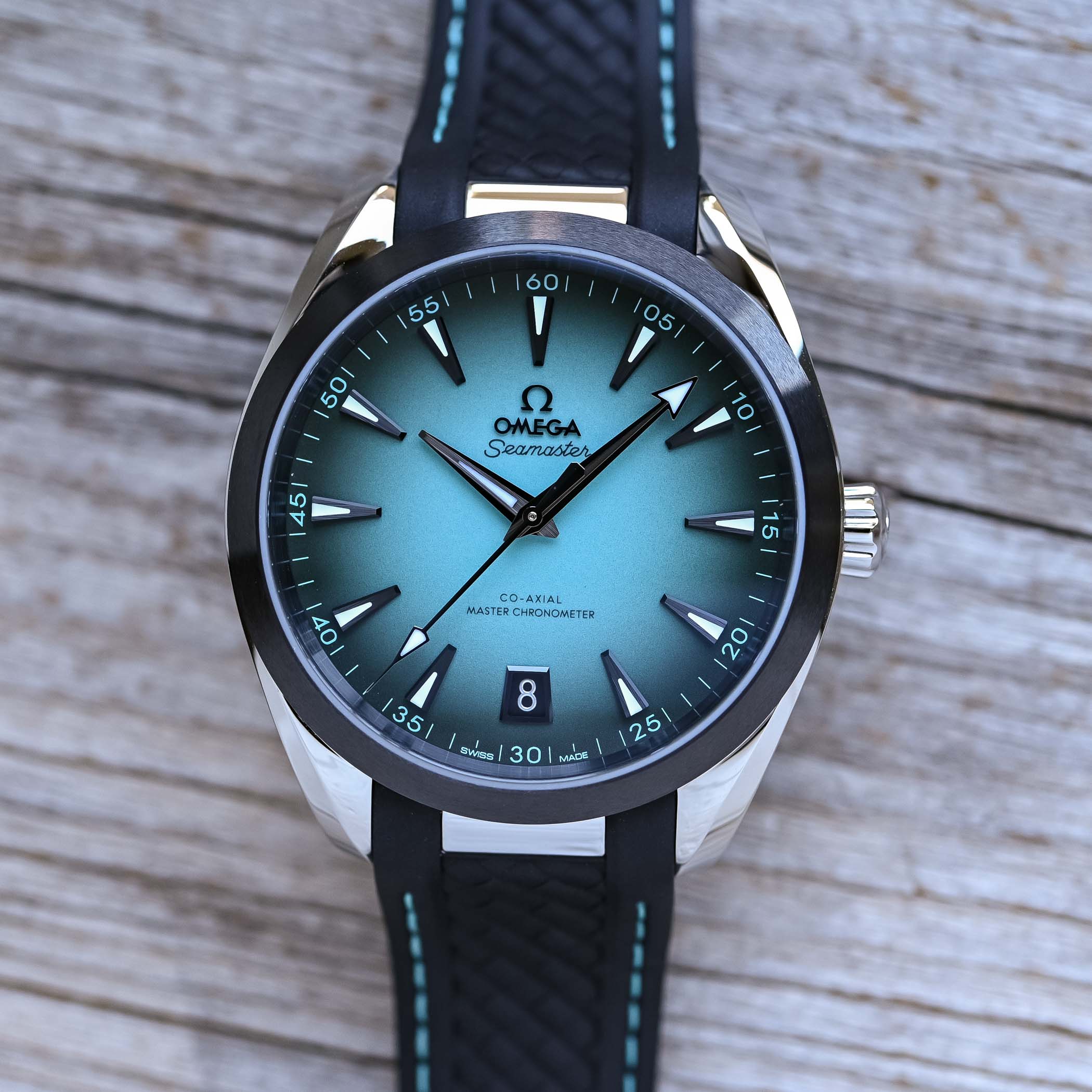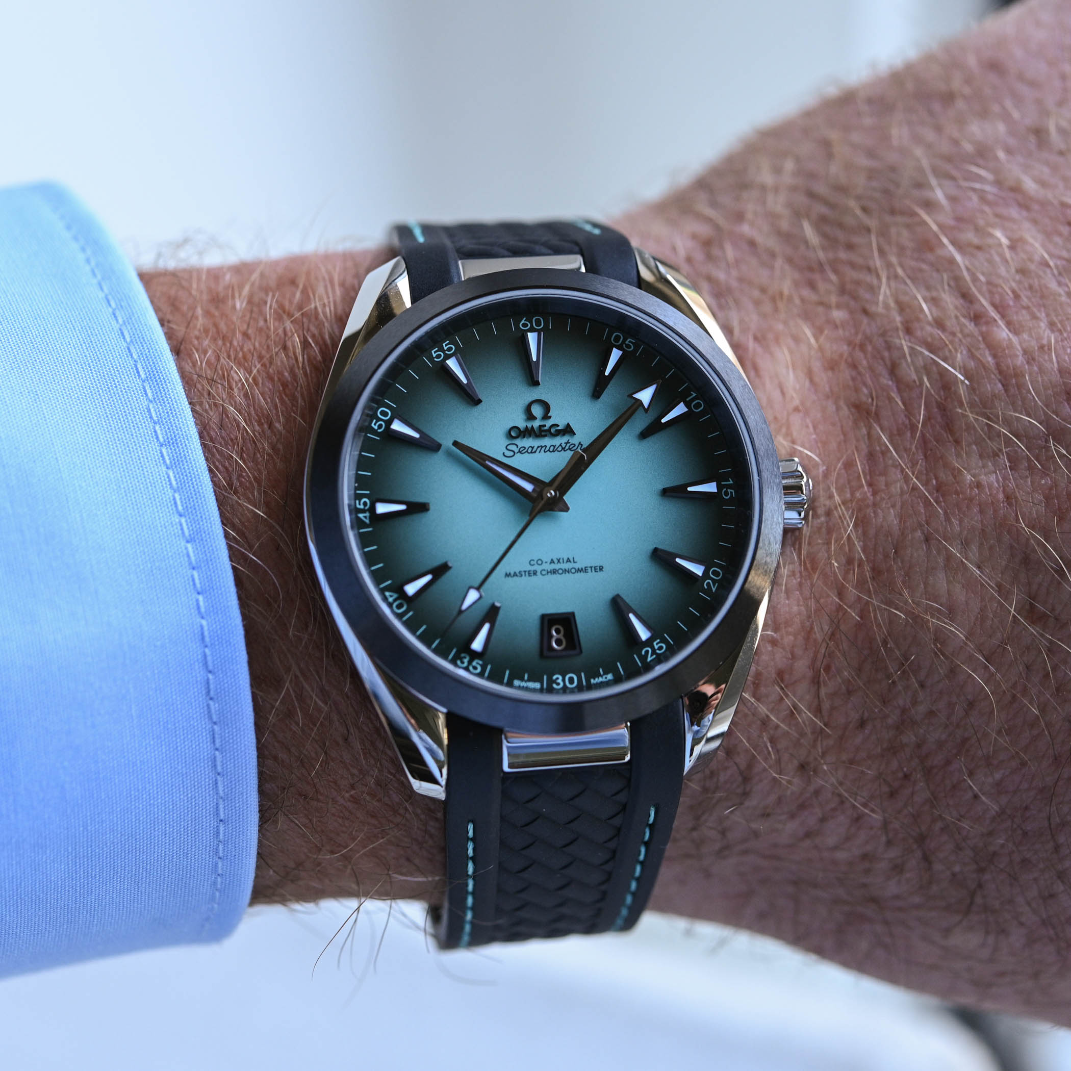 In short, Omega here expands the Seamaster Aqua Terra collection with ceramic bezels and integrated rubber straps, adding to last year’s steel bracelet models. And the brand retains the cool gradient turquoise dials that gave the collection a breath of fresh air. Changes are visual and focused on materials, as the technical base, that of all Aqua Terra models, remains identical. Available in the two classic sizes of this range, the middle case is here in its “shades” style, meaning entirely polished, with its signature lyre-shaped lugs, conical screw-in crown and wave-edged caseback. The smaller of the two measures 38mm in diameter, 12.36mm in thickness and 45mm in length. The larger edition is 41mm in diameter, 13.26mm in thickness and 48mm in length. And, as you’ve come to expect, water-resistance is rated at 150m.