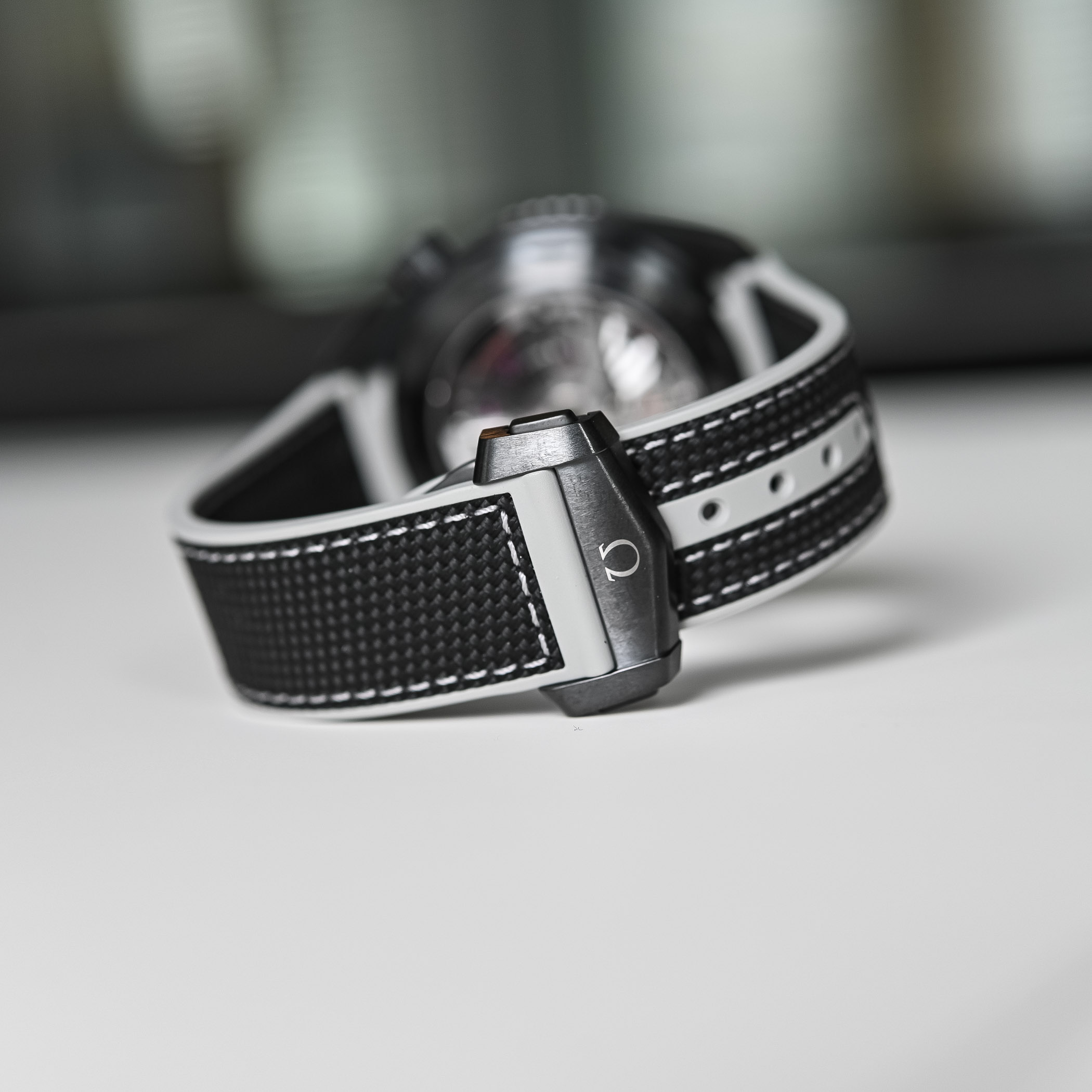 - A model with grey varnish, featuring polished, black PVD-coated hands and indexes filled with Omega’s new grey Super-LumiNova. This version has a two-tone grey-black strap with grey stitching