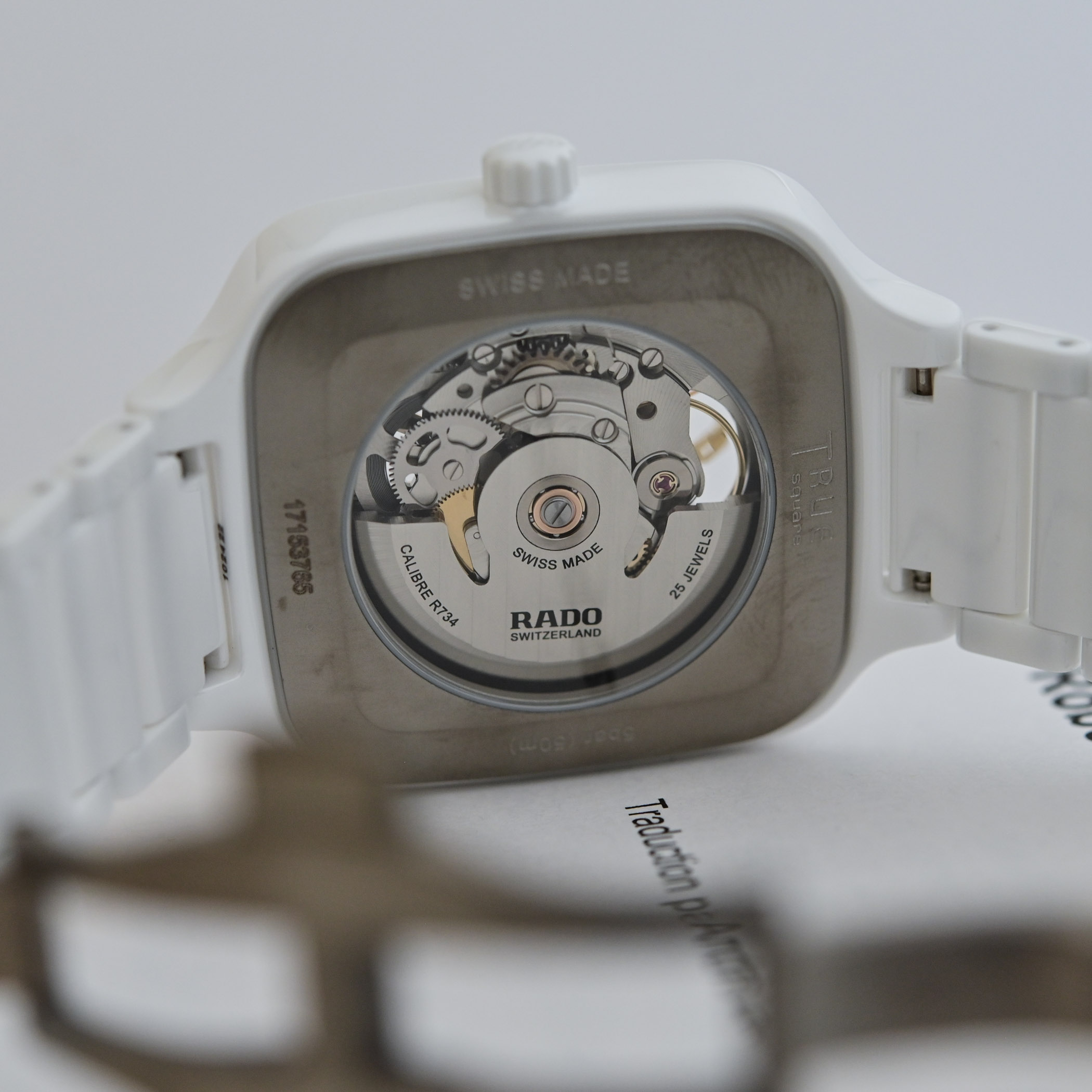 The Rado calibre R734 skeletonised automatic movement (ETA C07.611 / Powermatic 80 base) has a Rado-branded rotor, a frequency of 21,600vph, a magnetic-resistant Nivachron hairspring and a robust 80-hour power reserve.