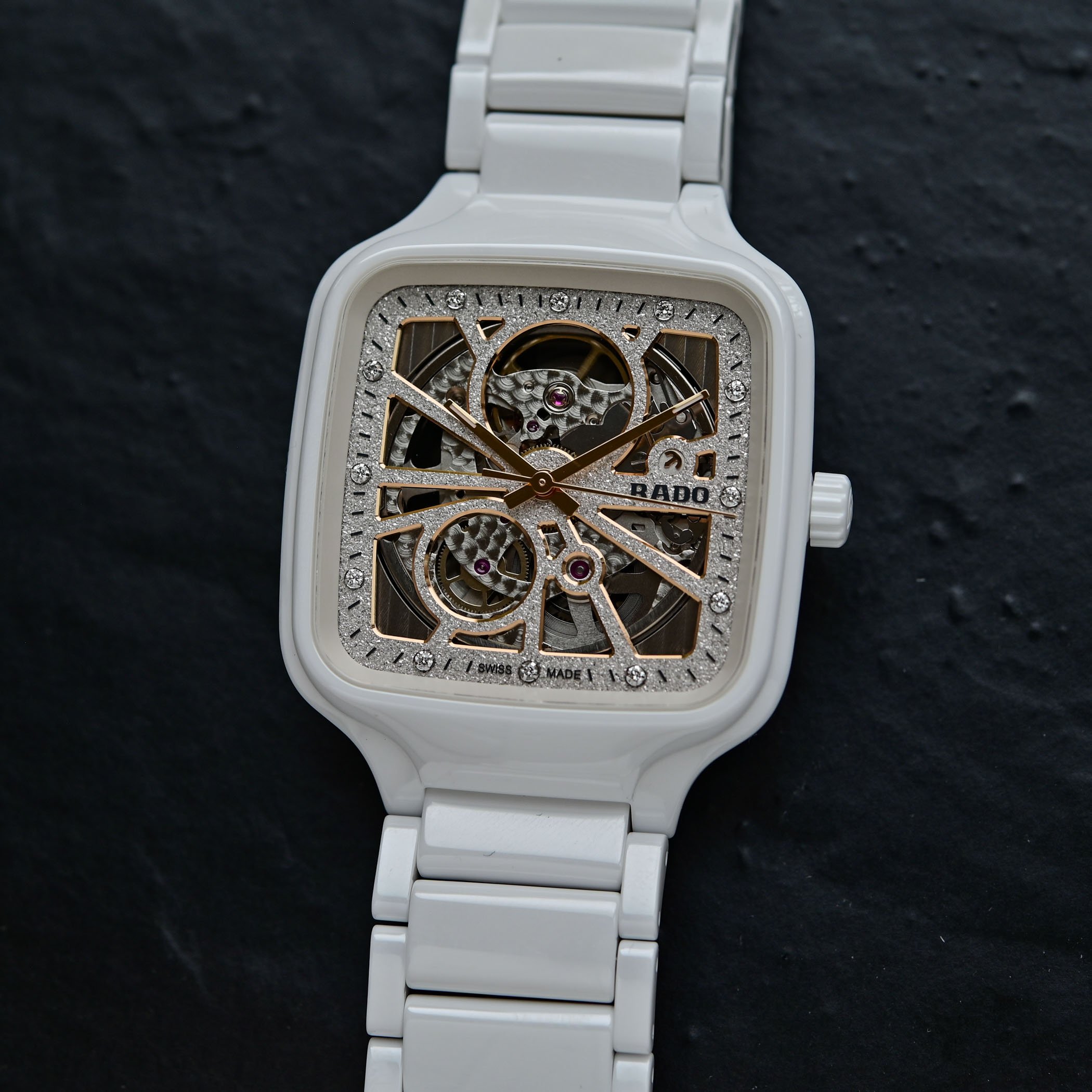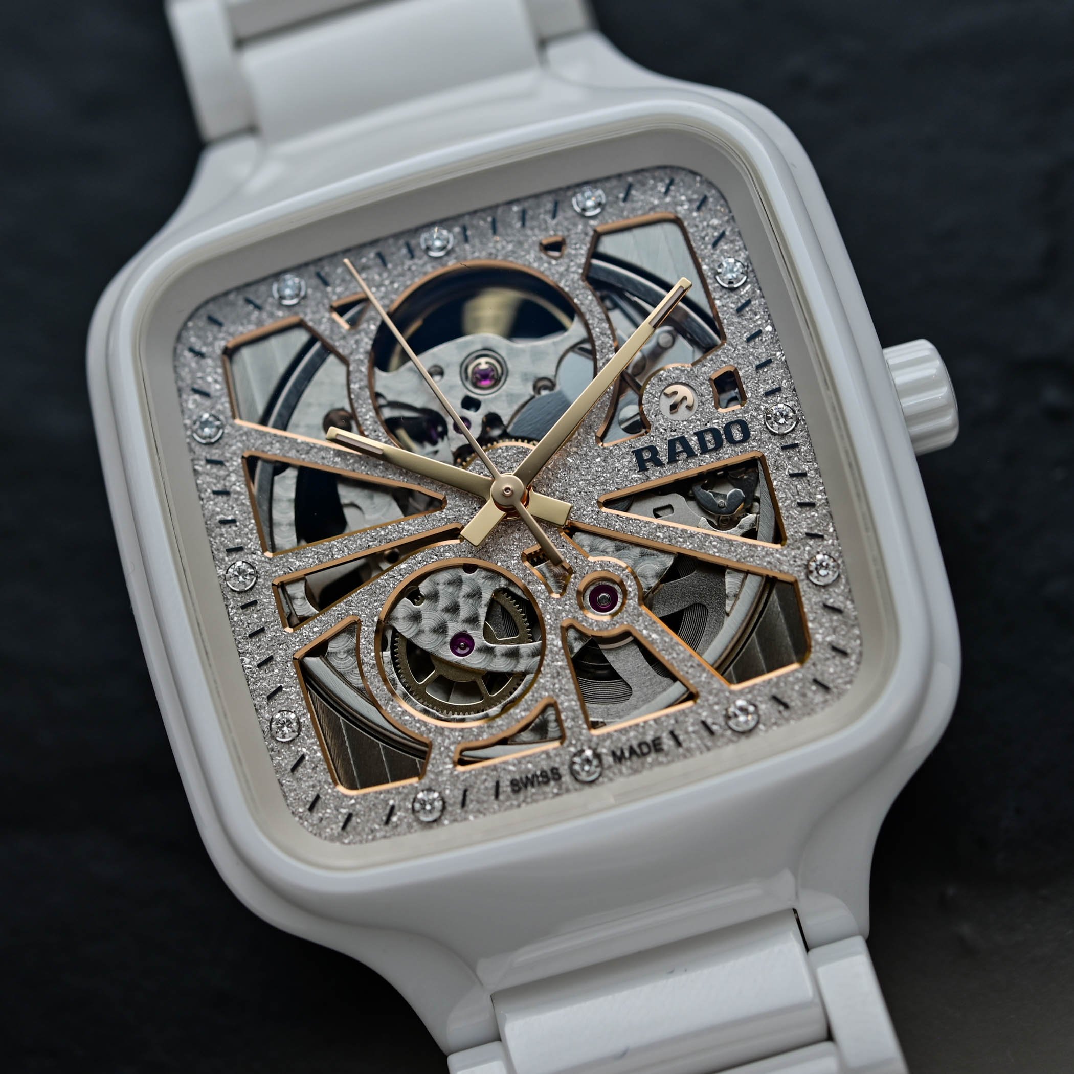 Protected by a sapphire crystal, the square cut-away dial is divided into four areas intersected by lines and two circles framing the balance wheel at noon and parts of the gear train at 7 o’clock. The white ceramic version is combined with rose gold-coloured elements, including the hands, the Rado moving anchor logo at 3 o’clock and the internal frame of the openworked dial. Matching its darker, metallic personality, the plasma model plays with yellow gold-coloured elements. The silvery bridges over the movement are decorated with perlage, and the four corners of the dial feature vertical Côtes de Genève finishing. To assist legibility, the slim hour and minute hands have a strip of white Super-LumiNova at their tips.
