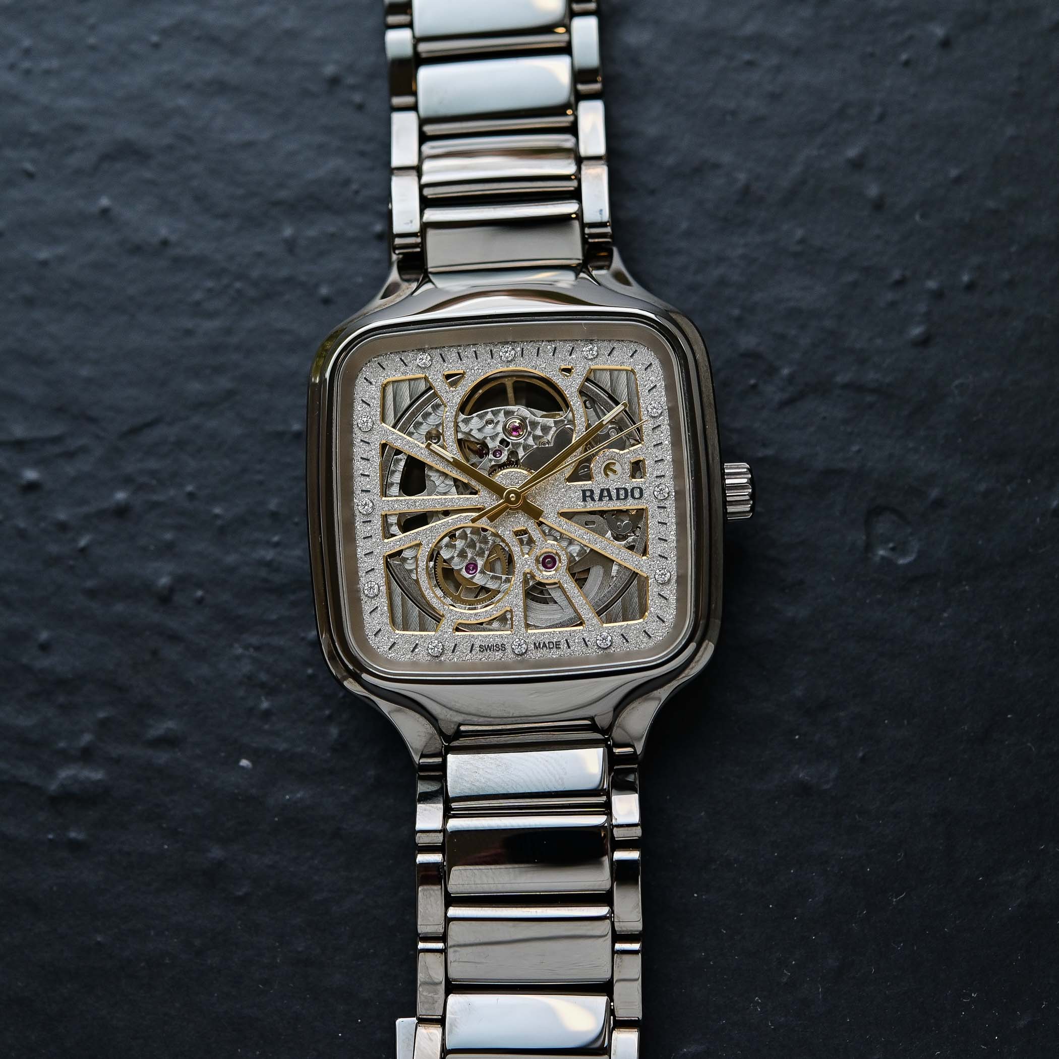 As a pioneer in the development of innovative, ultra-resilient, scratch-resistant materials, starting with the DiaStar of 1962, Rado knows a thing or two about developing novel materials. The dials of the new watches are treated to a unique electroplating process producing a uniform diamond-powder effect. Applied to the openworked bridges and flange placed over the movement, the surfaces glisten and sparkle like freshly fallen snow. It’s worth mentioning, though, that the scintillating textured surface is not a bright white colour but a more discreet soft grey tone. The flange also sparkles with the light of 12 diamond hour markers.