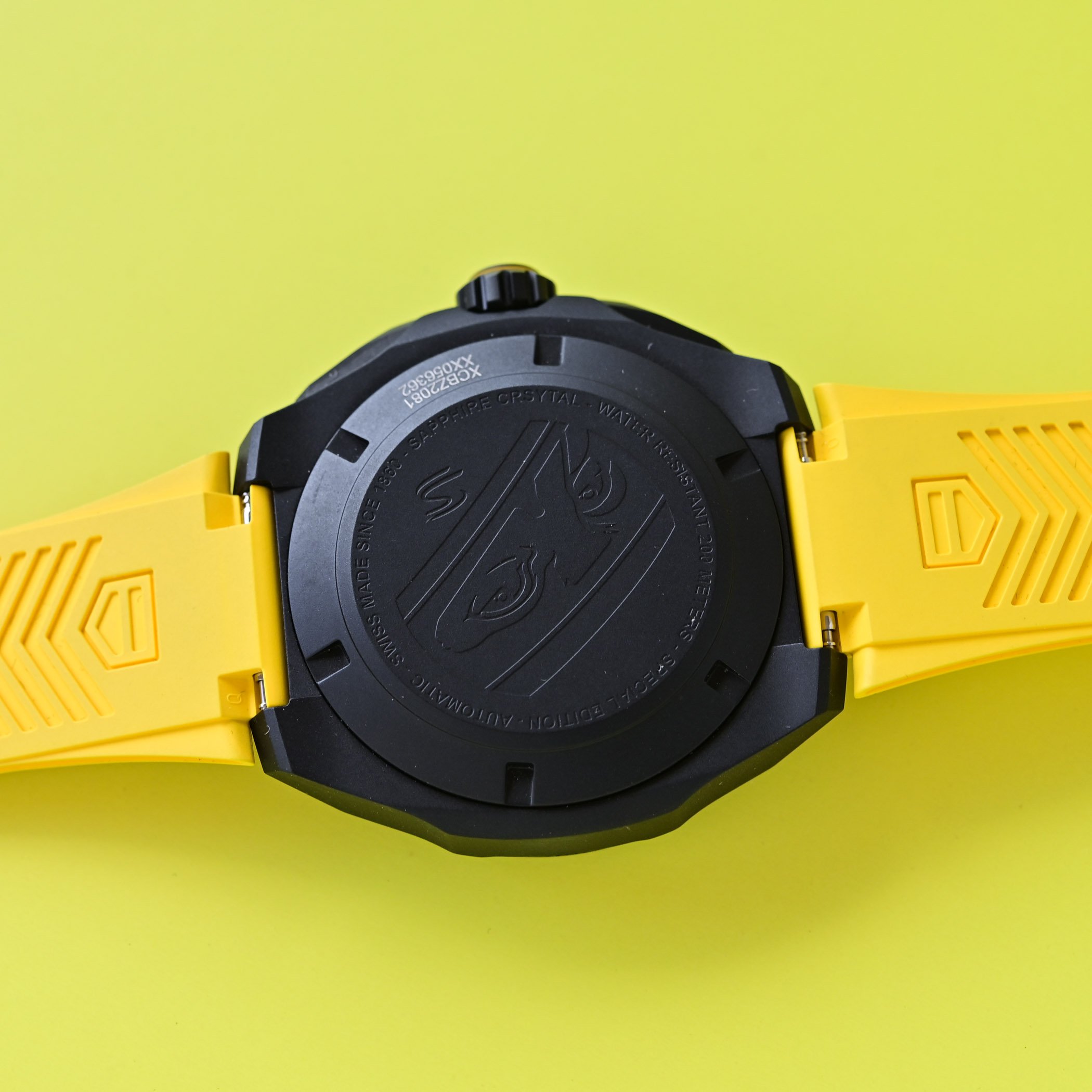 Purposeful and light, the sandblasted Grade 2 titanium case of the new TAG Heuer Formula 1 Chronograph x Senna 44mm gets a full black DLC treatment and 200m water-resistance, like the rest of the series. A forged-carbon tachymeter bezel, engraved with Senna’s signature “S” at 12 o’clock, floats over a yellow separation ring that visually “decouples” the bezel from the mid-case. The notched crown and reshaped pushers are DLC-coated for durability, and the yellow-accented crown echoes the dial accents. The engraved caseback shows Senna’s eyes behind the visor: emotive, yes, but it maintains the watch’s solidity.