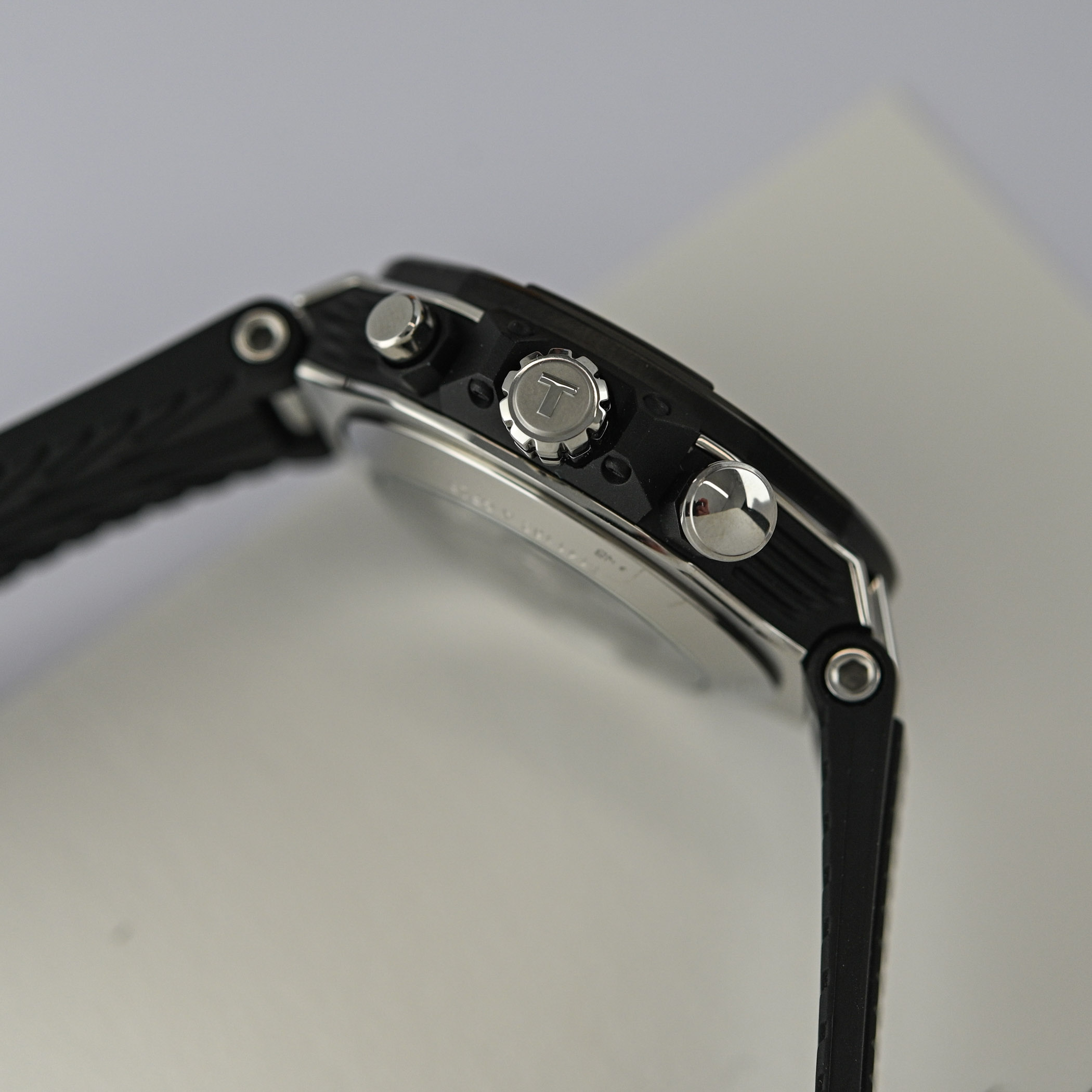 Let’s start with the case, which is almost identical to last year’s edition. The T-Race MotoGP Automatic Chronograph is a bold, sizeable watch. No debate about this. At 45mm in diameter and 14.8mm in thickness, it packs a punch and makes an impact on the wrist. It’s not only the dimensions that are bold; it’s also the shape. The case is constructed with a multi-level architecture, as an uncoated steel bezel and back frames a black PVD-coated middle case – the latter is striped, replicating the cooling fins on an engine. The bezel, again black PVD-coated, mirrors the details of a brake disc with its slots and 6 functional screws.
