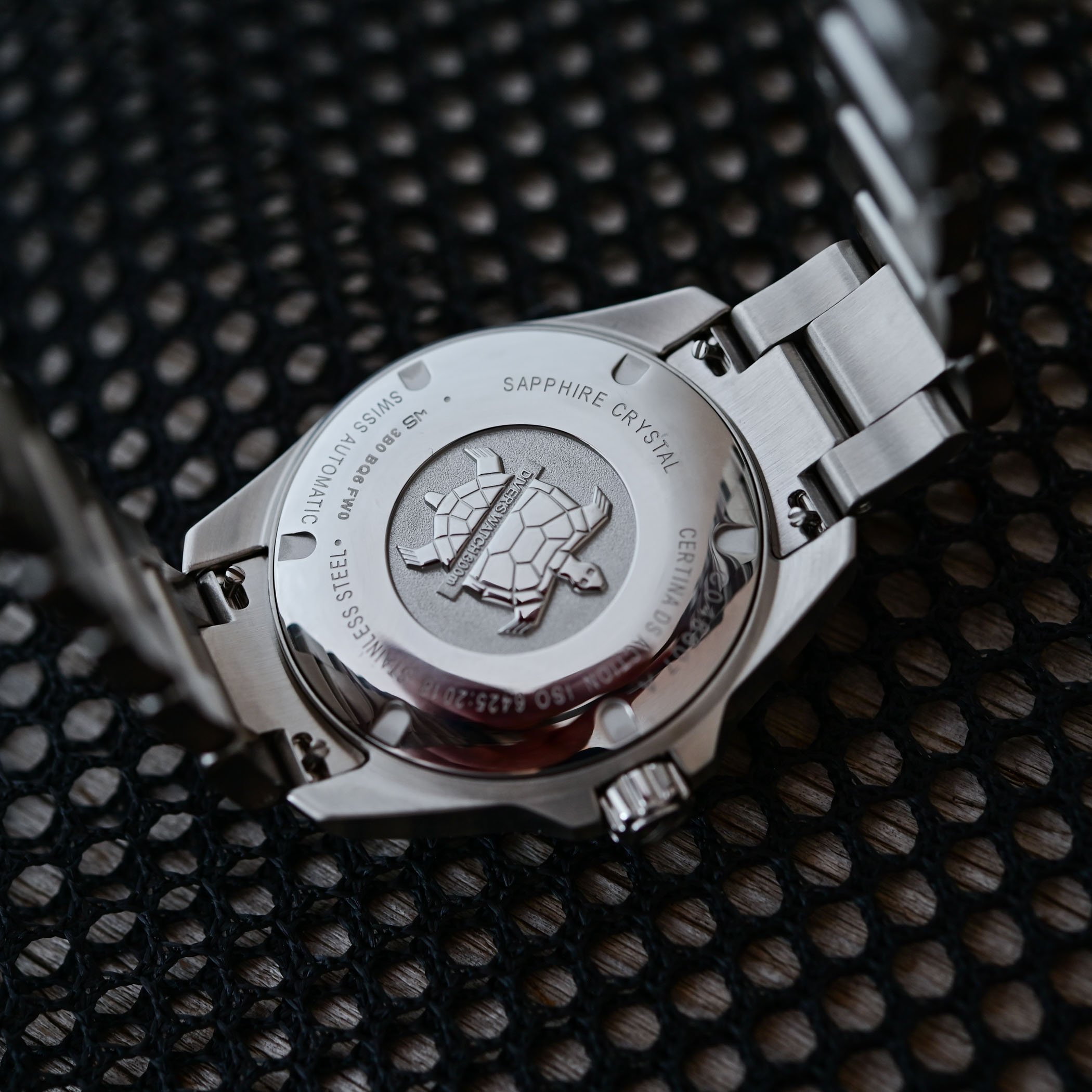 Hidden beneath the sealed caseback with the turtle logo is the reliable, robust and powerful Powermatic 80, Swatch Group’s automatic tractor with an antimagnetic Nivachron balance spring and an 80-hour power reserve.