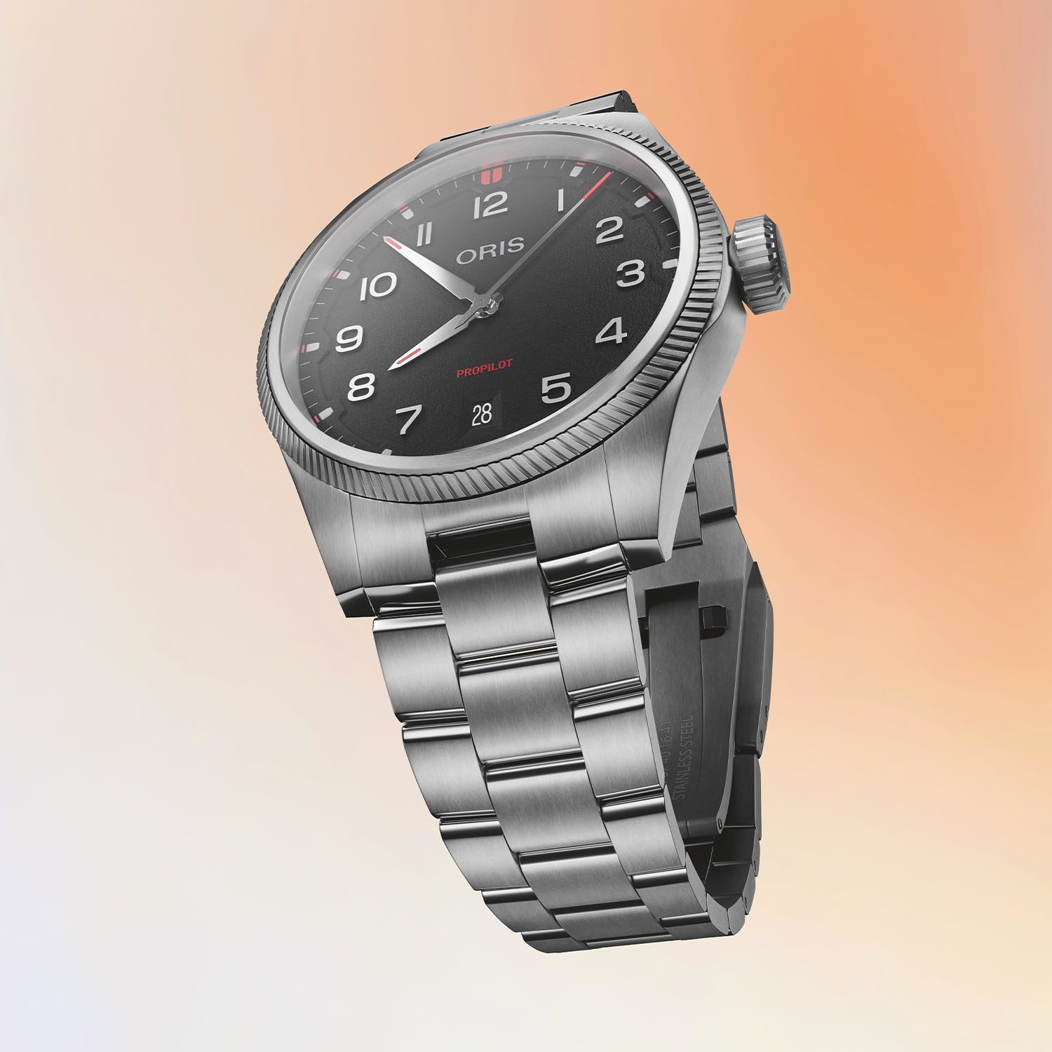 Oris offers the ProPilot Date with a multi-piece stainless steel bracelet finished to match the case, closed with the brand’s updated LIFT folding clasp, now chamfered to echo the case lines, or on a suede leather strap that features a seamless-fit adjustment. Availability begins in November; retail pricing is CHF 2,150 for the metal bracelet and CHF 1,950 for the suede strap. For more, visit oris.ch.