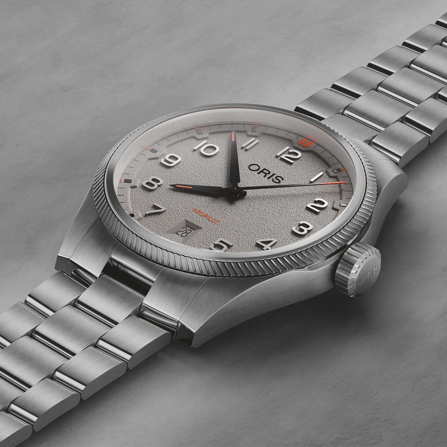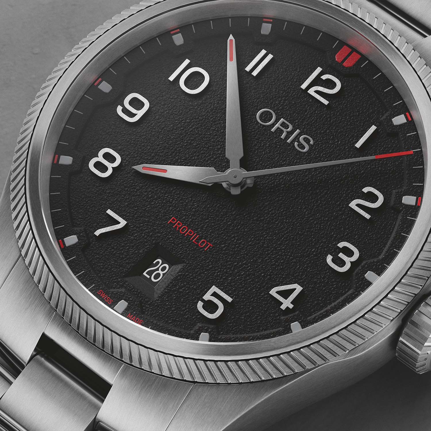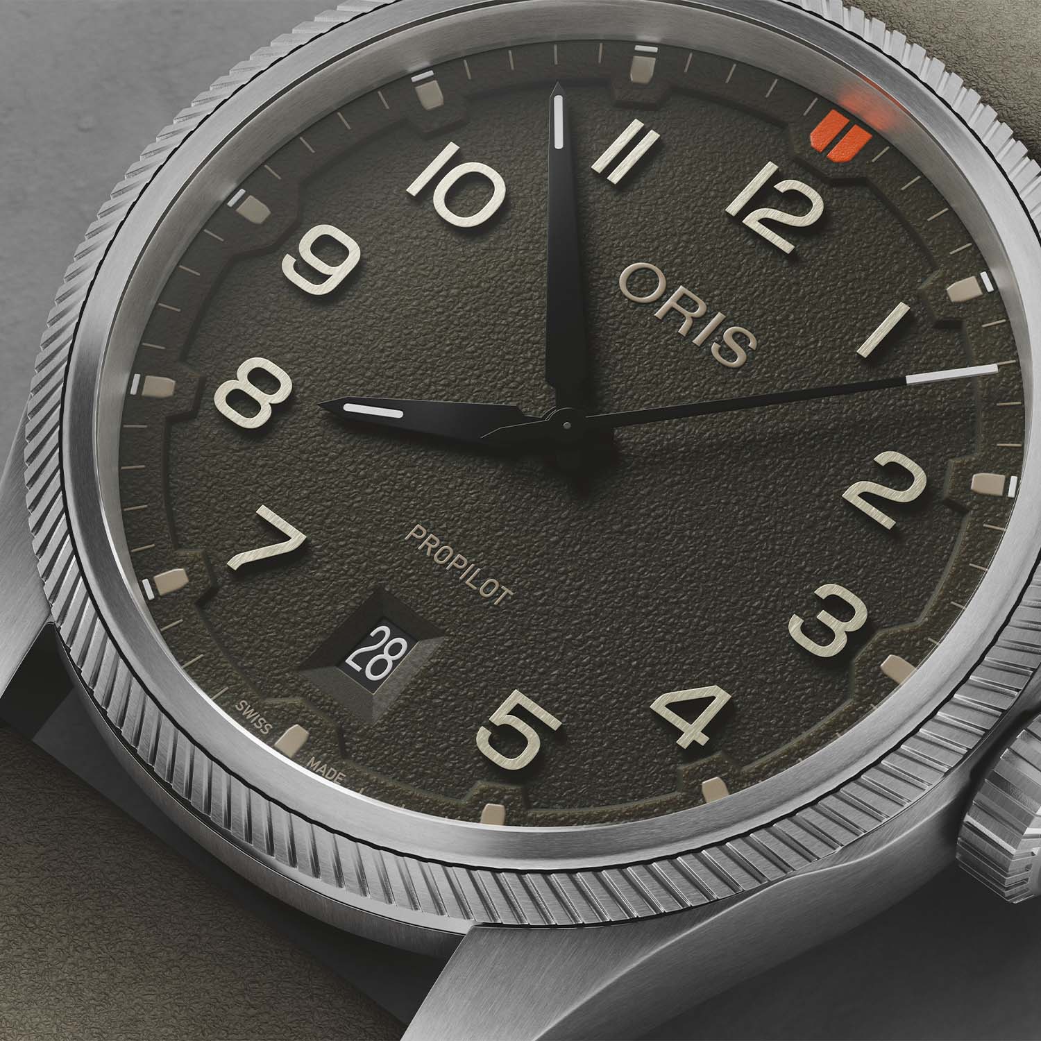 For the updated ProPilot Date, Oris simplified the dial colours and amplified the texture. Three options, black, chalk and moss, use a subtle, natural texture pattern that reduces glare and lends the dial an instrument-like presence. Arabic numerals are applied and brushed, hands are red, white or orange-tipped, depending on the dial option. A narrow raised dial ring and revised minute track tidy the layout, and the date window sits at 6. Super-LumiNova on hands and indices ensures nighttime legibility appropriate for an aviation watch.